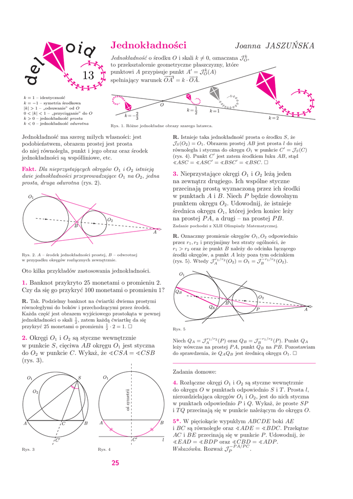 Joanna JASZUŃSKA Jednokładności Jednokładność o środku O i skali k 6= 0, oznaczana JOk , to przekształcenie geometryczne płaszczyzny, które punktowi A przypisuje punkt A′ = JOk (A) −−→ −→ spełniający warunek OA′ = k · OA. 13 k = 1 – identyczność k = −1 – symetria środkowa |k| > 1 – „odsuwanie” od O 0 < |k| < 1 – „przyciąganie” do O k > 0 – jednokładność prosta k < 0 – jednokładność odwrotna Rys. 1. Różne jednokładne obrazy szarego latawca. Jednokładność ma szereg miłych własności: jest podobieństwem, obrazem prostej jest prosta do niej równoległa, punkt i jego obraz oraz środek jednokładności są współliniowe, etc. Fakt. Dla nieprzystających okręgów O1 i O2 istnieją dwie jednokładności przeprowadzające O1 na O2 , jedna prosta, druga odwrotna (rys. 2). R. Istnieje taka jednokładność prosta o środku S, że JS (O2 ) = O1 . Obrazem prostej AB jest prosta l do niej równoległa i styczna do okręgu O1 w punkcie C ′ = JS (C) (rys. 4). Punkt C ′ jest zatem środkiem łuku AB, stąd ) ASC = < ) ASC ′ = < ) BSC ′ = < ) BSC. < 3. Nieprzystające okręgi O1 i O2 leżą jeden na zewnątrz drugiego. Ich wspólne styczne przecinają prostą wyznaczoną przez ich środki w punktach A i B. Niech P będzie dowolnym punktem okręgu O2 . Udowodnij, że istnieje średnica okręgu O1 , której jeden koniec leży na prostej P A, a drugi – na prostej P B. Zadanie pochodzi z XLII Olimpiady Matematycznej. Rys. 2. A – środek jednokładności prostej, B – odwrotnej w przypadku okręgów rozłącznych zewnętrznie. R. Oznaczmy promienie okręgów O1 , O2 odpowiednio przez r1 , r2 i przyjmijmy bez straty ogólności, że r1 > r2 oraz że punkt B należy do odcinka łączącego środki okręgów, a punkt A leży poza tym odcinkiem r /r −r /r (rys. 5). Wtedy JA1 2 (O2 ) = O1 = JB 1 2 (O2 ). Oto kilka przykładów zastosowania jednokładności. 1. Banknot przykryto 25 monetami o promieniu 2. Czy da się go przykryć 100 monetami o promieniu 1? R. Tak. Podzielmy banknot na ćwiartki dwiema prostymi równoległymi do boków i przechodzącymi przez środek. Każda część jest obrazem wyjściowego prostokąta w pewnej jednokładności o skali 21 , zatem każdą ćwiartkę da się przykryć 25 monetami o promieniu 12 · 2 = 1. 2. Okręgi O1 i O2 są styczne wewnętrznie w punkcie S, cięciwa AB okręgu O1 jest styczna do O2 w punkcie C. Wykaż, że <) CSA = <) CSB (rys. 3). Rys. 5 r /r −r /r Niech QA = JA1 2 (P ) oraz QB = JB 1 2 (P ). Punkt QA leży wówczas na prostej P A, punkt QB na P B. Pozostawiam do sprawdzenia, że QA QB jest średnicą okręgu O1 . Zadania domowe: 4. Rozłączne okręgi O1 i O2 są styczne wewnętrznie do okręgu O w punktach odpowiednio S i T . Prosta l, nierozdzielająca okręgów O1 i O2 , jest do nich styczna w punktach odpowiednio P i Q. Wykaż, że proste SP i T Q przecinają się w punkcie należącym do okręgu O. Rys. 3 5*. W pięciokącie wypukłym ABCDE boki AE i BC są równoległe oraz <) ADE = <) BDC. Przekątne AC i BE przecinają się w punkcie P . Udowodnij, że <) EAD = <) BDP oraz <) CBD = <) ADP . −P A/P C . Wskazówka. Rozważ JP Rys. 4 25