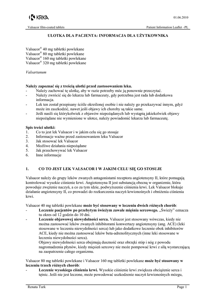 01.06.2010 Valsacor film-coated tablets Patient Information Leaflet –PL ULOTKA DLA PACJENTA: INFORMACJA DLA UŻYTKOWNIKA Valsacor® 40 mg tabletki powlekane Valsacor® 80 mg tabletki powlekane Valsacor® 160 mg tabletki powlekane Valsacor® 320 mg tabletki powlekane Valsartanum Należy zapoznać się z treścią ulotki przed zastosowaniem leku. Należy zachować tę ulotkę, aby w razie potrzeby móc ją ponownie przeczytać. Należy zwrócić się do lekarza lub farmaceuty, gdy potrzebna jest rada lub dodatkowa informacja. Lek ten został przepisany ściśle określonej osobie i nie należy go przekazywać innym, gdyż może im zaszkodzić, nawet jeśli objawy ich choroby są takie same. Jeśli nasili się którykolwiek z objawów niepożądanych lub wystąpią jakiekolwiek objawy niepożądane nie wymienione w ulotce, należy powiadomić lekarza lub farmaceutę. Spis treści ulotki: 1. Co to jest lek Valsacor i w jakim celu się go stosuje 2. Informacje ważne przed zastosowaniem leku Valsacor 3. Jak stosować lek Valsacor 4. Możliwe działania niepożądane 5. Jak przechowywać lek Valsacor 6. Inne informacje 1. CO TO JEST LEK VALSACOR I W JAKIM CELU SIĘ GO STOSUJE Valsacor należy do grupy leków zwanych antagonistami receptora angiotensyny II, które pomagają kontrolować wysokie ciśnienie krwi. Angiotensyna II jest substancją obecną w organizmie, która powoduje zwężenie naczyń, a co za tym idzie, podwyższenie ciśnienia krwi. Lek Valsacor blokuje działanie angiotensyny II, co prowadzi do rozkurczenia naczyń krwionośnych i obniżenia ciśnienia krwi. Valsacor 40 mg tabletki powlekane może być stosowany w leczeniu dwóch różnych chorób: Leczenie pacjentów po przebytym świeżym zawale mięśnia sercowego. „Świeży” oznacza tu okres od 12 godzin do 10 dni. Leczenie objawowej niewydolności serca. Valsacor jest stosowany wówczas, kiedy nie można zastosować leków zwanych inhibitorami konwertazy angiotensyny (ang. ACE) (leki stosowane w leczeniu niewydolności serca) lub jako dodatkowe leczenie obok inhibitorów ACE, kiedy nie można zastosować leków beta-adrenolitycznych (inne leki stosowane w leczeniu niewydolności serca). Objawy niewydolności serca obejmują duszność oraz obrzęki stóp i nóg z powodu nagromadzenia płynów, kiedy mięsień sercowy nie może pompować krwi z siłą wystarczającą na zaopatrzenie całego organizmu. Valsacor 80 mg tabletki powlekane i Valsacor 160 mg tabletki powlekane może być stosowany w leczeniu trzech różnych chorób: Leczenie wysokiego ciśnienia krwi. Wysokie ciśnienie krwi zwiększa obciążenie serca i tętnic. Jeśli nie jest leczone, może powodować uszkodzenie naczyń krwionośnych mózgu, Renata Turk Page 1 01.06.2010 Valsacor film-coated tablets Patient Information Leaflet –PL serca i nerek oraz prowadzić do udaru, niewydolności serca lub nerek. Wysokie ciśnienie krwi zwiększa ryzyko zawału serca. Obniżenie ciśnienia krwi do wartości prawidłowych powoduje zmniejszenie ryzyka wystąpienia tych zaburzeń. Leczenie pacjentów po przebytym świeżym zawale mięśnia sercowego. „Świeży” oznacza tu okres od 12 godzin do 10 dni. Leczenie objawowej niewydolności serca. Valsacor jest stosowany wówczas, kiedy nie można zastosować leków zwanych inhibitorami konwertazy angiotensyny (ang. ACE) (leki stosowane w leczeniu niewydolności serca) lub jako dodatkowe leczenie obok inhibitorów ACE, kiedy nie można zastosować leków beta-adrenolitycznych (inne leki stosowane w leczeniu niewydolności serca). Objawy niewydolności serca obejmują duszność oraz obrzęki stóp i nóg z powodu nagromadzenia płynów, kiedy mięsień sercowy nie może pompować krwi z siłą wystarczającą na zaopatrzenie całego organizmu. - Valsacor 320 mg tabletki powlekane może być stosowany w: Leczeniu wysokiego ciśnienia krwi. Wysokie ciśnienie krwi zwiększa obciążenie serca i tętnic. Jeśli nie jest leczone, może powodować uszkodzenie naczyń krwionośnych mózgu, serca i nerek oraz prowadzić do udaru, niewydolności serca lub nerek. Wysokie ciśnienie krwi zwiększa ryzyko zawału serca. Obniżenie ciśnienia krwi do wartości prawidłowych powoduje zmniejszenie ryzyka wystąpienia tych zaburzeń. 2. INFORMACJE WAŻNE PRZED ZASTOSOWANIEM LEKU VALSACOR Kiedy nie zażywać leku Valsacor: jeśli u pacjenta stwierdzono uczulenie (nadwrażliwość) na walsartan lub którykolwiek z pozostałych składników leku Valsacor; w przypadku ciężkiej choroby wątroby; w ciąży powyżej 3 miesiąca (należy również unikać leku Valsacor we wczesnej ciąży - patrz punkt,,Ciąża i karmienie piersią’’). Jeśli którakolwiek z powyższych sytuacji dotyczy pacjenta, nie należy przyjmować leku Valsacor. Kiedy zachować szczególną ostrożność stosując lek Valsacor: jeśli u pacjenta stwierdzono chorobę wątroby; jeśli u pacjenta stwierdzono ciężką chorobę nerek lub pacjent poddawany jest dializom; u pacjentów ze zwężeniem tętnicy nerkowej; u pacjentów po niedawno przebytej transplantacji nerki (przeszczep nowej nerki); u pacjentów leczonych po przebytym zawale serca lub z powodu niewydolności serca, lekarz może zbadać czynność nerek pacjenta; u pacjentów z ciężką chorobą serca inną niż niewydolność serca lub zawał serca; u pacjentów stosujących leki zwiększające stężenie potasu we krwi, takie jak: suplementy potasu lub zamienniki soli zawierające potas, leki oszczędzające potas i heparyna. Może zaistnieć konieczność okresowego sprawdzania stężenia potasu we krwi; u pacjentów z aldosteronizmem. Jest to choroba, w której nadnercza produkują zbyt duże ilości hormonu zwanego aldosteronem. Nie zaleca się stosowania leku Valsacor u pacjentów z aldosteronizmem; u pacjentów, u których doszło do utraty dużej ilości płynów (odwodnienie) z powodu biegunki, wymiotów lub dużych dawek leków moczopędnych (diuretyków); nie zaleca się stosowania leku V