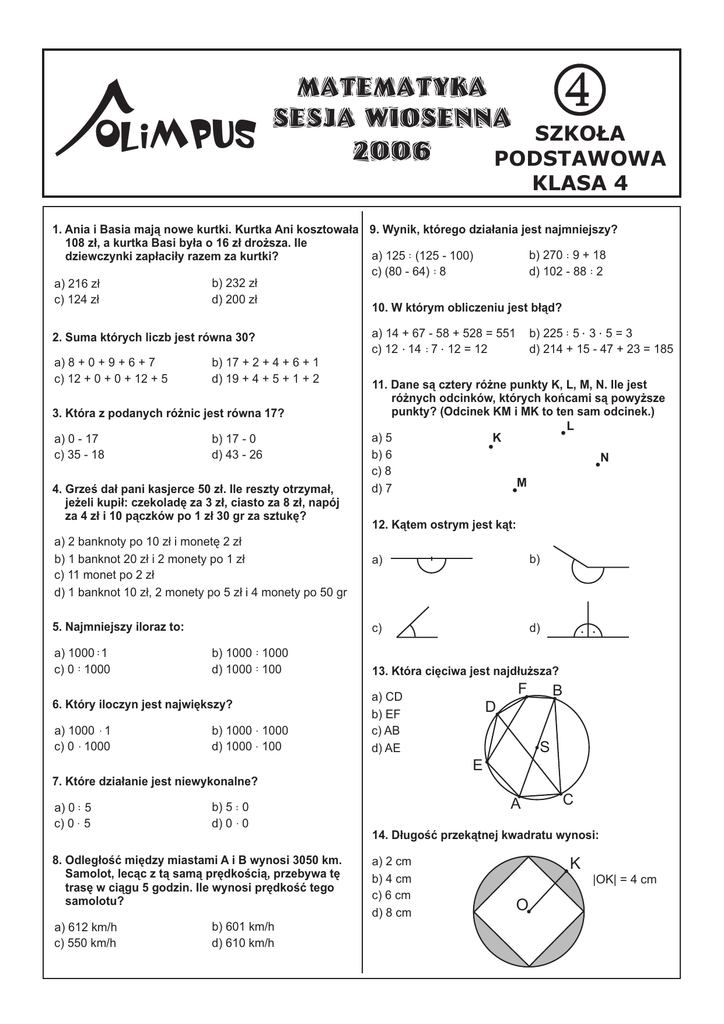P OLIMPUS MATEMATYKA SESJA WIOSENNA SZKOLA 2006 PODSTAWOWA KLASA 4 1. Ania i Basia maj¹ nowe kurtki. Kurtka Ani kosztowa³a 9. Wynik, którego dzia³ania jest najmniejszy? 108 z³, a kurtka Basi by³a o 16 z³ dro¿sza. Ile b) 270 9 + 18 a) 125 (125 - 100) dziewczynki zap³aci³y razem za kurtki? c) (80 - 64) 8 d) 102 - 88 2 b) 232 z³ a) 216 z³ c) 124 z³ d) 200 z³ 10. W którym obliczeniu jest b³¹d? 2. Suma których liczb jest równa 30? a) 8 + 0 + 9 + 6 + 7 c) 12 + 0 + 0 + 12 + 5 b) 17 + 2 + 4 + 6 + 1 d) 19 + 4 + 5 + 1 + 2 3. Która z podanych ró¿nic jest równa 17? a) 0 - 17 c) 35 - 18 b) 17 - 0 d) 43 - 26 4. Grzeœ da³ pani kasjerce 50 z³. Ile reszty otrzyma³, je¿eli kupi³: czekoladê za 3 z³, ciasto za 8 z³, napój za 4 z³ i 10 p¹czków po 1 z³ 30 gr za sztukê? a) 2 banknoty po 10 z³ i monetê 2 z³ b) 1 banknot 20 z³ i 2 monety po 1 z³ c) 11 monet po 2 z³ d) 1 banknot 10 z³, 2 monety po 5 z³ i 4 monety po 50 gr 5. Najmniejszy iloraz to: a) 1000 1 c) 0 1000 b) 1000 1000 d) 1000 100 6. Który iloczyn jest najwiêkszy? a) 1000 1 c) 0 1000 b) 1000 1000 d) 1000 100 b) 225 5 3 5 = 3 d) 214 + 15 - 47 + 23 = 185 a) 14 + 67 - 58 + 528 = 551 c) 12 14 7 12 = 12 11. Dane s¹ cztery ró¿ne punkty K, L, M, N. Ile jest ró¿nych odcinków, których koñcami s¹ powy¿sze punkty? (Odcinek KM i MK to ten sam odcinek.) L a) 5 K b) 6 N c) 8 M d) 7 12. K¹tem ostrym jest k¹t: a) b) c) d) 13. Która ciêciwa jest najd³u¿sza? F a) CD b) EF c) AB d) AE B D S E 7. Które dzia³anie jest niewykonalne? a) 0 5 c) 0 5 A b) 5 0 d) 0 0 C 14. D³ugoœæ przek¹tnej kwadratu wynosi: 8. Odleg³oœæ miêdzy miastami A i B wynosi 3050 km. Samolot, lec¹c z t¹ sam¹ prêdkoœci¹, przebywa tê trasê w ci¹gu 5 godzin. Ile wynosi prêdkoœæ tego samolotu? a) 612 km/h c) 550 km/h b) 601 km/h d) 610 km/h a) 2 cm b) 4 cm c) 6 cm d) 8 cm K |OK| = 4 cm O 1 15. Dzia³ka ma kszta³t kwadratu o powierzchni 16 arów. 24. Waga brutto wynosi 16 kg, waga netto 14 4 kg. Ile wynosi tara? Ile siatki potrzeba na ogrodzenie dzia³ki, je¿eli brama i furtka maj¹ razem 4 m? 1 3 b) 2 kg a) 2 kg 4 4 b) 196 m a) 204 m d) 156 m c) 164 m c) 1 3 kg d) 1 1 kg 4 4 16. W przetwórni owoców rozlano sok do butelek. Butelki z sokiem pakowano do skrzynek po 30 butelek do jednej. Ile skrzynek potrzeba do zapakowania 808 butelek? b) 30 d) 25 a) 27 c) 26 17. Reszt¹ z dzielenia 745831 : 4 jest: b) 1 d) 3 a) 0 c) 2 b) 22 d) 7 1 7 = 3 3 c) 10 1 101 = 10 10 a) 4 18 = 5 5 17 1 =8 2 4 20. U³amkiem wiêkszym od liczby 3 jest u³amek: a) 15 15 b) 60 15 c) 35 15 d) 100 15 21. O której godzinie wskazówki zegara tworz¹ k¹t prosty? a) 900 c) 1200 b) 15 d) 300 00 22. Jaœ w 2000 roku mia³ 3 lata. W którym roku urodzi³ siê Jaœ? a) MMVII c) MCMXCVII b) MCMCXVII d) MCMXVII 23. Prawd¹ jest, ¿e: a) obwód prostok¹ta, to suma d³ugoœci jego boków b) ka¿dy kwadrat jest prostok¹tem c) 1 1 > 2 3 d) 2 5 < 9 9 a) 1 3 12 5 8 c) 7 8 b) 3 d) ( 26. Wynikiem dzia³ania 3 7 1 11 + -2 jest: 12 12 12 9 b) 12 ) d) 3 12 27. Ile trzeba dodaæ do u³amka 19. Który zapis jest poprawny? a) 2 b) 6 cm i 8 cm d) 9 cm i 7 cm a) 7 cm i 5 cm c) 10 cm i 8 cm c) 1 9 12 18. Dzielnikiem liczby 84 jest: a) 4 c) 21 25. Obwód prostok¹ta wynosi 28 cm. D³ugoœæ jest o 2 cm krótsza od szerokoœci. Wymiary prostok¹ta to: b) 5 , aby otrzymaæ 1? 8 3 8 d) 13 8 28. D³ugoœæ odcinka w skali 5:1 wynosi 65 cm. Ile bêdzie wynosi³a d³ugoœæ tego odcinka w skali 1:1? a) 325 cm c) 13 cm b) 32 cm 5 mm d) 16 cm 1 29. Agnieszka kupi³a 28 zeszytów. podarowa³a 4 1 Grzesiowi, a Mateuszowi. Ile zeszytów zosta³o 7 Agnieszce? a) 11 c) 14 b) 17 d) 8 30. Aby liczba 45 6 by³a podzielna przez 9, w wolne miejsce nale¿y wpisaæ cyfrê: a) 0 c) 3 b) 2 d) 5