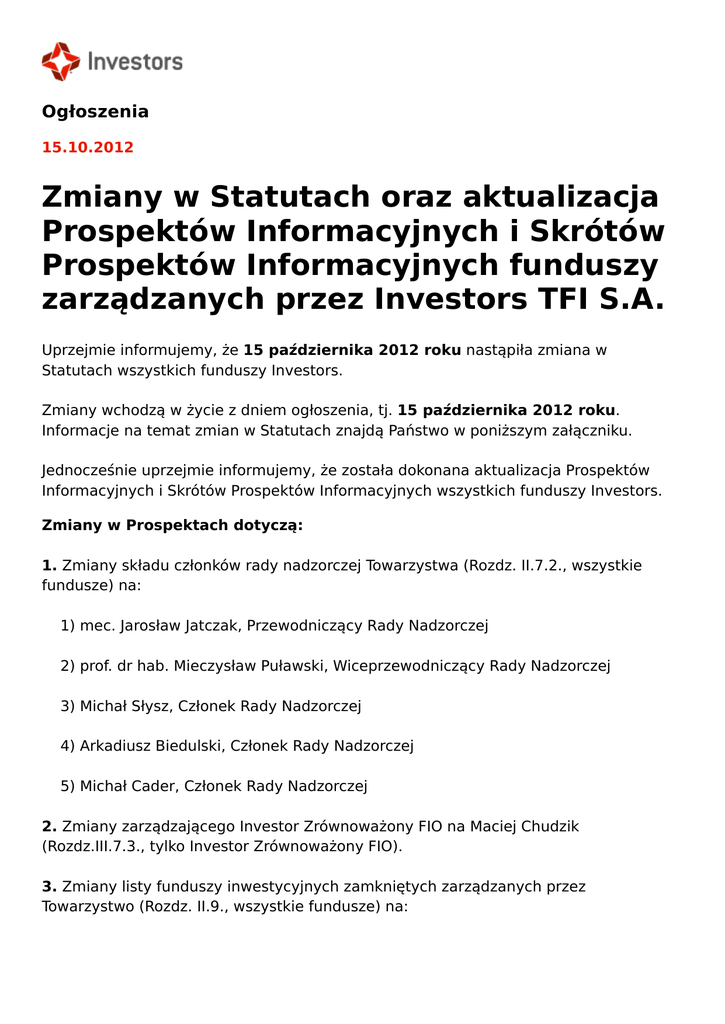 Ogłoszenia 15.10.2012 Zmiany w Statutach oraz aktualizacja Prospektów Informacyjnych i Skrótów Prospektów Informacyjnych funduszy zarządzanych przez Investors TFI S.A. Uprzejmie informujemy, że 15 października 2012 roku nastąpiła zmiana w Statutach wszystkich funduszy Investors. Zmiany wchodzą w życie z dniem ogłoszenia, tj. 15 października 2012 roku. Informacje na temat zmian w Statutach znajdą Państwo w poniższym załączniku. Jednocześnie uprzejmie informujemy, że została dokonana aktualizacja Prospektów Informacyjnych i Skrótów Prospektów Informacyjnych wszystkich funduszy Investors. Zmiany w Prospektach dotyczą: 1. Zmiany składu członków rady nadzorczej Towarzystwa (Rozdz. II.7.2., wszystkie fundusze) na: 1) mec. Jarosław Jatczak, Przewodniczący Rady Nadzorczej 2) prof. dr hab. Mieczysław Puławski, Wiceprzewodniczący Rady Nadzorczej 3) Michał Słysz, Członek Rady Nadzorczej 4) Arkadiusz Biedulski, Członek Rady Nadzorczej 5) Michał Cader, Członek Rady Nadzorczej 2. Zmiany zarządzającego Investor Zrównoważony FIO na Maciej Chudzik (Rozdz.III.7.3., tylko Investor Zrównoważony FIO). 3. Zmiany listy funduszy inwestycyjnych zamkniętych zarządzanych przez Towarzystwo (Rozdz. II.9., wszystkie fundusze) na: Fundusze Inwestycje Zamknięte: 1) Investor Fundusz Inwestycyjny Zamknięty 2) Investor Gold Fundusz Inwestycyjny Zamknięty 3) Investor Private Equity Fundusz Inwestycyjny Zamknięty Aktywów Niepublicznych 4) Investor Central And Eastern Europe Fundusz Inwestycyjny Zamknięty 5) Investor Property Fundusz Inwestycyjny Zamknięty Aktywów Niepublicznych 6) Wratislavia Real Estate Fundusz Inwestycyjny Zamknięty Aktywów Niepublicznych 7) Investor ZEN Fundusz Inwestycyjny Zamknięty 8) Private Investor I Fundusz Inwestycyjny Zamknięty Aktywów Niepublicznych 9) Investor Papierów Dłużnych Fundusz Inwestycyjny Zamknięty Aktywów Niepublicznych 10) Private Investor III Fundusz Inwestycyjny Zamknięty Aktywów Niepublicznych 11) Arteria Operacje Fundusz Inwestycyjny Zamknięty Aktywów Niepublicznych 12) Investor Absolute Return Fundusz Inwestycyjny Zamknięty 13) Investor Algorytminczy Fundusz Inwestycyjny Zamknięty 14) Investor BEKaP Fundusz Inwestycyjny Zamknięty Aktywów Niepublicznych 15) Private Investor II Fundusz Inwestycyjny Zamknięty Aktywów Niepublicznych 16) Investor Globalnej Alokacji Fundusz Inwestycyjny Zamknięty 17) Private Investor IV Fundusz Inwestycyjny Zamknięty Aktywów Niepublicznych 18) Private Investor V Fundusz Inwestycyjny Zamknięty Aktywów Niepublicznych 19) Private Investor VI Fundusz Inwestycyjny Zamknięty Aktywów Niepublicznych 4. Aktualizacji treści rozdziałów: III.6.1.1., III.6.2. i V.2., wynikającej ze zmian w Statutach - usunięcie informacji o Investor Phone (wszystkie fundusze). 5. Zmian w rozdziale V.2. – usunięcie dystrybutora Mazowiecki Bank Regionalny S.A. oraz dodanie dystrybutora Profitum Sp. z o.o. (wszystkie fundusze). Zmiany w Skrótach Prospektów dotyczą: 1. Aktualizacji treści rozdziałów: I.11.1.1. oraz I.11.2., wynikającej ze zmian w Statutach - usunięcie informacji o Investor Phone (wszystkie fundusze oprócz Investor Parasol SFIO). 2. Aktualizacji treści rozdziału: I.5.1.1. oraz I.5.2., wynikającej ze zmian w Statutach usunięcie informacji o Investor Phone (tylko Investor Parasol SFIO). Zaktualizowane Prospekty Informacyjne i Skróty Prospektów Informacyjnych funduszy Investors zostały zamieszczone na stronie investors.pl