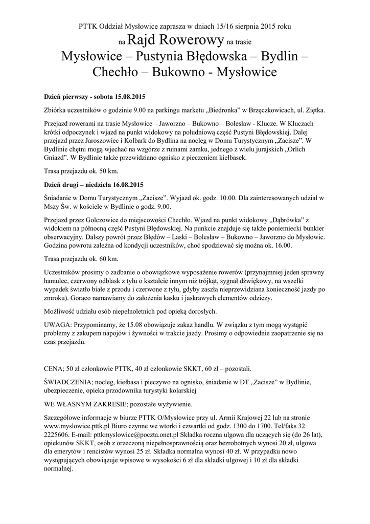 PTTK Oddział Mysłowice zaprasza w dniach 15/16 sierpnia 2015 roku na Rajd Rowerowy na trasie Mysłowice – Pustynia Błędowska – Bydlin – Chechło – Bukowno - Mysłowice Dzień pierwszy - sobota 15.08.2015 Zbiórka uczestników o godzinie 9.00 na parkingu marketu „Biedronka” w Brzęczkowicach, ul. Ziętka. Przejazd rowerami na trasie Mysłowice – Jaworzno – Bukowno – Bolesław - Klucze. W Kluczach krótki odpoczynek i wjazd na punkt widokowy na południową część Pustyni Błędowskiej. Dalej przejazd przez Jaroszowiec i Kolbark do Bydlina na nocleg w Domu Turystycznym „Zacisze”. W Bydlinie chętni mogą wjechać na wzgórze z ruinami zamku, jednego z wielu jurajskich „Orlich Gniazd”. W Bydlinie także przewidziano ognisko z pieczeniem kiełbasek. Trasa przejazdu ok. 50 km. Dzień drugi – niedziela 16.08.2015 Śniadanie w Domu Turystycznym „Zacisze”. Wyjazd ok. godz. 10.00. Dla zainteresowanych udział w Mszy Św. w kościele w Bydlinie o godz. 9.00. Przejazd przez Golczowice do miejscowości Chechło. Wjazd na punkt widokowy „Dąbrówka” z widokiem na północną część Pustyni Błędowskiej. Na punkcie znajduje się także poniemiecki bunkier obserwacyjny. Dalszy powrót przez Błędów – Laski – Bolesław – Bukowno – Jaworzno do Mysłowic. Godzina powrotu zależna od kondycji uczestników, choć spodziewać się można ok. 16.00. Trasa przejazdu ok. 60 km. Uczestników prosimy o zadbanie o obowiązkowe wyposażenie rowerów (przynajmniej jeden sprawny hamulec, czerwony odblask z tyłu o kształcie innym niż trójkąt, sygnał dźwiękowy, na wszelki wypadek światło białe z przodu i czerwone z tyłu, gdyby zaszła nieprzewidziana konieczność jazdy po zmroku). Gorąco namawiamy do założenia kasku i jaskrawych elementów odzieży. Możliwość udziału osób niepełnoletnich pod opieką dorosłych. UWAGA: Przypominamy, że 15.08 obowiązuje zakaz handlu. W związku z tym mogą wystąpić problemy z zakupem napojów i żywności w trakcie jazdy. Prosimy o odpowiednie zaopatrzenie się na czas przejazdu. CENA; 50 zł członkowie PTTK, 40 zł członkowie SKKT, 60 zł – pozostali. ŚWIADCZENIA; nocleg, kiełbasa i pieczywo na ognisko, śniadanie w DT „Zacisze” w Bydlinie, ubezpieczenie, opieka przodownika turystyki kolarskiej WE WŁASNYM ZAKRESIE; pozostałe wyżywienie. Szczegółowe informacje w biurze PTTK O/Mysłowice przy ul. Armii Krajowej 22 lub na stronie www.myslowice.pttk.pl Biuro czynne we wtorki i czwartki od godz. 1300 do 1700. Tel/faks 32 2225606. E-mail: [email protected] Składka roczna ulgowa dla uczących się (do 26 lat), opiekunów SKKT, osób z orzeczoną niepełnosprawnością oraz bezrobotnych wynosi 20 zł, ulgowa dla emerytów i rencistów wynosi 25 zł. Składka normalna wynosi 40 zł. W przypadku nowo występujących obowiązuje wpisowe w wysokości 6 zł dla składki ulgowej i 10 zł dla składki normalnej.