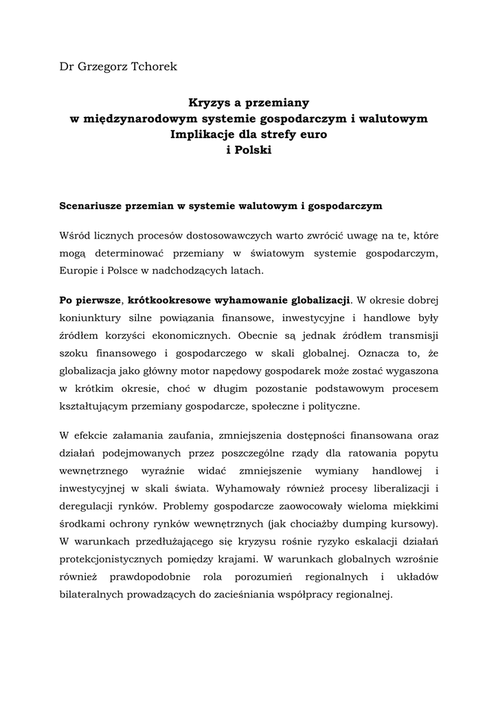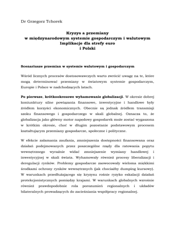 Dr Grzegorz Tchorek Kryzys a przemiany w międzynarodowym systemie gospodarczym i walutowym Implikacje dla strefy euro i Polski Scenariusze przemian w systemie walutowym i gospodarczym Wśród licznych procesów dostosowawczych warto zwrócić uwagę na te, które mogą determinować przemiany w światowym systemie gospodarczym, Europie i Polsce w nadchodzących latach. Po pierwsze, krótkookresowe wyhamowanie globalizacji. W okresie dobrej koniunktury silne powiązania finansowe, inwestycyjne i handlowe były źródłem korzyści ekonomicznych. Obecnie są jednak źródłem transmisji szoku finansowego i gospodarczego w skali globalnej. Oznacza to, że globalizacja jako główny motor napędowy gospodarek może zostać wygaszona w krótkim okresie, choć w długim pozostanie podstawowym procesem kształtującym przemiany gospodarcze, społeczne i polityczne. W efekcie załamania zaufania, zmniejszenia dostępności finansowana oraz działań podejmowanych przez poszczególne rządy dla ratowania popytu wewnętrznego wyraźnie widać zmniejszenie wymiany handlowej i inwestycyjnej w skali świata. Wyhamowały również procesy liberalizacji i deregulacji rynków. Problemy gospodarcze zaowocowały wieloma miękkimi środkami ochrony rynków wewnętrznych (jak chociażby dumping kursowy). W warunkach przedłużającego się kryzysu rośnie ryzyko eskalacji działań protekcjonistycznych pomiędzy krajami. W warunkach globalnych wzrośnie również prawdopodobnie rola porozumień regionalnych i bilateralnych prowadzących do zacieśniania współpracy regionalnej. układów Po drugie, restrukturyzacja i regulacja gospodarki. Ze względu na problemy wewnętrzne gospodarek oraz zwiększony udział państwa w gospodarce uwaga decydentów zostanie skoncentrowana na procesach restrukturyzacji. Wysoki poziom zadłużenia publicznego oraz rosnące koszty obsługi długu wpłyną na ograniczenie udziału państwa w zakresie dostarczania części usług sektora publicznego. Zaangażowanie państwa będzie przede wszystkim przejawiało się w działaniach porządkujących sytuację w kluczowych dla gospodarki sektorach, w tym w sektorze bankowym (Kozioł 2009). Warto wspomnieć, że w rezultacie działań ratunkowych dla sektora bankowego niemiecki rząd jest posiadaniu bezpośrednio bądź pośrednio ok. 80 % aktywów sektora bankowego. Niebezpieczeństwem będzie uzależnienie decyzji strategicznych i inwestycyjnych od potrzeb nowego, państwowego właściciela. Cottarelli i Vinals (2009a) wskazują, że w skrajnie niebezpiecznym scenariuszu utraty kontroli nad długiem publicznym może wzrosnąć ryzyko utraty niezależności również banków centralnych. Po okresie deregulacji i liberalizacji, często zbyt szybkiej i intensywnej w niektórych sektorach gospodarki, istnieje ryzyko przeregulowania. Po trzecie, postępująca integracja regionalna. W efekcie ochrony rynków wewnętrznych wzrośnie rola regionalnych porozumień integracyjnych. Ma ona szczególne ekonomicznym, uzasadnienie w których w krajach koordynacja o podobnym polityk potencjalne gospodarczych będzie łatwiejsza. Powinno to sprzyjać ograniczeniu ryzyka ogólnoekonomicznego, co będzie pozytywnie wpływać na jakość i intensywność relacji gospodarczych wspomagając procesy integracyjne (Kozioł 2009). Mimo, że w Europie procesy integracyjne mają wieloletnią tradycję, w krótkiej perspektywie pojawiają się znaczne wyzwania. Dostosowania w krajach UE podjęte w reakcji na kryzys miały charakter narodowy, a wiele z nich godziło w ideę funkcjonowania Jednolitego Rynku (Goldman Sachs 2009b). Szczególnie widoczny był brak koordynacji na polu polityki fiskalnej, co wynikało głównie z jej decentralizacji i braku woli do rezygnacji z całkowitej 2 niezależności sterowania najskuteczniejszym narzędziem oddziaływującym na gospodarkę, jakie pozostaje w rękach rządów państw członkowskich strefy euro. Brak skutecznej koordynacji przyczynił się również do powolnego rozwiązania problemu złych długów w sektorze bankowym. Niemożność koordynacji reakcji polityki fiskalnej pomiędzy krajami strefy euro wynikała również ze zróżnicowanej sytuacji gospodarek w momencie nastania kryzysu. Niektóre kraje miały możliwość znacznego zwiększenia wydatków państwowych, podczas gdy dla innych krajów podobne poluzowanie polityki fiskalnej mogło rodzić ryzyko wystąpienia efektów niekeynesowskich. Potrzeba ściślejszej koordynacji polityki makroekonomicznej i regulacyjnej krajów UE wynika z faktu, iż na przestrzeni wielu lat procesów integracyjnych nagromadził się duży i różnorodny zestaw wyłączeń, które kraje negocjowały w obszarze poszczególnych polityk (opt out clause). Wykształcenie się regionalnych centrów gospodarczych może oznaczać zmianę układu sił we współczesnej gospodarce światowej, który wykrystalizuje się w najbliższych latach wokół tzw. biegunów wzrostu. W obliczu przerzucenia kosztu dostosowania na Europę, w wyniku wysoce prawdopodobnej aprecjacji euro, proces wzmocnienia pozycji krajów Azji i restrukturyzacji gospodarki amerykańskiej odbędzie się kosztem krajów strefy euro. 3