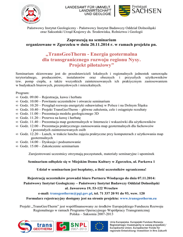 Państwowy Instytut Geologiczny - Państwowy Instytut Badawczy Oddział Dolnośląski oraz Saksoński Urząd Krajowy ds. Środowiska, Rolnictwa i Geologii Zapraszają na seminarium organizowane w Zgorzelcu w dniu 20.11.2014 r. w ramach projektu pn. „TransGeoTherm - Energia geotermalna dla transgranicznego rozwoju regionu Nysy. Projekt pilotażowy” Seminarium skierowane jest do przedstawicieli lokalnych i regionalnych jednostek samorządu terytorialnego, producentów, instalatorów oraz obecnych i przyszłych użytkowników tzw. pomp ciepła, a także wszystkich zainteresowanych ich praktycznym zastosowaniem w budynkach biurowych, przemysłowych i mieszkalnych. Program: • Godz. 09.00 – Rejestracja, kawa i herbata • Godz. 10.00 – Powitanie uczestników i otwarcie seminarium • Godz. 10.20 – Przegląd rozwoju energetyki odnawialnej w Polsce i na Dolnym Śląsku • Godz. 10.40 – Projekt TransGeoTherm – główne założenia, cele i osiągnięte rezultaty • Godz. 11.00 – Prezentacja modelu geologicznego 3D • Godz. 11.20 – Przerwa na kawę i herbatę • Godz. 11.40 – Prezentacja map geotermalnych w Internecie i wskazówki dla użytkowników • Godz. 12.00 – Prezentacja praktycznego zastosowania map geotermalnych dla fachowców i pozostałych zainteresowanych osób • Godz. 12.20 – Lunch, w trakcie lunchu zajęcia praktyczne przy komputerach z użytkowania map geotermalnych • Godz. 14.00 – Dyskusja i podsumowanie • Godz. 15.00 – Zakończenie seminarium Zarejestrowani uczestnicy otrzymają poczęstunek, materiały seminaryjne i upominek Seminarium odbędzie się w Miejskim Domu Kultury w Zgorzelcu, ul. Parkowa 1 Udział w seminarium jest bezpłatny, a ilość uczestników ograniczona! Rejestrację uczestników prowadzi biuro Partnera Wiodącego do dnia 07.11.2014: Państwowy Instytut Geologiczny – Państwowy Instytut Badawczy Oddział Dolnośląski al. Jaworowa 19, 53-122 Wrocław e-mail: [email protected], tel. 71 337 20 91 do 93, wew. 120 Formularz rejestracyjny dostępny jest na stronie projektu: www.transgeotherm.eu Projekt „TransGeoTherm” jest współfinansowany ze środków Europejskiego Funduszu Rozwoju Regionalnego w ramach Programu Operacyjnego Współpracy Transgranicznej Polska – Saksonia 2007-2013 Miejsce seminarium: Miejski Dom Kultury, Zgorzelec, ul. Parkowa 1