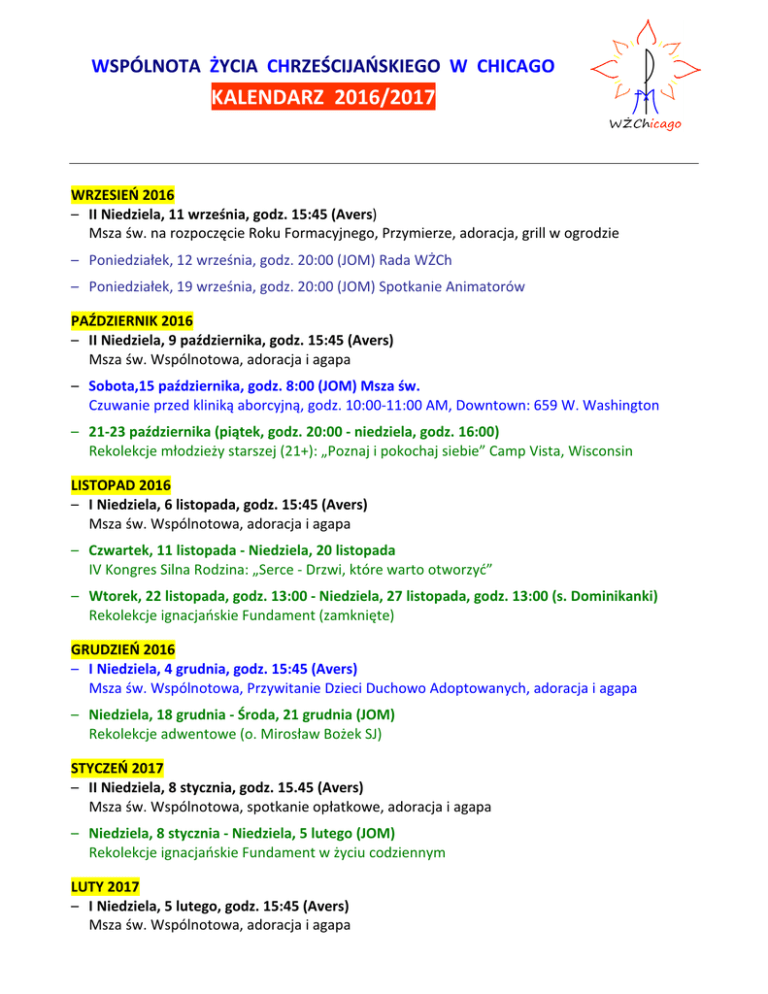 WSPÓLNOTA ŻYCIA CHRZEŚCIJAŃSKIEGO W CHICAGO KALENDARZ 2016/2017 WRZESIEŃ 2016 – II Niedziela, 11 września, godz. 15:45 (Avers) Msza św. na rozpoczęcie Roku Formacyjnego, Przymierze, adoracja, grill w ogrodzie – Poniedziałek, 12 września, godz. 20:00 (JOM) Rada WŻCh – Poniedziałek, 19 września, godz. 20:00 (JOM) Spotkanie Animatorów PAŹDZIERNIK 2016 – II Niedziela, 9 października, godz. 15:45 (Avers) Msza św. Wspólnotowa, adoracja i agapa – Sobota,15 października, godz. 8:00 (JOM) Msza św. Czuwanie przed kliniką aborcyjną, godz. 10:00-11:00 AM, Downtown: 659 W. Washington – 21-23 października (piątek, godz. 20:00 - niedziela, godz. 16:00) Rekolekcje młodzieży starszej (21+): „Poznaj i pokochaj siebie” Camp Vista, Wisconsin LISTOPAD 2016 – I Niedziela, 6 listopada, godz. 15:45 (Avers) Msza św. Wspólnotowa, adoracja i agapa – Czwartek, 11 listopada - Niedziela, 20 listopada IV Kongres Silna Rodzina: „Serce - Drzwi, które warto otworzyć” – Wtorek, 22 listopada, godz. 13:00 - Niedziela, 27 listopada, godz. 13:00 (s. Dominikanki) Rekolekcje ignacjańskie Fundament (zamknięte) GRUDZIEŃ 2016 – I Niedziela, 4 grudnia, godz. 15:45 (Avers) Msza św. Wspólnotowa, Przywitanie Dzieci Duchowo Adoptowanych, adoracja i agapa – Niedziela, 18 grudnia - Środa, 21 grudnia (JOM) Rekolekcje adwentowe (o. Mirosław Bożek SJ) STYCZEŃ 2017 – II Niedziela, 8 stycznia, godz. 15.45 (Avers) Msza św. Wspólnotowa, spotkanie opłatkowe, adoracja i agapa – Niedziela, 8 stycznia - Niedziela, 5 lutego (JOM) Rekolekcje ignacjańskie Fundament w życiu codziennym LUTY 2017 – I Niedziela, 5 lutego, godz. 15:45 (Avers) Msza św. Wspólnotowa, adoracja i agapa – Poniedziałek, 6 lutego, godz. 20:00 (JOM) Rada WŻCh – Poniedziałek, 13 lutego, godz. 20:00 (JOM) Spotkanie Animatorów – Wtorek, 21 lutego, godz. 20:00; Piątek, 24 lutego, godz. 20:00 (JOM) Etapy rozeznania powołania do WŻCh (Aneta Kumięga KL) MARZEC 2017 – Sobota, 11 marca, godz. 13:00 - Niedziela, 19 marca godz. 13:00 (s. Dominikanki) Rekolekcje ignacjańskie I, III Tygodnia (zamknięte) – Wtorek, 21 marca, godz. 20:00; Piątek, 24 marca, godz. 20:00 (JOM) Rozeznawanie indywidualne i we wspólnocie (o. Tomasz Oleniacz SJ) – IV Niedziela, 26 marca, godz. 13:00, 19:00, 20:30 (JOM) Msza św. Wspólnotowa Duchowa Adopcja Dziecka Poczętego, Agapa kawiarenka JOM KWIECIEŃ 2017 – I Niedziela, 2 kwietnia, godz. 15.45 (Avers) Msza św. Wspólnotowa, adoracja i agapa – Niedziela, 9 kwietnia - Środa, 12 kwietnia (JOM) Rekolekcje wielkopostne (o. Andrzej Migacz SJ) – Sobota, 29 kwietnia (Parafia św. Władysława) 20:00 Msza św.; 21:00 Bal WŻCh MAJ 2017 – I Niedziela, 7 maja, godz. 15.45 (Avers) Msza św. Wspólnotowa, adoracja i agapa – Poniedziałek, 8 maja, godz. 20:00 (JOM) Rada WŻCh – Sobota, 13 maja, godz. 15:00 - Niedziela, 21 maja godz. 13:00 (s. Benedyktynki) Rekolekcje ignacjańskie II, IV Tygodnia (zamknięte) – Poniedziałek, 22 maja, godz. 20:00 (JOM) Spotkanie Animatorów CZERWIEC 2017 – Sobota, 3 czerwca, godz. 20:30-24:00 (JOM) Czuwanie przed Uroczystością Zesłania Ducha Świętego, Agapa kawiarenka JOM – I Niedziela, 11 czerwca, godz. 15.45 (Avers) Msza św. na zakończenie Roku Formacyjnego, adoracja, grill w ogrodzie – Niedziela, 18 czerwca (Casa Italia)??? Piknik JOM koordynator Jarek Buranicz WRZESIEŃ 2017 – Poniedziałek, 4 września (Piknik Wspólnotowy) koordynator Marek Zuzański – II Niedziela, 10 września, godz. 15:45 (Avers) Msza św. na rozpoczęcie Roku Formacyjnego, Przymierze, adoracja, grill w ogrodzie