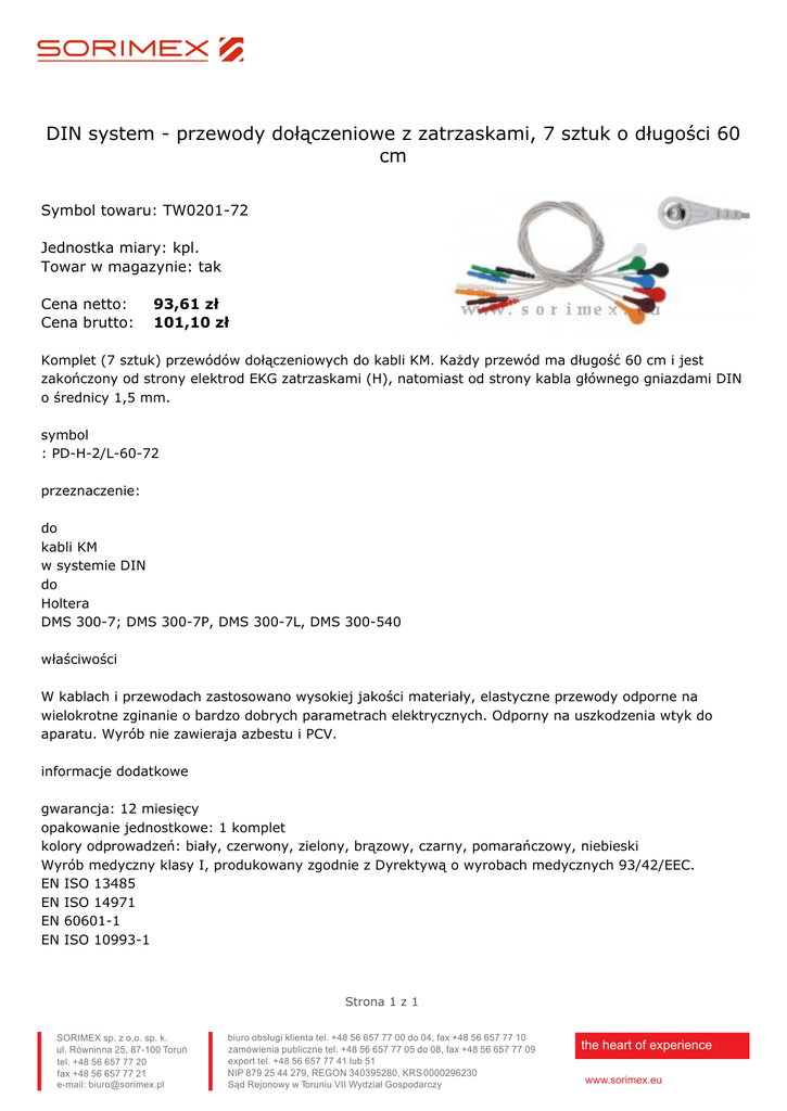 DIN system - przewody dołączeniowe z zatrzaskami, 7 sztuk o długości 60 cm Symbol towaru: TW0201-72 Jednostka miary: kpl. Towar w magazynie: tak Cena netto: Cena brutto: 93,61 zł 101,10 zł Komplet (7 sztuk) przewódów dołączeniowych do kabli KM. Każdy przewód ma długość 60 cm i jest zakończony od strony elektrod EKG zatrzaskami (H), natomiast od strony kabla głównego gniazdami DIN o średnicy 1,5 mm. symbol : PD-H-2/L-60-72 przeznaczenie: do kabli KM w systemie DIN do Holtera DMS 300-7; DMS 300-7P, DMS 300-7L, DMS 300-540 właściwości W kablach i przewodach zastosowano wysokiej jakości materiały, elastyczne przewody odporne na wielokrotne zginanie o bardzo dobrych parametrach elektrycznych. Odporny na uszkodzenia wtyk do aparatu. Wyrób nie zawieraja azbestu i PCV. informacje dodatkowe gwarancja: 12 miesięcy opakowanie jednostkowe: 1 komplet kolory odprowadzeń: biały, czerwony, zielony, brązowy, czarny, pomarańczowy, niebieski Wyrób medyczny klasy I, produkowany zgodnie z Dyrektywą o wyrobach medycznych 93/42/EEC. EN ISO 13485 EN ISO 14971 EN 60601-1 EN ISO 10993-1 Strona 1 z 1