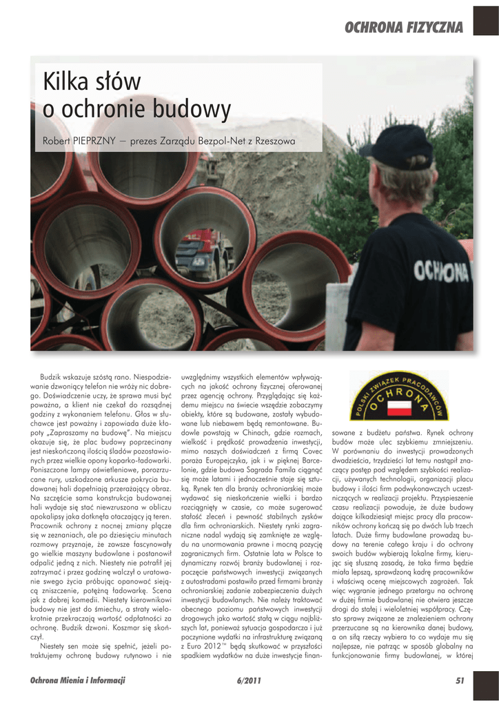 OCHRONA FIZYCZNA Kilka słów o ochronie budowy Robert PIEPRZNY − prezes Zarządu Bezpol-Net z Rzeszowa Budzik wskazuje szóstą rano. Niespodziewanie dzwoniący telefon nie wróży nic dobrego. Doświadczenie uczy, że sprawa musi być poważna, a klient nie czekał do rozsądnej godziny z wykonaniem telefonu. Głos w słuchawce jest poważny i zapowiada duże kłopoty „Zapraszamy na budowę”. Na miejscu okazuje się, że plac budowy poprzecinany jest nieskończoną ilością śladów pozostawionych przez wielkie opony koparko-ładowarki. Poniszczone lampy oświetleniowe, porozrzucane rury, uszkodzone arkusze pokrycia budowanej hali dopełniają przerażający obraz. Na szczęście sama konstrukcja budowanej hali wydaje się stać niewzruszona w obliczu apokalipsy jaka dotknęła otaczający ją teren. Pracownik ochrony z nocnej zmiany plącze się w zeznaniach, ale po dziesięciu minutach rozmowy przyznaje, że zawsze fascynowały go wielkie maszyny budowlane i postanowił odpalić jedną z nich. Niestety nie potrafił jej zatrzymać i przez godzinę walczył o uratowanie swego życia próbując opanować siejącą zniszczenie, potężną ładowarkę. Scena jak z dobrej komedii. Niestety kierownikowi budowy nie jest do śmiechu, a straty wielokrotnie przekraczają wartość odpłatności za ochronę. Budzik dzwoni. Koszmar się skończył. Niestety sen może się spełnić, jeżeli potraktujemy ochronę budowy rutynowo i nie Ochrona Mienia i Informacji uwzględnimy wszystkich elementów wpływających na jakość ochrony fizycznej oferowanej przez agencję ochrony. Przyglądając się każdemu miejscu na świecie wszędzie zobaczymy obiekty, które są budowane, zostały wybudowane lub niebawem będą remontowane. Budowle powstają w Chinach, gdzie rozmach, wielkość i prędkość prowadzenia inwestycji, mimo naszych doświadczeń z firmą Covec poraża Europejczyka, jak i w pięknej Barcelonie, gdzie budowa Sagrada Famila ciągnąć się może latami i jednocześnie staje się sztuką. Rynek ten dla branży ochroniarskiej może wydawać się nieskończenie wielki i bardzo rozciągnięty w czasie, co może sugerować stałość zleceń i pewność stabilnych zysków dla firm ochroniarskich. Niestety rynki zagraniczne nadal wydają się zamknięte ze względu na unormowania prawne i mocną pozycję zagranicznych firm. Ostatnie lata w Polsce to dynamiczny rozwój branży budowlanej i rozpoczęcie państwowych inwestycji związanych z autostradami postawiło przed firmami branży ochroniarskiej zadanie zabezpieczenia dużych inwestycji budowlanych. Nie należy traktować obecnego poziomu państwowych inwestycji drogowych jako wartość stałą w ciągu najbliższych lat, ponieważ sytuacja gospodarcza i już poczynione wydatki na infrastrukturę związaną z Euro 2012™ będą skutkować w przyszłości spadkiem wydatków na duże inwestycje finan- 6/2011 sowane z budżetu państwa. Rynek ochrony budów może ulec szybkiemu zmniejszeniu. W porównaniu do inwestycji prowadzonych dwadzieścia, trzydzieści lat temu nastąpił znaczący postęp pod względem szybkości realizacji, używanych technologii, organizacji placu budowy i ilości firm podwykonawczych uczestniczących w realizacji projektu. Przyspieszenie czasu realizacji powoduje, że duże budowy dające kilkadziesiąt miejsc pracy dla pracowników ochrony kończą się po dwóch lub trzech latach. Duże firmy budowlane prowadzą budowy na terenie całego kraju i do ochrony swoich budów wybierają lokalne firmy, kierując się słuszną zasadą, że taka firma będzie miała lepszą, sprawdzoną kadrę pracowników i właściwą ocenę miejscowych zagrożeń. Tak więc wygranie jednego przetargu na ochronę w dużej firmie budowlanej nie otwiera jeszcze drogi do stałej i wieloletniej współpracy. Często sprawy związane ze znalezieniem ochrony przerzucane są na kierownika danej budowy, a on siłą rzeczy wybiera to co wydaje mu się najlepsze, nie patrząc w sposób globalny na funkcjonowanie firmy budowlanej, w której 51 OCHRONA FIZYCZNA pracuje. Funkcjonowanie w tej części rynku ochroniarskiego wymaga stałego poszukiwania nowych zleceń i budowania bardzo dobrej opinii wśród budowlańców, co przy komplikacjach pojawiających się w czasie ochrony budowy nie jest zadaniem łatwym. Plac budowy, jak to bywało zawsze, nadal jest źródłem wartościowych materiałów, urządzeń, paliw i maszyn dla potencjalnych złodziei. Jeszcze kilkadziesiąt lat temu „znajomy” z placu budowy mógł dostarczyć nieosiągalny powszechnie cement czy ceramikę budowlaną, ale dzisiaj produkty te są dostępne w każdym z hipermarketów czy składów budowlanych. Jednak pokusa pozyskania za darmo kilku rurek do instalacji wodnej czy eleganckich elementów wykończenia wnętrz nie zniknęła. Dzisiejszy złodziej pojawiający się na budowie to nie tylko ten, który przeciąga kilka drutów zbrojeniowych przez ogrodzenie, ale i zorganizowane grupy wykradające tony kruszywa czy duże maszyny budowlane. Do tradycyjnych już przestępstw występujących przy realizacji dróg należą kradzieże paliw. Pracownicy ochrony, jako ostatnia linia zabezpieczenia muszą być szczególnie wyczuleni na zorganizowane próby okradzenia inwestora budowlanego. Przystępując do negocjacji z firmą budowlaną lub inwestorem należy spodziewać się, że oferowana cena może być dużo niższa niż oczekiwana, wymagane będzie ubezpieczenie deliktowe i kontraktowe firmy, a zakres zadań stawianych przed pracownikami ochrony może daleko wykraczać poza zakres typowej ochrony fizycznej. Osoba negocjująca z agencją zakres ochrony i stawki jest na pewno dobrze zorientowana w cenach i z pewnością posiada duże doświadczenie w zbijaniu cen. Należy bowiem pamiętać, że negocjacje z podwykonawcami to dzisiaj podstawowe zadanie kierowników budów przed rozpoczęciem inwestycji. Bardzo często zdarza się, że po zakończeniu negocjacji brak jes