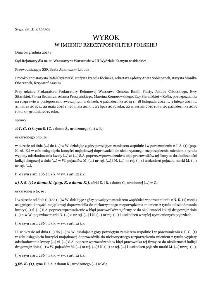 Sygn. akt III K 593/08 WYROK W IMIENIU RZECZYPOSPOLITEJ POLSKIEJ Dnia 04 grudnia 2015 r. Sąd Rejonowy dla m. st. Warszawy w Warszawie w III Wydziale Karnym w składzie: Przewodniczący: SSR Beata Adamczyk- Łabuda Protokolant: stażysta Rafał Czyżewski, stażysta Izabela Kicińska, sekretarz sądowy Aneta Sobiepanek, stażysta Monika Obarzanek, Krzysztof Arasim Przy udziale Prokuratora Prokuratury Rejonowej Warszawa Ochota: Emilii Piasty, Jakuba Ciborskiego, Ewy Sitarskiej, Piotra Bednarza, Adama Pruszyńskiego, Marcina Komorowskiego, Ewy Sieradzkiej – Kośla, po rozpoznaniu na rozprawie w postępowaniu zwyczajnym w dniach: 9 października 2014 r., 18 listopada 2014 r., 3 lutego 2015 r., 31 marca 2015 r., 22 maja 2015 r., 29 maja 2015 r. 23 lipca 2015 roku, 22 września 2015 roku, 29 października 2015 roku, 03 grudnia 2015 roku, sprawy: 1)T. G. (1), syna R. i Z. z domu Ś., urodzonego (...) w Ł.; oskarżonego o to, że : w okresie od dnia (...) do (...) w W. działając z góry powziętym zamiarem wspólnie i w porozumieniu z J. S. (1) (pop. K. zd. K.) w celu osiągnięcia korzyści majątkowej doprowadził do niekorzystnego rozporządzenia mieniem z tytułu wypłaty odszkodowania kwoty (...) zł (...) S.A. poprzez wprowadzenie w błąd pracowników tej firmy co do okoliczności kolizji drogowej z dnia (...) w W. pojazdów M. (...) nr rej. (...) i N. (...) nr rej. (...) i uszkodzeń pojazdu marki M. (...) nr rej. (...), tj. o czyn z art. 286 § 1 k.k. w zw. z art. 12 k.k.; 2) J. S. (1) z domu K. (pop. K. z domu K.), córki E. i B. z domu C., urodzonej (...) w G.; oskarżonej o to, że : I.w okresie od dnia (...) do (...)w W. działając z góry powziętym zamiarem wspólnie i w porozumieniu z N. K. (1) w celu osiągnięcia korzyści majątkowej doprowadziła do niekorzystnego rozporządzenia mieniem z tytułu odszkodowania kwoty (...) zł (...) S.A. poprzez wprowadzenie w błąd pracowników tej firmy co do okoliczności kolizji drogowej z dnia (...) r. w W. pojazdów marki O. (...) o nr rej. (...) i N. (...) nr rej. (...) i uszkodzeń w wyżej wymienionych pojazdach, tj. o czyn z art. 286 § 1 k.k. w zw. z art. 12 k.k.; II. w okresie od dnia (...) do (...) w W. działając z góry powziętym zamiarem wspólnie i w porozumieniu z T. G. (1) w celu osiągnięcia korzyści majątkowej doprowadziła do niekorzystnego rozporządzenia mieniem z tytułu wypłaty odszkodowania kwoty (...) zł (...) S.A. poprzez wprowadzenie w błąd pracownika tej firmy co do okoliczności kolizji drogowej z dnia (...) w W. pojazdów M. (...) nr rej. (...) i N. (...) nr rej. (...) i uszkodzeń pojazdu marki M. (...) nr rej. (...), tj. o czyn z art. 286 § 1 k.k. w zw. z art. 12 k.k.; 3)N. K. (1), syna H. i A. z domu K., urodzonego (...) w W.; oskarżonego o to, że : w okresie od dnia (...) do (...) r. w W. działając z góry powziętym zamiarem wspólnie i w porozumieniu z J. S. (1) z domu K. w celu osiągnięcia korzyści majątkowej doprowadził do niekorzystnego rozporządzenia mieniem z tytułu odszkodowania kwoty (...) zł (...) S.A. poprzez wprowadzenie w błąd pracowników tej firmy co do okoliczności kolizji drogowej z dnia (...) r. w W. pojazdów marki O. (...) o nr rej. (...) i N. (...) nr rej. (...) i uszkodzeń w wyżej wymienionych pojazdach, tj. o czyn z art. 286 § 1 k.k. w zw. z art. 12 k.k.; przy zastosowaniu przepisów kodeksu karnego w brzmieniu obowiązującym przed 01 lipca 2015 roku, które na podstawie art. 4 § 1 k.k mają zastosowanie w sprawie niniejszej orzeka: I. oskarżonego T. G. (1) uznaje za winnego tego, że w okresie od dnia (...) do (...) w W. działając z góry powziętym zamiarem wspólnie i w porozumieniu z J. S. (1) w celu osiągnięcia korzyści majątkowej doprowadził do niekorzystnego rozporządzenia mieniem z tytułu wypłaty odszkodowania kwoty (...) zł (...) S.A. poprzez wprowadzenie w błąd co do okoliczności kolizji drogowej z dnia (...) w W. pojazdów M. (...) nr rej. (...) i N. (...) nr rej. (...) i uszkodzeń pojazdu marki M. (...) nr rej. (...), co stanowi występek z art. 286 § 1 k.k. w zw. z art. 12 k.k i za to na podstawie art. 286 § 1 k.k. wymierza mu karę 8 (ośmiu) miesięcy pozbawienia wolności, zaś na podstawie art. 33 § 2 i § 3 kk wymierza karę grzywny w wysokości 150 (sto pięćdziesiąt) stawek dziennych, ustalając wysokość jednej stawki na kwotę 10,00 (dziesięć) zł; II. na podstawie art. 69 § 1 k.k., art. 70 § 1 pkt 1 kk. wykonanie orzeczonej wobec oskarżonego T. G. (1) kary pozbawienia wolności warunkowo zawiesza na okres próby 2 (dwóch) lat; III. na podstawie art. 46 § 1 k.k. orzeka wobec oskarżonego obowiązek naprawienia szkody w części poprzez zapłatę na rzecz (...) S.A. kwoty (...) ((...)) złotych; IV. oskarżoną J. S. (1) uznaje za winną tego, że w okresie od dnia (...) do (...) w W. działając z góry powziętym zamiarem wspólnie i w porozumieniu z N. K. (1) w celu osiągnięcia korzyści majątkowej doprowadziła do niekorzystnego rozporządzenia mieniem z tytułu odszkodowania kwoty (...) zł (...) S.A. poprzez wprowadzenie w błąd (...) S.A co do okoliczności kolizji drogowej z dnia (...) r. w W. pojazdów marki O. (...) o nr rej. (...) i N. (...) nr rej. (...) i uszkodzeń w wyżej wymienionych pojazdach, to jest czynu, stanowiącego występek z art. 286 § 1 k.k. w zw. z art. 12 k.k. i za to na podstawie art. 286 § 1 k.k. wymierza jej karę 8 (ośmiu) miesięcy pozbawienia wolności, zaś na podstawie art. 33 § 2 i § 3 kk orzeka wobec oskarżonej J. S. (1) karę grzywny w wysokości 150 (stu pięćdziesięciu) stawek dziennych, ustalając wysokość jednej stawki na kwotę 10,00 (dziesięć) zł; uznaje za winną tego, że w okresie od dnia (...) do (...) w W. działając z góry powziętym zamiarem wspólnie i w porozumieniu z T. G. (1) w celu osiągnięcia korzyści majątkowej doprowadziła do niekorzystnego rozporządzenia mieniem z tytułu wypłaty odszkodowania kwoty (...) zł 