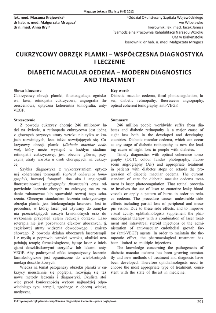 Magazyn Lekarza Okulisty 6 (6) 2012 lek. med. Marzena Krajewska dr hab. n. med. Małgorzata Mrugacz2 dr n. med. Anna Bryl2 1 Oddział Okulistyczny Szpitala Wojewódzkiego we Włocławku kierownik: lek. med. Jacek Janusz 2 Samodzielna Pracownia Rehabilitacji Narządu Wzroku UM w Białymstoku kierownik: dr hab. n. med. Małgorzata Mrugacz 1 CUKRZYCOWY OBRZĘK PLAMKI – WSPÓŁCZESNA DIAGNOSTYKA I LECZENIE DIABETIC MACULAR OEDEMA – MODERN DIAGNOSTICS AND TREATMENT Słowa kluczowe Cukrzycowy obrzęk plamki, fotokoagulacja ogniskowa, laser, retinopatia cukrzycowa, angiografia fluoresceinowa, optyczna koherentna tomografia, antyVEGF. Key words Diabetic macular oedema, focal photocoagulation, laser, diabetic retinopathy, fluorescein angiography, optical coherent tomography, anti-VEGF. Streszczenie Z powodu cukrzycy choruje 246 milionów ludzi na świecie, a retinopatia cukrzycowa jest jedną z głównych przyczyn utraty wzroku nie tylko w krajach rozwiniętych, lecz także rozwijających się. Cukrzycowy obrzęk plamki (diabetic macular oedema), który może wystąpić w każdym stadium retinopatii cukrzycowej, jest obecnie główną przyczyną utraty wzroku u osób chorujących na cukrzycę. Szybka diagnostyka z wykorzystaniem optycznej koherentnej tomografii (optical coherence tomography), barwnej fotografii dna oka i angiografii fluoresceinowej (angiography fluorescein) oraz odpowiednie leczenie chorych na cukrzycę ma za zadanie zahamować lub spowolnić rozwój tego schorzenia. Obecnym standardem leczenia cukrzycowego obrzęku plamki jest fotokoagulacja laserowa. Jest to procedura, w której laser jest używany do zamykania przeciekających naczyń krwionośnych oraz do wykonania przypaleń celem redukcji obrzęku. Laseroterapia nie jest pozbawiona efektów ubocznych, tj. częściowej utraty widzenia obwodowego i zmierzchowego. Z powodu działań ubocznych laseroterapii i z myślą o poprawie ostrości wzroku, okuliści uzupełniają terapię farmakologiczną łącząc laser z iniekcjami doszklistkowymi sterydów lub lekami antyVEGF. Aby podtrzymać efekt terapeutyczny leczenie farmakologiczne jest ograniczone do wielokrotnych iniekcji doszklistkowych. Wiedza na temat patogenezy obrzęku plamki w cukrzycy nieustannie się pogłębia, rozwijają się też nowe metody leczenia i diagnostyki. Okulista stoi więc przed koniecznością wyboru najbardziej odpowiedniego typu terapii, zgodnego z obecną wiedzą medyczną. Summary 246 million people worldwide suffer from diabetes and diabetic retinopathy is a major cause of sight loss both in the developed and developing countries. Diabetic macular oedema, which can occur at any stage of diabetic retinopathy, is now the leading cause of sight loss in people with diabetes. Timely diagnostics with optical coherence tomography (OCT), colour fundus photography, fluorescein angiography (AF) and appropriate treatment in patients with diabetes stops or retards the progression of diabetic macular oedema. The current standard of care for diabetic macular oedema treatment is laser photocoagulation. That retinal procedure involves the use of laser to cauterize leaky blood vessels or apply a pattern of burns in order to reduce oedema. The procedure causes undesirable side effects including partial loss of peripheral and mesopic vision. Due to these side effects, and to improve visual acuity, ophthalmologists supplement the pharmacological therapy with a combination of laser treatment and intravitreal steroid injections or the administration of anti-vascular endothelial growth factor (anti-VEGF) agents. In order to maintain the therapeutic effect, the pharmacological treatment has been limited to multiple injections. The knowledge concerning the pathogenesis of diabetic macular oedema has been growing constantly and new methods of treatment and diagnosis have been developed. Therefore ophthalmologists need to choose the most appropriate type of treatment, consistent with the state of the art in medicine. Cukrzycowy obrzęk plamki – współczesna diagnostyka i leczenie – praca poglądowa 291