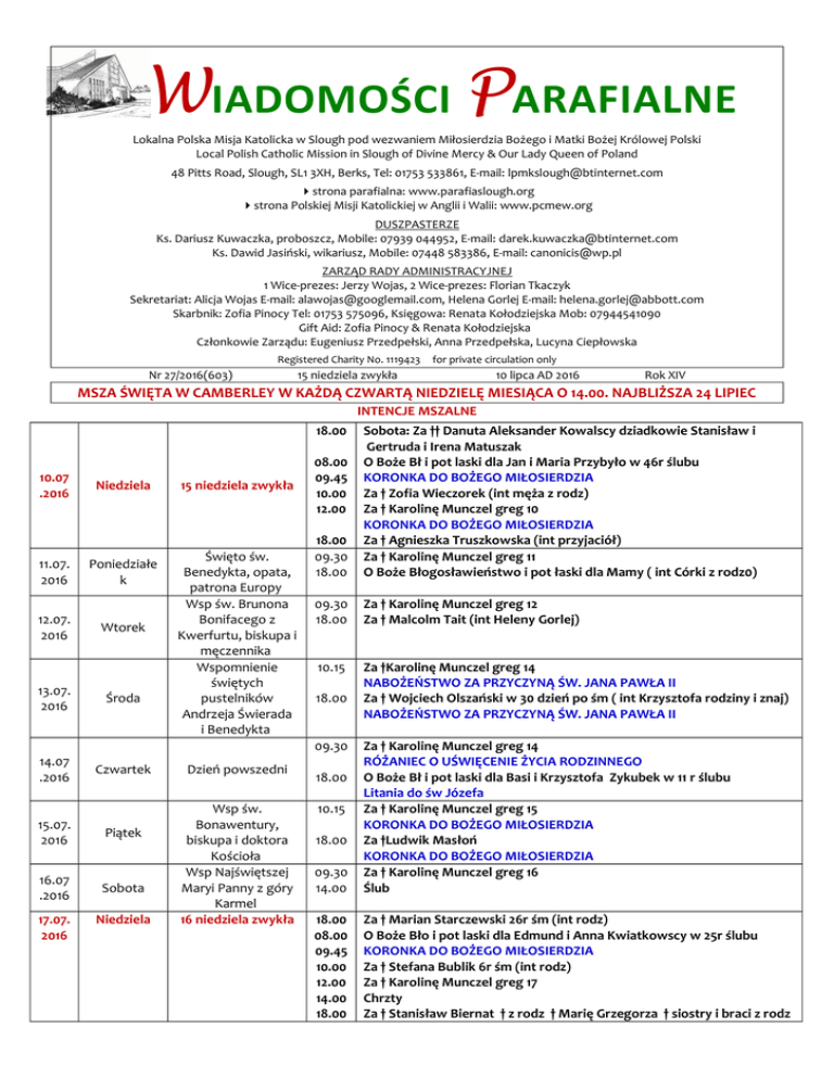WIADOMOŚCI PARAFIALNE Lokalna Polska Misja Katolicka w Slough pod wezwaniem Miłosierdzia Bożego i Matki Bożej Królowej Polski Local Polish Catholic Mission in Slough of Divine Mercy & Our Lady Queen of Poland 48 Pitts Road, Slough, SL1 3XH, Berks, Tel: 01753 533861, E-mail: [email protected] strona parafialna: www.parafiaslough.org strona Polskiej Misji Katolickiej w Anglii i Walii: www.pcmew.org DUSZPASTERZE Ks. Dariusz Kuwaczka, proboszcz, Mobile: 07939 044952, E-mail: [email protected] Ks. Dawid Jasiński, wikariusz, Mobile: 07448 583386, E-mail: [email protected] ZARZĄD RADY ADMINISTRACYJNEJ 1 Wice-prezes: Jerzy Wojas, 2 Wice-prezes: Florian Tkaczyk Sekretariat: Alicja Wojas E-mail: [email protected], Helena Gorlej E-mail: [email protected] Skarbnik: Zofia Pinocy Tel: 01753 575096, Księgowa: Renata Kołodziejska Mob: 07944541090 Gift Aid: Zofia Pinocy & Renata Kołodziejska Członkowie Zarządu: Eugeniusz Przedpełski, Anna Przedpełska, Lucyna Ciepłowska Registered Charity No. 1119423 Nr 27/2016(603) for private circulation only 15 niedziela zwykła 10 lipca AD 2016 Rok XIV MSZA ŚWIĘTA W CAMBERLEY W KAŻDĄ CZWARTĄ NIEDZIELĘ MIESIĄCA O 14.00. NAJBLIŻSZA 24 LIPIEC INTENCJE MSZALNE 18.00 10.07 .2016 11.07. 2016 12.07. 2016 13.07. 2016 14.07 .2016 Niedziela Poniedziałe k Wtorek Środa Święto św. Benedykta, opata, patrona Europy Wsp św. Brunona Bonifacego z Kwerfurtu, biskupa i męczennika Wspomnienie świętych pustelników Andrzeja Świerada i Benedykta 18.00 09.30 18.00 09.30 18.00 Za † Karolinę Munczel greg 12 Za † Malcolm Tait (int Heleny Gorlej) 10.15 Za †Karolinę Munczel greg 14 NABOŻEŃSTWO ZA PRZYCZYNĄ ŚW. JANA PAWŁA II Za † Wojciech Olszański w 30 dzień po śm ( int Krzysztofa rodziny i znaj) NABOŻEŃSTWO ZA PRZYCZYNĄ ŚW. JANA PAWŁA II 08.00 09.45 10.00 12.00 18.00 09.30 Czwartek 15.07. 2016 Piątek 16.07 .2016 Sobota 17.07. 2016 15 niedziela zwykła Sobota: Za †† Danuta Aleksander Kowalscy dziadkowie Stanisław i Gertruda i Irena Matuszak O Boże Bł i pot laski dla Jan i Maria Przybyło w 46r ślubu KORONKA DO BOŻEGO MIŁOSIERDZIA Za † Zofia Wieczorek (int męża z rodz) Za † Karolinę Munczel greg 10 KORONKA DO BOŻEGO MIŁOSIERDZIA Za † Agnieszka Truszkowska (int przyjaciół) Za † Karolinę Munczel greg 11 O Boże Błogosławieństwo i pot łaski dla Mamy ( int Córki z rodz0) Niedziela Dzień powszedni Wsp św. Bonawentury, biskupa i doktora Kościoła Wsp Najświętszej Maryi Panny z góry Karmel 16 niedziela zwykła 09.30 14.00 Za † Karolinę Munczel greg 14 RÓŻANIEC O UŚWIĘCENIE ŻYCIA RODZINNEGO O Boże Bł i pot laski dla Basi i Krzysztofa Zykubek w 11 r ślubu Litania do św Józefa Za † Karolinę Munczel greg 15 KORONKA DO BOŻEGO MIŁOSIERDZIA Za †Ludwik Masłoń KORONKA DO BOŻEGO MIŁOSIERDZIA Za † Karolinę Munczel greg 16 Ślub 18.00 08.00 09.45 10.00 12.00 14.00 18.00 Za † Marian Starczewski 26r śm (int rodz) O Boże Bło i pot laski dla Edmund i Anna Kwiatkowscy w 25r ślubu KORONKA DO BOŻEGO MIŁOSIERDZIA Za † Stefana Bublik 6r śm (int rodz) Za † Karolinę Munczel greg 17 Chrzty Za † Stanisław Biernat † z rodz † Marię Grzegorza † siostry i braci z rodz 18.00 10.15 18.00 Kit ( int Marii Biernat z rodz) BEZPOŚREDNIE PRZYGOTOWANIE DO MAŁŻEŃSTWA ROK 2016 Program spotkań przygotowania do małżeństwa na rok 2016 jest następujący: • trzecia seria 06/10 (czwartek o 20.00); 09/10 (niedziela o 19.00); 13/10 (czwartek o 20.00) Zgłoszenia do udziału w kursie podczas pierwszego wieczoru. Narzeczeni podczas zgłoszeń wpłacają £20.00. SAKRAMENT POJEDNANIA I POKUTY Każdego dnia pół godziny przed Mszą Świętą, a w każdą sobotę i pierwszy piątek miesiąca od 17.00 do 17.50 okazja do skorzystania z sakramentu pojednania i pokuty. Bardzo prosimy, aby nie przychodzić na parę minut przed Mszą Świętą. ADORACJA NAJŚWIĘTSZEGO SAKRAMENTU ADORATION OF THE HOLY SACRAMENT czwartek: po Mszy Świętej wieczornej do 19.30 modlitwa w ciszy; 19.30 – 20.30 Różaniec i Koronka w języku angielskim Thursday: after evening Mass adoration in silence till 7.30 pm & 7.30 – 8.30 pm Rosary and Divine Mercy in English sobota: 17.00 – 18.00 Saturday: 5 – 6 pm PAPIESKIE INTECJE APOSTOLSTWA MODLITWY W CZERWCU INTENCJA OGÓLNA: Aby szanowane były ludy tubylcze, których tożsamość, a nawet egzystencja są zagrożone. INTENCJA EWANGELIZACYJNA: Aby Kościół w Ameryce Łacińskiej i na Karaibach poprzez swoją misję kontynentalną głosił Ewangelię z odnowionym zapałem i entuzjazmem. PRZEDSZKOLE „ZAJĄCZKI” („Bunnies” Pre-School) dla dzieci w wieku od 3 do 5 lat czynne od poniedziałku do piątku w godz. od 9.45 do 12.45 tel. 01753 572 330 mob. 07903 467 732 GRUPA „PSZCZÓŁKI” dla dzieci w wieku do 3 lat pod opieką Rodziców spotkania we wtorki od godz.13.15 do 15.15 TAŃCE Mały Gaiczek (4-6 lat): środa: 18.00 – 18.45 Gaiczek (6-12 lat): środa: 19.00 – 20.00 Młody Las środa: 20.00 – 22.00 CHÓRY SPOTKANIA Męski i żeński: czwartek od 20.30 do 22.00 Schola: czwartek od 21.00 do 22.30 Chór rodzinny: Pociąg do nieba piątek o 18.30 w kawiarence POLSKA SZKOŁA PRZEDMIOTÓW OJCZYSTYCH Sobota 9.00-13.00 i 13.30-16.30 Slough and Eton Business and Enterprise College Ragstone Road, Slough SL1 2PU www.PolskaSzkolaSlough.org POLSKIE HARCERSTWO Piątki 18.30 – 20:30 Stowarzyszenie Polskie DZIEŃ SENIORA (DAY CENTRE) Środa i piątek od 10.15 (Msza Święta) do 15.00. GRUPA (AA) ANONIMOWYCH ALKOHOLIKÓW Nowy Świat – poniedziałek i piątek o 20.00 Kontakt: Tomek 07502206041 MS Nowy Rejs – niedziela 14,00 Kontakt: Michał 07825298842 Małgorzata 07990289769 GRUPA RODZINNA AL-ANON „WIKTORIA” spotkania w każdy wtorek o 19.00. Kontakty: pani Agnieszka: 07894536677, pani Ewa: 07791327119 BIBLIOTEKA Każda niedziela 8.00 – 10.00; 13.00 – 13.30; 19.00 – 19.30. SPRAWY AKTUALNE KAWIARENKA Piątek 28 kwietnia – poniedziałek 1 maja 2017 Zapraszamy