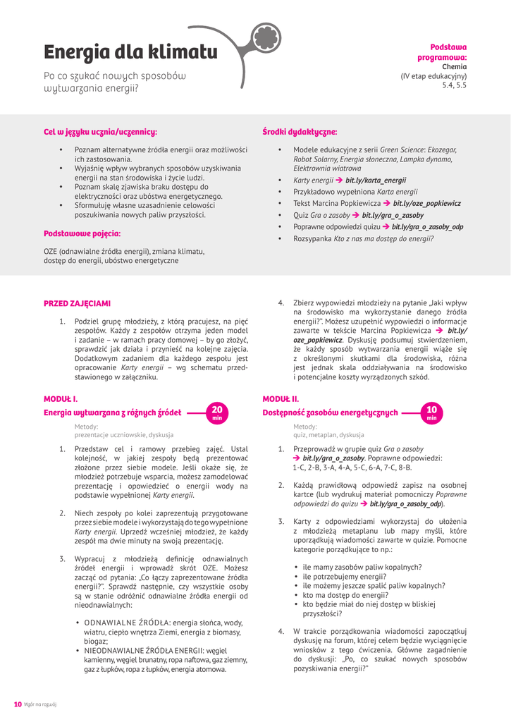 Energia dla klimatu Podstawa programowa: Chemia (IV etap edukacyjny) 5.4, 5.5 Po co szukać nowych sposobów wytwarzania energii? Cel w języku ucznia/uczennicy: Środki dydaktyczne: yy Poznam alternatywne źródła energii oraz możliwości ich zastosowania. yy Wyjaśnię wpływ wybranych sposobów uzyskiwania energii na stan środowiska i życie ludzi. yy Poznam skalę zjawiska braku dostępu do elektryczności oraz ubóstwa energetycznego. yy Sformułuję własne uzasadnienie celowości poszukiwania nowych paliw przyszłości. yy Modele edukacyjne z serii Green Science: Ekozegar, Robot Solarny, Energia słoneczna, Lampka dynamo, Elektrownia wiatrowa yy Karty energii bit.ly/karta_energii yy Przykładowo wypełniona Karta energii yy Tekst Marcina Popkiewicza bit.ly/oze_popkiewicz yy Quiz Gra o zasoby bit.ly/gra_o_zasoby yy Poprawne odpowiedzi quizu bit.ly/gra_o_zasoby_odp Podstawowe pojęcia: yy Rozsypanka Kto z nas ma dostęp do energii? OZE (odnawialne źródła energii), zmiana klimatu, dostęp do energii, ubóstwo energetyczne PRZED ZAJĘCIAMI 1. Podziel grupę młodzieży, z którą pracujesz, na pięć zespołów. Każdy z zespołów otrzyma jeden model i zadanie – w ramach pracy domowej – by go złożyć, sprawdzić jak działa i przynieść na kolejne zajęcia. Dodatkowym zadaniem dla każdego zespołu jest opracowanie Karty energii – wg schematu przedstawionego w załączniku. MODUŁ I. Energia wytwarzana z różnych źródeł 20 min Metody: prezentacje uczniowskie, dyskusja 1. Przedstaw cel i ramowy przebieg zajęć. Ustal kolejność, w jakiej zespoły będą prezentować złożone przez siebie modele. Jeśli okaże się, że młodzież potrzebuje wsparcia, możesz zamodelować prezentację i opowiedzieć o energii wody na podstawie wypełnionej Karty energii. 2. Niech zespoły po kolei zaprezentują przygotowane przez siebie modele i wykorzystają do tego wypełnione Karty energii. Uprzedź wcześniej młodzież, że każdy zespół ma dwie minuty na swoją prezentację. 3. Wypracuj z młodzieżą definicję odnawialnych źródeł energii i wprowadź skrót OZE. Możesz zacząć od pytania: „Co łączy zaprezentowane źródła energii?”. Sprawdź następnie, czy wszystkie osoby są w stanie odróżnić odnawialne źródła energii od nieodnawialnych: yyODNAWIALNE ŹRÓDŁA: energia słońca, wody, wiatru, ciepło wnętrza Ziemi, energia z biomasy, biogaz; yyNIEODNAWIALNE ŹRÓDŁA ENERGII: węgiel kamienny, węgiel brunatny, ropa naftowa, gaz ziemny, gaz z łupków, ropa z łupków, energia atomowa. 10 Wzór na rozwój 4. Zbierz wypowiedzi młodzieży na pytanie „Jaki wpływ na środowisko ma wykorzystanie danego źródła energii?”. Możesz uzupełnić wypowiedzi o informacje zawarte w tekście Marcina Popkiewicza bit.ly/ oze_popkiewicz. Dyskusję podsumuj stwierdzeniem, że każdy sposób wytwarzania energii wiąże się z określonymi skutkami dla środowiska, różna jest jednak skala oddziaływania na środowisko i potencjalne koszty wyrządzonych szkód. MODUŁ II. Dostępność zasobów energetycznych 10 min Metody: quiz, metaplan, dyskusja 1. Przeprowadź w grupie quiz Gra o zasoby bit.ly/gra_o_zasoby. Poprawne odpowiedzi: 1-C, 2-B, 3-A, 4-A, 5-C, 6-A, 7-C, 8-B. 2. Każdą prawidłową odpowiedź zapisz na osobnej kartce (lub wydrukuj materiał pomocniczy Poprawne odpowiedzi do quizu bit.ly/gra_o_zasoby_odp). 3. Karty z odpowiedziami wykorzystaj do ułożenia z młodzieżą metaplanu lub mapy myśli, które uporządkują wiadomości zawarte w quizie. Pomocne kategorie porządkujące to np.: yyile mamy zasobów paliw kopalnych? yyile potrzebujemy energii? yyile możemy jeszcze spalić paliw kopalnych? yykto ma dostęp do energii? yykto będzie miał do niej dostęp w bliskiej przyszłości? 4. W trakcie porządkowania wiadomości zapoczątkuj dyskusję na forum, której celem będzie wyciągnięcie wniosków z tego ćwiczenia. Główne zagadnienie do dyskusji: „Po, co szukać nowych sposobów pozyskiwania energii?” MODUŁ III. Dostęp do energii a ubóstwo energetyczne 10 EWALUACJA ZAJĘĆ Metody: praca indywidualna min Metody: układanka, dyskusja, praca indywidualna 1. Podziel grupę na dwu-trzyosobowe zespoły. Każdy zespół otrzyma rozcięte elementy karty pracy Kto z nas ma dostęp do energii?. Zadaniem zespołów jest ułożenie rozsypanki - od elementu opisującego najłatwiejszy dostęp do elektryczności, aż do elementu opisującego sytuację braku dostępu do elektryczności. 2. Gdy każdy z zespołów wykona zadanie, przekaż młodzieży definicję ubóstwa energetycznego i poproś, by zespoły wskazały, które sytuacje opisane w rozsypance odpowiadają tej definicji. 3. Sprawdź, jak zespoły wykonały zadanie. Upewnij się, że młodzież rozumie definicję ubóstwa energetycznego. Zapytaj, czy łatwo było podjąć decyzję i jakie dylematy miały osoby wykonujące to ćwiczenie. Dodaj kolejną informację do utworzonego w poprzednim module metaplanu – 1 miliard to liczba osób, które mają pewien dostęp do usług energetycznych, ale jest to dostęp niestabilny, tymczasowy, zbyt drogi, by można było liczyć na niego na co dzień. Możesz wymienić sposoby ograniczania ubóstwa energetycznego: rozwijanie OZE, budowa infrastruktury elektrycznej, dbanie o energooszczędność budynków, modernizacja ogrzewania, obniżanie cen elektryczności, stabilizacja napięć politycznych i społecznych. 4. Poproś uczniów i uczennice, by popracowali indywidualnie i zanotowali swoją odpowiedź na pytanie „Dlaczego twoim zdaniem warto szukać nowych sposobów pozyskiwania energii?”. Chętne osoby niech odczytają swoje odpowiedzi na forum grupy. Z zapisanych przez młodzież kartek można stworzyć galerię. 5 min Uczniowie i uczennice mają za zadanie dokończyć poniższe zdania i zapisać je w zeszytach. Chętne osoby niech podzielą się swoimi wypowiedziami na forum: yyPo dzisiejszych zajęciach już wiem / rozumiem / potrafię …