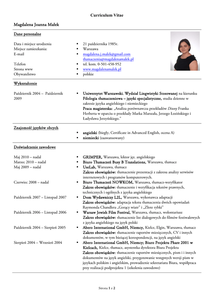 Curriculum Vitae Magdalena Joanna Małek