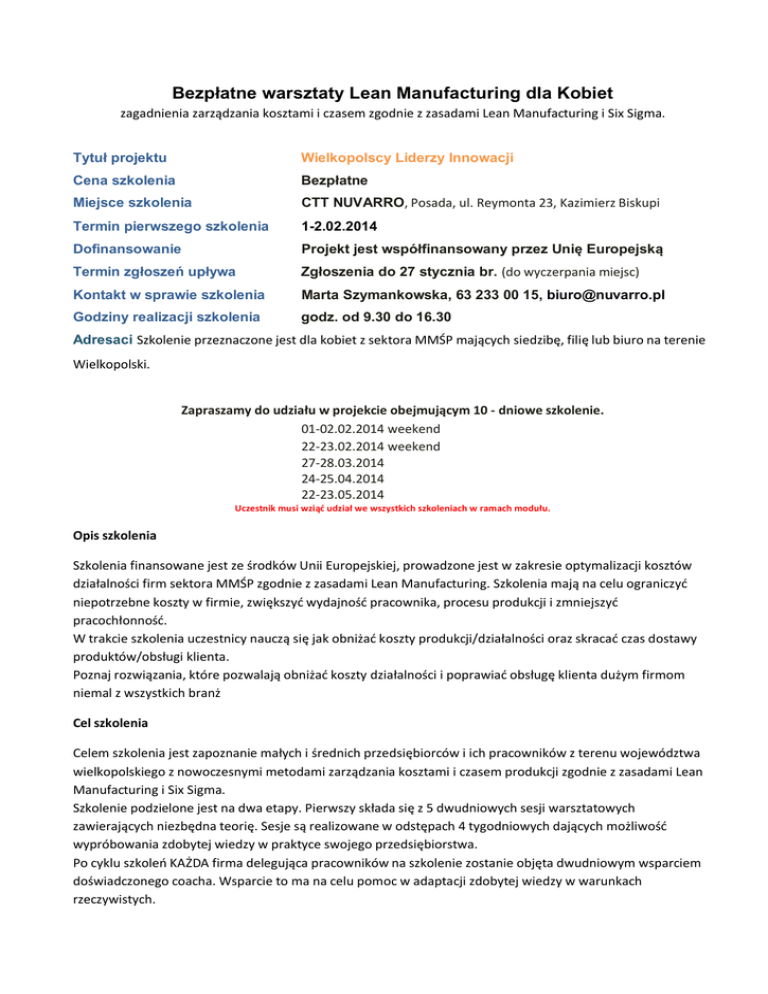Bezpłatne warsztaty Lean Manufacturing dla Kobiet zagadnienia zarządzania kosztami i czasem zgodnie z zasadami Lean Manufacturing i Six Sigma. Tytuł projektu Wielkopolscy Liderzy Innowacji Cena szkolenia Bezpłatne Miejsce szkolenia CTT NUVARRO, Posada, ul. Reymonta 23, Kazimierz Biskupi Termin pierwszego szkolenia 1-2.02.2014 Dofinansowanie Projekt jest współfinansowany przez Unię Europejską Termin zgłoszeń upływa Zgłoszenia do 27 stycznia br. (do wyczerpania miejsc) Kontakt w sprawie szkolenia Marta Szymankowska, 63 233 00 15, [email protected] Godziny realizacji szkolenia godz. od 9.30 do 16.30 Adresaci Szkolenie przeznaczone jest dla kobiet z sektora MMŚP mających siedzibę, filię lub biuro na terenie Wielkopolski. Zapraszamy do udziału w projekcie obejmującym 10 - dniowe szkolenie. 01-02.02.2014 weekend 22-23.02.2014 weekend 27-28.03.2014 24-25.04.2014 22-23.05.2014 Uczestnik musi wziąć udział we wszystkich szkoleniach w ramach modułu. Opis szkolenia Szkolenia finansowane jest ze środków Unii Europejskiej, prowadzone jest w zakresie optymalizacji kosztów działalności firm sektora MMŚP zgodnie z zasadami Lean Manufacturing. Szkolenia mają na celu ograniczyć niepotrzebne koszty w firmie, zwiększyć wydajność pracownika, procesu produkcji i zmniejszyć pracochłonność. W trakcie szkolenia uczestnicy nauczą się jak obniżać koszty produkcji/działalności oraz skracać czas dostawy produktów/obsługi klienta. Poznaj rozwiązania, które pozwalają obniżać koszty działalności i poprawiać obsługę klienta dużym firmom niemal z wszystkich branż Cel szkolenia Celem szkolenia jest zapoznanie małych i średnich przedsiębiorców i ich pracowników z terenu województwa wielkopolskiego z nowoczesnymi metodami zarządzania kosztami i czasem produkcji zgodnie z zasadami Lean Manufacturing i Six Sigma. Szkolenie podzielone jest na dwa etapy. Pierwszy składa się z 5 dwudniowych sesji warsztatowych zawierających niezbędna teorię. Sesje są realizowane w odstępach 4 tygodniowych dających możliwość wypróbowania zdobytej wiedzy w praktyce swojego przedsiębiorstwa. Po cyklu szkoleń KAŻDA firma delegująca pracowników na szkolenie zostanie objęta dwudniowym wsparciem doświadczonego coacha. Wsparcie to ma na celu pomoc w adaptacji zdobytej wiedzy w warunkach rzeczywistych. Program i zakres tematyczny szkoleń: Dzień I: Dzień II: Dzień III: Dzień IV: Dzień V: Dzień VI: Dzień VII: Dzień VIII: Dzień IX: Dzień X: Podstawy Lean – filozofia i metodologia zarządzania produkcją rozwinięta na bazie systemu produkcyjnego TOYOTY mająca na celu eliminację czynności, procesów i działań, które nie dodają wartości produktowi kupowanemu przez klienta. Dla firm oszczędność materiału, zmniejszenie zapasów, skrócenie procesu produkcyjnego. Czynniki warunkujące sukces wdrażania. 5S- usystematyzowanie i organizacja stanowiska pracy. Selekcja, systematyka, sprzątanie, standaryzacja, samodyscyplina. Mapowanie strumienia wartości (VSM)- mapowanie (analizowanie) procesów mające na celu skrócenie czasu realizacji zamówienia. Mapowanie strumienia wartości (VSM) SMED- (Single Minute Exchange of Die) – metoda pozwalająca na skracanie czasu przestawiania maszyny/procesu z jednego produktu na inny – oszczędność czasu Heijunka – metoda planowania produkcji pozwalająca na bieżące monitorowanie postępu realizacji zleceń. Pozwalająca na równomierne obciążenie wszystkich stanowisk pracy. Standaryzacja pracy Techniki rozwiązywania problemów oraz ich analiza (5xDLACZEGO, Burza Mózgów, Analiza Pareto, Diagram Ishikawy – rybiej ości). 8D- (8 Disciplines)- metodologia systematycznego rozwiązywania problemów produkcyjnych zapewniająca wdrożenie działań mających zapobiec ponownemu wystąpieniu tego samego problemu w przyszłości. Wykorzystana głównie przy rozpatrywaniu reklamacji od klientów. Wprowadzenia do Six Sigma – metodologia prowadzenie projektów usprawniających, wykorzystująca analizy statystyczne. Stosowana do rozwiązywania złożonych problemów produkcyjnych, poprawy wskaźników, optymalizacji nastaw maszyn, itp. Gra Lean. W trakcie szkolenia zapewniamy wyżywienie i serwisy kawowe. Szkolenie jest realizowane w ramach projektu "Wielkopolscy Liderzy Innowacji" i finansowane w 100% ze środków Unii Europejskiej w ramach EFS dlatego dla wszystkich uczestników i firm szkolenie jest całkowicie BEZPŁATNE! Stań się Wielkopolskim Liderem Innowacji!! Wszystkie szczegóły zawarte są na stronie projektu www.szkolenia-lean.pl Zapraszamy! Marta Szymankowska, NUVARRO Sp. z o. o., 63 233 00 15, [email protected], Posada, ul. Reymonta 23, 62-530 Kaziemierz Biskupi