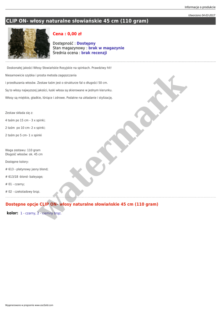 Informacje o produkcie Utworzono 04-03-2017 CLIP ON- włosy naturalne słowiańskie 45 cm (110 gram) Cena : 0,00 zł Dostępność : Dostępny Stan magazynowy : brak w magazynie Średnia ocena : brak recenzji Doskonałej jakości Włosy Słowiańskie Rosyjskie na spinkach. Prawdziwy hit! Niesamowicie szybka i prosta metoda zagęszczania er m ar k i przedłuzania włosów. Zestaw taśm jest o strukturze fal o długości 50 cm. Są to włosy najwyzszej jakości, łuski włosa są skierowane w jednym kierunku. Włosy są miękkie, gładkie, lśniące i zdrowe. Podatne na układanie i stylizację. Zestaw składa się z: 4 taśm po 15 cm - 3 x spinki; 2 taśm po 10 cm- 2 x spinki; 2 taśm po 5 cm- 1 x spinki Waga zestawu: 110 gram Długość włosów: ok. 45 cm Dostępne kolory: # 613 - platynowy jasny blond; # 01 - czarny; at # 613/18 -blond- baleyage; # 02 - czekoladowy brąz. w Dostępne opcje CLIP ON- włosy naturalne słowiańskie 45 cm (110 gram) kolor: 1 - czarny, 2 - ciemny brąz. Wygenerowano w programie www.oscGold.com
