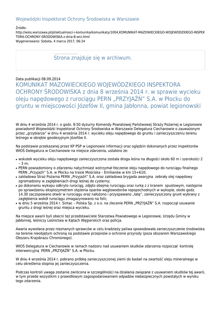 Wojewódzki Inspektorat Ochrony Środowiska w Warszawie Źródło: http://wios.warszawa.pl/pl/aktualnosci-i-komunika/komunikaty/1004,KOMUNIKAT-MAZOWIECKIEGO-WOJEWODZKIEGO-INSPEK TORA-OCHRONY-SRODOWISKA-z-dnia-8-wrz.html Wygenerowano: Sobota, 4 marca 2017, 06:24 Strona znajduje się w archiwum. Data publikacji 08.09.2014 KOMUNIKAT MAZOWIECKIEGO WOJEWÓDZKIEGO INSPEKTORA OCHRONY ŚRODOWISKA z dnia 8 września 2014 r. w sprawie wycieku oleju napędowego z rurociągu PERN „PRZYJAŹŃ” S.A. w Płocku do gruntu w miejscowości Józefów II, gmina Jabłonna, powiat legionowski W dniu 4 września 2014 r. o godz. 8:50 dyżurny Komendy Powiatowej Państwowej Straży Pożarnej w Legionowie powiadomił Wojewódzki Inspektorat Ochrony Środowiska w Warszawie Delegatura Ciechanowie o zauważonym przez „grzybiarza” w dniu 4 września 2014 r. wycieku oleju napędowego do gruntu i zanieczyszczeniu terenu leśnego w obrębie geodezyjnym Józefów II. Na podstawie przekazanej przez KP PSP w Legionowie informacji oraz oględzin dokonanych przez inspektorów WIOŚ Delegatura w Ciechanowie na miejsce zdarzenia, ustalono że: ● ● ● ● ● wskutek wycieku oleju napędowego zanieczyszczona została droga leśna na długości około 60 m i szerokości 2 – 3 m; PERN powiadomiony o zdarzeniu natychmiast wstrzymał tłoczenie oleju napędowego do rurociągu finalnego PERN „Przyjaźń” S.A. w Płocku na trasie Mościska – Emilianów w km 15+610; zakładowa Straż Pożarna PERN „Przyjaźń” S.A. oraz zakładowa brygada awaryjna zebrały olej napędowy zgromadzony w zagłębieniach drogi leśnej do cysterny; po dokonaniu wykopu odkryto rurociąg, zdjęto obejmę rurociągu oraz rurkę z z kranem spustowym, następnie po sprawdzeniu eksplozymetrem stężenia oparów węglowodorów ropopochodnych w wykopie, około godz. 14.30 zaczopowano otwór w rurociągu oraz nałożono i przyspawano „łatę”, zanieczyszczony grunt wybrany z zagłębienia wokół rurociągu zmagazynowano na folii; w dniu 5 września 2014 r. Sintac – Polska Sp. z o.o. na zlecenie PERN „PRZYJAŹŃ” S.A. rozpoczął usuwanie gruntu z drogi leśnej oraz miejsca wycieku. Na miejsce awarii byli obecni też przedstawiciele Starostwa Powiatowego w Legionowie, Urzędu Gminy w Jabłonnej, leśniczy Leśnictwa w Kątach Węgierskich oraz policja. Awaria wywołana przez nieznanych sprawców w celu kradzieży paliwa spowodowała zanieczyszczenie środowiska na terenie nieobjętym ochroną na podstawie przepisów o ochronie przyrody (poza obszarem Warszawskiego Obszaru Krajobrazu Chronionego). WIOŚ Delegatura w Ciechanowie w ramach nadzoru nad usuwaniem skutków zdarzenia rozpoczął kontrolę interwencyjną PERN „PRZYJAŹŃ” S.A. w Płocku. W dniu 4 września 2014 r. pobrano próbkę zanieczyszczonej ziemi do badań na zwartość oleju mineralnego w celu określenia stopnia jej zanieczyszczenia. Podczas kontroli uwaga zostanie zwrócona w szczególności na działania związane z usuwaniem skutków tej awarii, w tym przede wszystkim z prawidłowym zagospodarowaniem odpadów niebezpiecznych powstałych w wyniku tego zdarzenia. Data publikacji 08.09.2014 Data modyfikacji 09.09.2014Rejestr zmian Liczba wizyt: 781 Autor: Iwona Kalinowska-Witowska Opublikowane przez Ewa Pacholska
