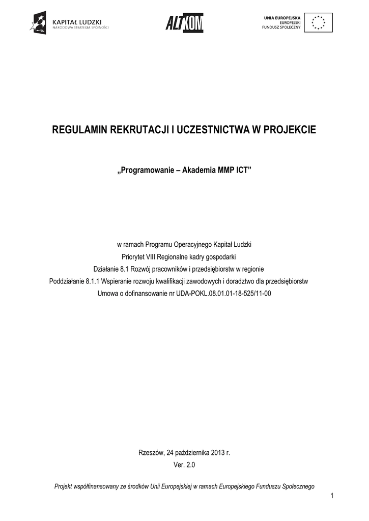 REGULAMIN REKRUTACJI I UCZESTNICTWA W PROJEKCIE „Programowanie – Akademia MMP ICT” w ramach Programu Operacyjnego Kapitał Ludzki Priorytet VIII Regionalne kadry gospodarki Działanie 8.1 Rozwój pracowników i przedsiębiorstw w regionie Poddziałanie 8.1.1 Wspieranie rozwoju kwalifikacji zawodowych i doradztwo dla przedsiębiorstw Umowa o dofinansowanie nr UDA-POKL.08.01.01-18-525/11-00 Rzeszów, 24 października 2013 r. Ver. 2.0 Projekt współfinansowany ze środków Unii Europejskiej w ramach Europejskiego Funduszu Społecznego 1 §1 PRZEPISY OGÓLNE 1. Regulamin określa warunki rekrutacji i uczestnictwa Uczestników Projektu w ramach projektu „Programowanie – Akademia MMP ICT” realizowanego w ramach Programu Operacyjnego Kapitał Ludzki, Priorytet VIII Regionalne kadry gospodarki, Działanie 8.1 Rozwój pracowników i przedsiębiorstw w regionie, Poddziałanie 8.1.1 Wspieranie rozwoju kwalifikacji zawodowych i doradztwo dla przedsiębiorstw. 2. Projekt jest współfinansowany przez Unię Europejską w ramach Europejskiego Funduszu Społecznego. 3. Wszystkie decyzje podejmowane w oparciu o regulamin są zgodne z umową nr UDA POKL.08.01.01-18-525/11-00 o dofinansowanie projektu „Programowanie – Akademia MMP ICT” z dnia 10 grudnia 2012 roku, zawartą pomiędzy Altkom Akademia S.A., a Wojewódzkim Urzędem Pracy w Rzeszowie. 4. Okres realizacji projektu: 01.11.2012 roku – 31.03.2014 roku. 5. Obszar realizacji projektu: województwo podkarpackie. §2 SŁOWNIK POJĘĆ Użyte w niniejszym Regulaminie pojęcia, oznaczają: 1. Beneficjent/Wnioskodawca / Akademia – Altkom Akademia S.A.; 2. Instytucja Pośrednicząca – Wojewódzki Urząd Pracy w Rzeszowie; 3. Uczestnik Projektu – osoba zakwalifikowana zgodnie z zasadami określonymi w niniejszym regulaminie do udziału w Projekcie, bezpośrednio korzystająca z wdrażanych szkoleń; 4. Projekt – Projekt „Programowanie – Akademia MMP ICT”; 5. PO KL – Program Operacyjny Kapitał Ludzki; 6. Biuro Projektu – Ul. Śniadeckich 5, 35-006 Rzeszów 7. EFS – Europejski Fundusz Społeczny. §3 CEL PROJEKTU 1. Celem głównym projektu jest wzmocnienie potencjału wiedzy 70 mikro i małych przedsiębiorstw z branży ICT poprzez podniesienie kwalifikacji 100 informatyków z maksymalnie średnim wykształceniem w województwie podkarpackim. 2. Cel główny zostanie osiągnięty do 31 marca 2014 r. w województwie podkarpackim przez spełnienie celów szczegółowych tj.: a. Wzrost kwalifikacji 100 informatyków z MMP (w tym min. 20% kobiet) z maksymalnie średnim wykształceniem, w zakresie tworzenia oprogramowania. b. Uzyskanie kwalifikacji potwierdzonych nadaniem certyfikatów kompetencji 80 (w tym min. 20% kobiet) programistom IT z maksymalnie średnim wykształceniem. c. Wzrost dostępu do wysokiej jakości wiedzy i kapitału ludzkiego o odpowiednich kwalifikacjach 70 mikro i małych przedsiębiorstw. Projekt współfinansowany ze środków Unii Europejskiej w ramach Europejskiego Funduszu Społecznego 2 §4 GRUPA DOCELOWA 1. Grupę docelową stanowią mikro-, małe przedsiębiorstwa, prowadzące działalność w branży przechodzącej procesy adaptacyjne i modernizacyjne w sektorze wysokiej szansy – usług informatycznych, w tym osoby samozatrudnione posiadające jednostkę organizacyjną (siedzibę, oddział, filię) w woj. podkarpackim i ich pracownicy/pracownice zatrudnieni/zatrudnione na podstawie umowy o pracę, zamieszkali/łe lub pracujący/e na terenie woj. podkarpackim, zwani dalej uczestnikami projektu – ogółem 100 osób (w tym min. 20 kobiet). 2. Uczestnicy projektu to osoby z wykształceniem maksymalnie średnim. 3. W szkoleniach nie mogą brać udziału osoby zatrudnione na umowy cywilno prawne. 4. Pierwszeństwo udziału w projekcie mają firmy spoza podregionu rzeszowskiego. §5 ZGŁOSZENIE UCZESTNICTWA 1. Wstępne zgłoszenie uczestnictwa w szkoleniach oferowanych przez Akademię odbywa się przez wypełnienie, podpisanie oraz przesłanie Karty zgłoszenia wraz z zapotrzebowaniem na szkolenia. Dokument stanowi zbiór podstawowych informacji dotyczących Przedsiębiorcy oraz szkoleń będących przedmiotem jego zainteresowania. 2. Karta Zgłoszenia powinna być dostarczona do Biura Projektu lub przesłana pocztą elektroniczną na adres [email protected] . W przypadku braku takiej możliwości dokumenty powinny zostać przesłane faksem na numer: 17 783 55 00. 3. Przesłana Karta Zgłoszenia nie gwarantuje uczestnictwa w wybranym szkoleniu. 4. Na podstawie nadesłanych Kart Zgłoszenia stanowiących deklarację uczestnictwa Przedsiębiorcy w szkoleniu Akademia dokona wyboru zgłoszeń kierując się założeniami i celami projektu. 5. Akademia zastrzega sobie prawo zaproponowania innych warunków szkolenia, bądź odmowy przeprowadzenia szkolenia wskazanego w zapotrzebowaniu. 6. Informacja o kwalifikacji oraz warunkach przeprowadzania szkolenia zostanie przekazana Przedsiębiorcy pocztą elektroniczną na adres wskazany na Karcie Zgłoszenia lub, w przypadku braku powyższego, telefonicznie pod numer wskazany tamże. §6 REKRUTACJA 1. Proces rekrutacji przebiegać będzie zgodnie z zasadą równego traktowania płci odnoszącą się do równości szans, praw, korzyści. 2. Liczba osób do przeszkolenia: 100 w tym samozatrudnieni: 44 w tym zatrudnieni w mikroprzedsiębiorstwach: 12 w tym zatrudnieni w małych przedsiębiorstwach: 44 3. Liczba przedsiębiorstw objętych wsparciem Mikroprzedsiębiorstwa: 52 Małe przedsiębiorstwa: 18 4. Rekrutacja prowadzona będzie w trybie ciągłym (do czasu wykorzystania limitu miejsc) przy wsparciu działań informacyjno-promocyjnych. 5. O przyjęciu Uczestnika do udziału w Projekcie decyduje spełnienie kryteriów formalnych określonych w dokumentach programowych POKL i wniosku o dofinasowanie Projektu. Projekt współfinansowany ze środków Unii Europejskiej w ramach Europejskiego Funduszu Społecznego 3 6. Do wzięcia udziału w Projekcie wymagane 