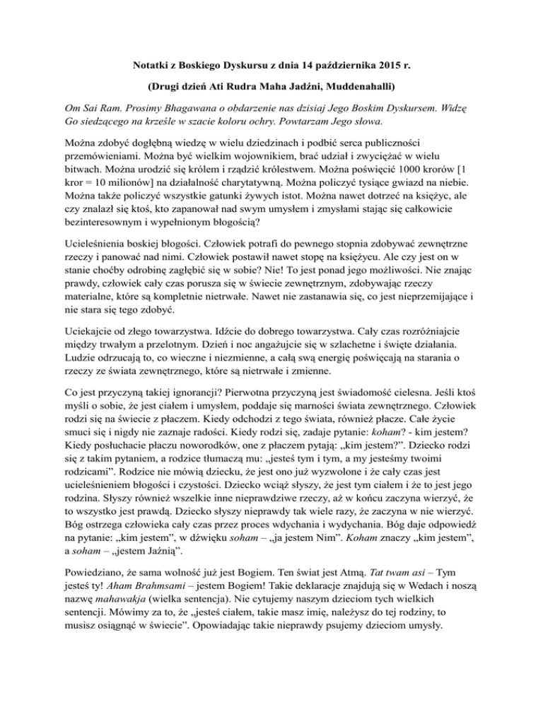 Notatki z Boskiego Dyskursu z dnia 14 października 2015 r. (Drugi dzień Ati Rudra Maha Jadźni, Muddenahalli) Om Sai Ram. Prosimy Bhagawana o obdarzenie nas dzisiaj Jego Boskim Dyskursem. Widzę Go siedzącego na krześle w szacie koloru ochry. Powtarzam Jego słowa. Można zdobyć dogłębną wiedzę w wielu dziedzinach i podbić serca publiczności przemówieniami. Można być wielkim wojownikiem, brać udział i zwyciężać w wielu bitwach. Można urodzić się królem i rządzić królestwem. Można poświęcić 1000 krorów [1 kror = 10 milionów] na działalność charytatywną. Można policzyć tysiące gwiazd na niebie. Można także policzyć wszystkie gatunki żywych istot. Można nawet dotrzeć na księżyc, ale czy znalazł się ktoś, kto zapanował nad swym umysłem i zmysłami stając się całkowicie bezinteresownym i wypełnionym błogością? Ucieleśnienia boskiej błogości. Człowiek potrafi do pewnego stopnia zdobywać zewnętrzne rzeczy i panować nad nimi. Człowiek postawił nawet stopę na księżycu. Ale czy jest on w stanie choćby odrobinę zagłębić się w sobie? Nie! To jest ponad jego możliwości. Nie znając prawdy, człowiek cały czas porusza się w świecie zewnętrznym, zdobywając rzeczy materialne, które są kompletnie nietrwałe. Nawet nie zastanawia się, co jest nieprzemijające i nie stara się tego zdobyć. Uciekajcie od złego towarzystwa. Idźcie do dobrego towarzystwa. Cały czas rozróżniajcie między trwałym a przelotnym. Dzień i noc angażujcie się w szlachetne i święte działania. Ludzie odrzucają to, co wieczne i niezmienne, a całą swą energię poświęcają na starania o rzeczy ze świata zewnętrznego, które są nietrwałe i zmienne. Co jest przyczyną takiej ignorancji? Pierwotna przyczyną jest świadomość cielesna. Jeśli ktoś myśli o sobie, że jest ciałem i umysłem, poddaje się marności świata zewnętrznego. Człowiek rodzi się na świecie z płaczem. Kiedy odchodzi z tego świata, również płacze. Całe życie smuci się i nigdy nie zaznaje radości. Kiedy rodzi się, zadaje pytanie: koham? - kim jestem? Kiedy posłuchacie płaczu noworodków, one z płaczem pytają: „kim jestem?”. Dziecko rodzi się z takim pytaniem, a rodzice tłumaczą mu: „jesteś tym i tym, a my jesteśmy twoimi rodzicami”. Rodzice nie mówią dziecku, że jest ono już wyzwolone i że cały czas jest ucieleśnieniem błogości i czystości. Dziecko wciąż słyszy, że jest tym ciałem i że to jest jego rodzina. Słyszy również wszelkie inne nieprawdziwe rzeczy, aż w końcu zaczyna wierzyć, że to wszystko jest prawdą. Dziecko słyszy nieprawdy tak wiele razy, że zaczyna w nie wierzyć. Bóg ostrzega człowieka cały czas przez proces wdychania i wydychania. Bóg daje odpowiedź na pytanie: „kim jestem”, w dźwięku soham – „ja jestem Nim”. Koham znaczy „kim jestem”, a soham – „jestem Jaźnią”. Powiedziano, że sama wolność już jest Bogiem. Ten świat jest Atmą. Tat twam asi – Tym jesteś ty! Aham Brahmsami – jestem Bogiem! Takie deklaracje znajdują się w Wedach i noszą nazwę mahawakja (wielka sentencja). Nie cytujemy naszym dzieciom tych wielkich sentencji. Mówimy za to, że „jesteś ciałem, takie masz imię, należysz do tej rodziny, to musisz osiągnąć w świecie”. Opowiadając takie nieprawdy psujemy dzieciom umysły. Dziecko rodzi się kompletnie czyste i uświęcone, ale ludzie opowiadając im nieprawdy powodują, że dziecko staje się nieczyste i nieświęte. Prawda jest taka, że wy nie jesteście ciałem, ciało jest wasze! Nie jesteście umysłem – umysł jest wasz! Jesteście Atmą. Wedy twierdzą: „Ja jestem Atmą”. Nawet po angielsku możecie mówić: „I Am Atma, I Am Atma” – ja jestem Atmą, ja jestem Atmą. W jakim języku byście nie mówili, prawda jest jedna i ta sama. Ponieważ angażujemy się w aktywność ciała i umysłu, marnujemy nasze życie zawsze wierząc w nieprawdę. Jest taka prosta historia z Upaniszad. Nowonarodzone lwiątko zostało oddzielone od matki. Samotnie błąkało się po lesie. W końcu spotkało stado owiec i zaczęło żyć razem z nimi. Chociaż był to lew, ponieważ przebywał w towarzystwie owiec, zaczął zachowywać się jak owca. Owce zawsze są lękliwe. Kiedy przestraszą się czegoś, całym stadem zaczynają uciekać. Pewnego dnia, kiedy lwiątko wędrowało razem z owcami, rozległ się ryk lwa. Owce rzuciły się do ucieczki. Ale lwiątko zainteresowało się, skąd dochodził ten dźwięk. Nigdy wcześniej nie słyszało tak zdumiewającego, wspaniałego głosu. Lwiątko pomyślało: „Powinienem sprawdzić, skąd pochodzi ten ryk” – i pobiegło w przeciwną stronę niż owce. Owce miały swojego przewodnika stada. Przywołał on lwiątko i zapytał: „Dokąd idziesz?”. Lew odparł: „Co za wspaniały ryk, nigdy takiego nie słyszałem. Chcę wiedzieć, skąd on się dobywa”. Przewodnik powiedział: „To jest ryk lwa! Nie powinieneś tam iść. To niebezpieczne. Chodź z nami”. Lwiątko odparło: „Nie mam zamiaru iść z wami. Chcę poznać źródło dźwięku”. I ruszyło w przeciwną stronę. Owce pozostawiły je samemu sobie. Po jakimś czasie lwiątko ujrzało lwa. Wielki lew spojrzał na lwiątko i zdziwił się: „Co ty robisz wśród owiec?”. „Ja też jestem owcą, chodzę ze stadem” – odparło lwiątko. Lew powiedział: „Ty jesteś małym lwem!”. Na to lwiątko: „Beczę jak owca, jem jak owca, więc jestem owcą”. Wtedy lew powiedział mu: „Popełniłeś błąd i wybrałeś towarzystwo owiec, więc teraz popełniasz błąd i uważasz się za owcę”. Powiedz mi, jakie masz towarzystwo, a powiem ci, kim jesteś. Jeśli przebywasz w towarzystwie głupców, ty również staniesz się głupcem. Zatem powinniśmy wejść w towarzystwo uczonych i dobrych, świętych ludzi. Dlatego powinniście uciekać od złego towarzystwa i przebywać w dobrym towarzystwie. D