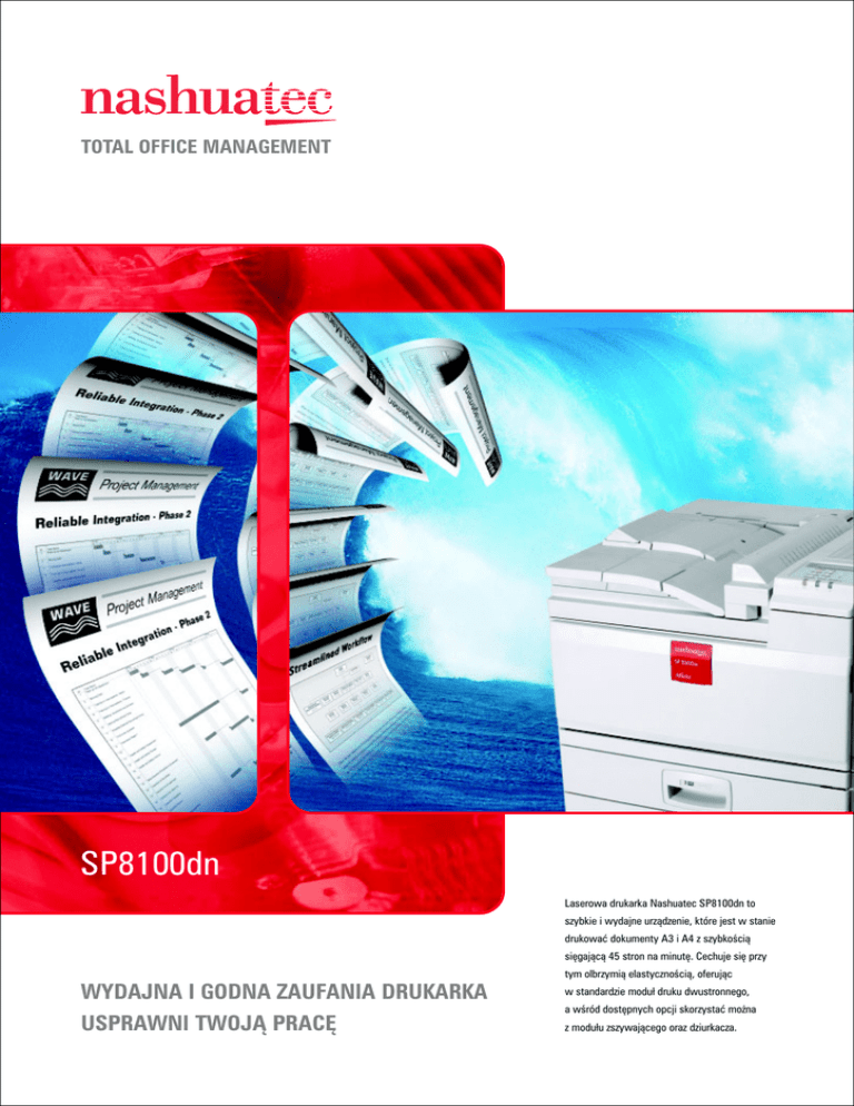 TOTAL OFFICE MANAGEMENT SP8100dn Laserowa drukarka Nashuatec SP8100dn to szybkie i wydajne urządzenie, które jest w stanie drukować dokumenty A3 i A4 z szybkością sięgającą 45 stron na minutę. Cechuje się przy WYDAJNA I GODNA ZAUFANIA DRUKARKA USPRAWNI TWOJĄ PRACĘ tym olbrzymią elastycznością, oferując w standardzie moduł druku dwustronnego, a wśród dostępnych opcji skorzystać można z modułu zszywającego oraz dziurkacza. Wydajność i opłacalność Wysoce niezawodna SP8100dn jest laserową drukarką formatu A3, która jest w stanie drukować z szybkością 45 stron A4 na minutę. Dzięki niskim kosztom eksploatacji i standardowemu modułowi druku dwustronnego znacznie obniża koszty biura. Dzięki połączeniu krótkich czasów nagrzewania i uzyskania pierwszej strony drukarka dostarcza wydruki niemal natychmiast i nie spowalnia swojej pracy nawet przy druku dwustronnym. Poprawa wydajności i produktywności Urządzenie to jest kompatybilne ze wszystkimi uznanymi standardami języków drukarek, dzięki czemu dostęp do wydajnego biurowego druku jest niczym nie zakłócony. Funkcja PDF Direct Print pozwala na drukowanie dokumentów PDF bez korzystania ze sterownika. Dane wysyłane są bezpośrednio do drukarki, co przyczynia się do mniejszego obciążenia systemu informatycznego i gwarantuje poprawny wydruk w każdym środowisku. SP8100DN jest kompatybilna z większością środowisk, w których drukuje się duże nakłady. Łatwo integruje się z systemami SAP R/ 3, IBM AIX, Novell, Windows czy Linux. Pełne rozwiązanie sieciowego drukowania Nashuatec SP8100dn jest drukarką gotową natychmiast do pracy w sieci lokalnej, skorzystać można również z opcji rozszerzających jej funkcjonalność w nowoczesnych sieciach bezprzewodowych, takich jak Wireless LAN, czy Bluetooth. Dostępne jest także złącze w standardzie USB 2.0 oraz opcjonalnie Gigabit Ethernet. Duże dokumenty, które są często drukowane mogą być przechowywane na dysku twardym urządzenia poprawiając wydajność pracy. Funkcja wstrzymania wydruku gwarantuje, że nasz wydruk nie wymiesza się na tacy odbiorczej z innymi pracami. Będzie czekał w pamięci drukarki, aż użytkownik wprowadzi z panelu swój numer PIN. Elastyczne zarządzanie papierem Opcjonalny finiszer pozwala sortować, zszywać, czy też dziurkować prace o objętości do 3000 arkuszy. Dodatkowe kasety na papier i opcjonalna kaseta o wysokiej pojemności sprawiają, że drukarka Nashuatec SP8100dn może pomieścić aż 3550 arkuszy papieru. Urządzenie bez problemów drukuje na różnych nośnikach, takich jak koperty, folie, etykiety czy też na papierze z makulatury. Wygodne administrowanie Nashuatec SP8100dn czyni zarządzanie dokumentami oraz drukowanie łatwym i bezpiecznym. Oprogramowanie DeskTop Binder oferuje bardzo łatwe zarządzanie, przeglądanie i drukowanie dokumentów. Daje możliwość łączenia dokumentów pochodzących z różnych źródeł, zwiększając efektywność komunikacji. Dzięki systemowi ochrony danych wszystkie tymczasowe informacje zapisywane na opcjonalnym twardym dysku są usuwane. Ma to duże znaczenie w środowiskach, gdzie szczególny nacisk kładzie się na bezpieczeństwo. www.nashuatec.pl Specyfikacja techniczna SP8100dn Szybkość Procesor Rozdzielczość rzeczywista Czas druku pierwszej strony Pamięć 45 stron A4 na minutę (jedno- oraz dwustronnie) RM7035C 466 MHz 600 dpi do 5,9 sekundy standardowa: 128 MB opcjonalna:maksymalnie 512 MB, dysk twardy 40 GB Języki druku PCL5e, PCL6, RPCS™, Adobe® Postscript® 3™, PDF Direct Print Czcionki 59 czcionek PCL, 136 czcionek PostScript 3 Porty standardowe USB 2.0, Ethernet 10/100BaseTX Porty opcjonalne Port równoległy (IEEE 1284), Wireless LAN (IEEE 802.11b), Gigabit Ethernet, USB host I/F Formaty papieru A3 - A5 Gramatura papieru 52 - 163 g/m2 Standardowa pojemność papieru kasety 2 x 500 arkuszy, podajnik ręczny 50 arkuszy Maksymalna pojemność papieru 3550 arkuszy Moduł druku dwustronnego standard Zasilanie 220-240V, 50/60 Hz Pobór mocy Mniej niż 9W w trybie Energy Star, maksymalnie 1,45 kW Wymiary (szer. x głęb. x wys.) 670 x 640 x 650 mm Waga Do 64 kg oprogramowanie DeskTop Binder Lite™ WebImage Monitor SmartDevice Monitor™ Web SmartDevice Monitor™ Printer Utility dla Macintosh® Font Manager 2000 opcje Pamięć 128/256 MB SDRAM DIMM Dysk twardy 40 GB (niezbędny dla funkcji druku poufnego, próbnego i systemu ochrony danych) Port równoległy IEEE 1284 Wireless LAN IEEE 802.11b Gigabit Ethernet USB Host I/F System ochrony danych Karta VM Karta przechowywania danych Moduł rozszerzenia knot użytkownika Dwie kasety po 500 arkuszy papieru każda Kaseta dużej pojemności LCT na 1500 arkuszy Finiszer na 3000 arkuszy Moduł mostka Wszystkie produkty Nashuatec spełniają normy jakości ISO 9001 oraz ochrony środowiska naturalnego ISO 14001. Zastrzegamy sobie prawo do wprowadzenia zmian w specyfikacji technicznej oraz wyglądzie produktów. Pełna gama produktów pokazana w tej publikacji może nie być zawsze dostępna. Wszystkie marki, nazwy i znaki towarowe należą do ich prawnych właścicieli.