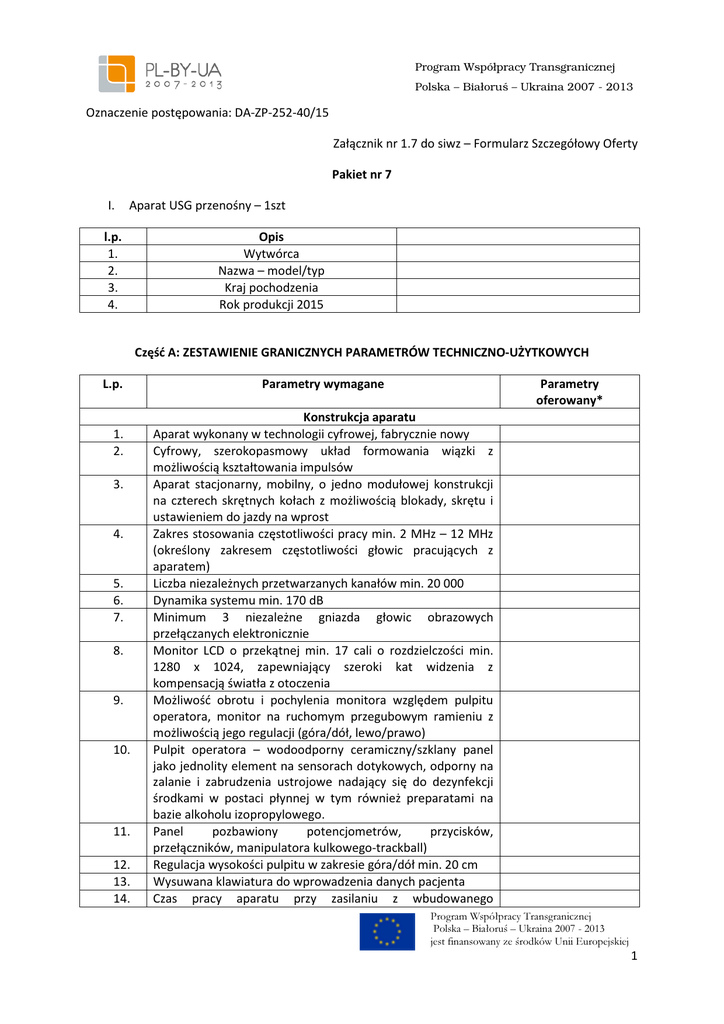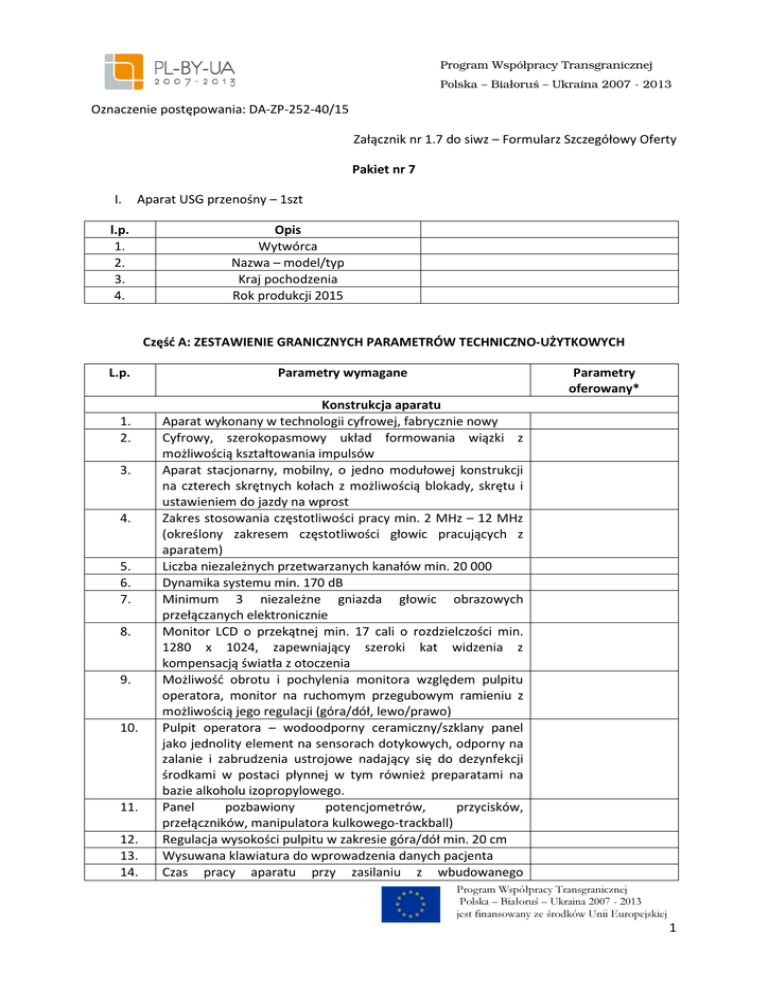 Program Współpracy Transgranicznej Polska – Białoruś – Ukraina 2007 - 2013 Oznaczenie postępowania: DA-ZP-252-40/15 Załącznik nr 1.7 do siwz – Formularz Szczegółowy Oferty Pakiet nr 7 I. Aparat USG przenośny – 1szt l.p. 1. 2. 3. 4. Opis Wytwórca Nazwa – model/typ Kraj pochodzenia Rok produkcji 2015 Część A: ZESTAWIENIE GRANICZNYCH PARAMETRÓW TECHNICZNO-UŻYTKOWYCH L.p. 1. 2. 3. 4. 5. 6. 7. 8. 9. 10. 11. 12. 13. 14. Parametry wymagane Parametry oferowany* Konstrukcja aparatu Aparat wykonany w technologii cyfrowej, fabrycznie nowy Cyfrowy, szerokopasmowy układ formowania wiązki z możliwością kształtowania impulsów Aparat stacjonarny, mobilny, o jedno modułowej konstrukcji na czterech skrętnych kołach z możliwością blokady, skrętu i ustawieniem do jazdy na wprost Zakres stosowania częstotliwości pracy min. 2 MHz – 12 MHz (określony zakresem częstotliwości głowic pracujących z aparatem) Liczba niezależnych przetwarzanych kanałów min. 20 000 Dynamika systemu min. 170 dB Minimum 3 niezależne gniazda głowic obrazowych przełączanych elektronicznie Monitor LCD o przekątnej min. 17 cali o rozdzielczości min. 1280 x 1024, zapewniający szeroki kat widzenia z kompensacją światła z otoczenia Możliwość obrotu i pochylenia monitora względem pulpitu operatora, monitor na ruchomym przegubowym ramieniu z możliwością jego regulacji (góra/dół, lewo/prawo) Pulpit operatora – wodoodporny ceramiczny/szklany panel jako jednolity element na sensorach dotykowych, odporny na zalanie i zabrudzenia ustrojowe nadający się do dezynfekcji środkami w postaci płynnej w tym również preparatami na bazie alkoholu izopropylowego. Panel pozbawiony potencjometrów, przycisków, przełączników, manipulatora kulkowego-trackball) Regulacja wysokości pulpitu w zakresie góra/dół min. 20 cm Wysuwana klawiatura do wprowadzenia danych pacjenta Czas pracy aparatu przy zasilaniu z wbudowanego Program Współpracy Transgranicznej Polska – Białoruś – Ukraina 2007 - 2013 jest finansowany ze środków Unii Europejskiej 1 Program Współpracy Transgranicznej Polska – Białoruś – Ukraina 2007 - 2013 15. 16. 17. 18. 19. 20. 21. 22. 23. 24. 25. 26. 27. 28. 29. 30. 31. 32. 33. 34. akumulatora po wyłączeniu urządzenia z prądu minimum 2 godziny Nagrywarka CD/DVD wbudowana w aparat Zintegrowany z aparatem system archiwizacji obrazów na wbudowanym dysku twardym o pojemności min. 320 GB z możliwością eksportowania danych na nośniki przenośne DVD w formatach kompatybilnych z systemem Windows oraz DICOM Złącze sieci LAN do podłączenia siecią DICOM i zdalnym serwisem Wyjście video: VGA Aktywne porty USB do archiwizacji obrazów statycznych oraz dynamicznych na przenośne pamięci typu Flash Pendrive Zasilanie 220-240 V 50 Hz Elementy obrazowania Głębokość penetracji/obrazowania 2D (B-mode) w minimalnym wymaganym zakresie od 1 do 30 cm Częstotliwość odświeżania obrazu („frame ratę”) w trybie 2D (B-mode) min. 750 obrazów/sekundę. Minimalnie pięciokrotne powiększanie bez straty rozdzielczości obrazu w czasie rzeczywistym (tzw. zoom) Dostępne obrazowanie harmoniczne i obrazowanie z inwersją fazy Maksymalna liczba klatek (obrazów) przechowywania jednorazowo w pamięci dynamicznej (CINE LOOP) w trybie Bmode oraz kolor Doppler min. 1000 obrazów. Możliwość minimalnej trzy strefowej regulacji wzmocnienia poprzecznego wiązki TGC. Możliwość płynnej zmiany szerokości wyświetlanego obrazu 2D (B-mode) dla wszystkich oferowanych głowic Możliwość podziału obrazu na dwa i jednoczesne wyświetlanie obrazów w czasie rzeczywistym typu B+B, B+B/CD Możliwość porównania na ekranie obrazów z archiwum z obrazami w czasie rzeczywistym Funkcja redukująca szumy adaptacyjne i artefakty w obrazowaniu 2D (np. SRI) Złożone obrazowanie wielokierunkowe badanych struktur w czasie rzeczywistym (wysyłanie przez te same kryształy głowicy kilku wiązek ultradźwiękowych pod różnymi kątami – np. compounding) Linia środkowa dostępna na głowicy oraz na ekranie w trybie 2D zapewniająca wizualizację toru prowadzenia igły w nawigacji poza płaszczyzną obrazowania. Dostępna siatka na obrazie w trybie 2D pozwalająca ocenić wielkość i odległość do struktury w zabiegach wymagających wprowadzenia igły Minimum 30 ustawień programowanych dla aplikacji i głowic, Program Współpracy Transgranicznej Polska – Białoruś – Ukraina 2007 - 2013 jest finansowany ze środków Unii Europejskiej 2 Program Współpracy Transgranicznej Polska – Białoruś – Ukraina 2007 - 2013 35. 36. 37. 38. 39. 40. 41. 42. 43. 44. 45. 46. 47. 48. tzw. „presetów” Funkcja automatycznej ciągłej optymalizacji obrazu B-Mode (ustawienie jasności, kontrastu obrazu i kompensacji wzmocnienia głębokościowego TGC), nie wymagająca od użytkownika ręcznego uruchomienia. Automatyczna optymalizacja obrazu w trybie Dopplera PW (m. in. Dopasowanie linii bazowej i PRF/skali oraz wzmocnienie spektrum) dostępna na wszystkich głowicach Tryby obrazowania: Tryby pracy: B-mode (2D) Doppler Kolorowy (CD) Power Doppler oraz Kierunkowy Power Doppler z detekcją kierunku przepływu (CPA) Spektralny Doppler Pulsacyjny (PW) z wysoką częstotliwością przetwarzania HPRF Spektralny Doppler fali ciągłej (CW) M-mode, kolor M-mode, anatomiczny M-Mode Tryb Duplex (2D + PW/CD/CPA) Tryb Duplex (2D +CD/CPA+PW) Maksymalna mierzona prędkość przepływu kolorowego Dopplera (QD) przy zerowej korekcji kata bramki Mn-400 cm/s Regulacja uchylności bramki kolorowego Dopplera w sposób płynny w minimalnym zakresie od - 15°-+15° Częstotliwość odświeżania obrazu w trybie kolorowego Dopplera („frame rate”) min. 160 obrazów/sekundę. Maksymalnie mierzona prędkość przepływu Dopplera PW przy zerowej korekcji kata min. 700 cm/s Szerokość regulacji bramki Dopplera PW w minimalnym zakresie od 0,5 mm do 29 mm Zakres korekcji kąta bramki Dopplera PW w mini