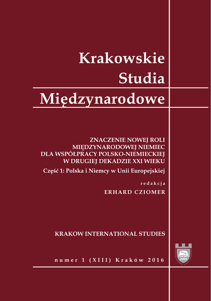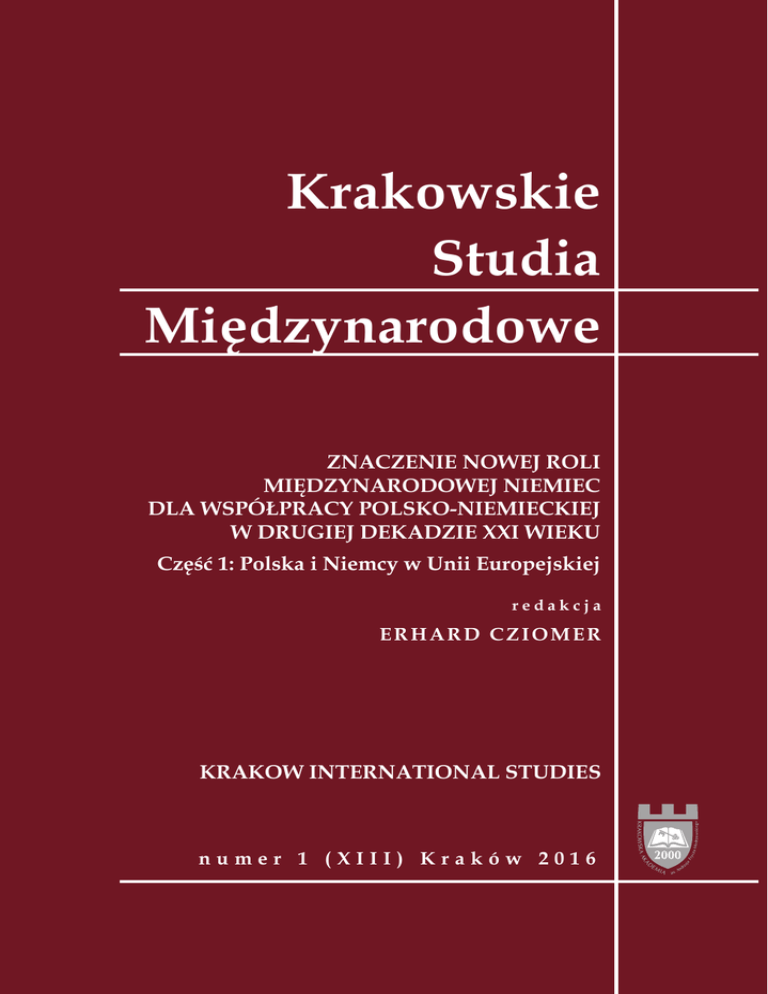 Krakowskie Studia Międzynarodowe ZNACZENIE NOWEJ ROLI MIĘDZYNARODOWEJ NIEMIEC DLA WSPÓŁPRACY POLSKO-NIEMIECKIEJ W DRUGIEJ DEKADZIE XXI WIEKU Część 1: Polska i Niemcy w Unii Europejskiej redakcja ERHARD CZIOMER KRAKOW INTERNATIONAL STUDIES numer 1 (XIII) Kraków 2016 THE BASIC INFORMATION FOR AUTHORS Footnotes and Commentary about Author(s): Place notes at the bottom of the page as footnotes rather than at the end of the text as endnotes. Number them consecutively throughout the essay. Do not place a footnote number or an asterisk after the author’s name following the title of the article. Numbered footnotes should be used only in the body text. Commentary about the author(s) should be placed under a rule at the bottom of the first page, without a footnote number, asterisk, or other symbol. Spacing: Text should be single-spaced, including block quotations, footnotes, captions, legends, and long headings, which should be single-spaced with a space between the items. Use only one space after punctuation marks. Type Face and Size: All manuscripts should be in Times New Roman. A subtitle should be in 12-point bold type. Use 12-point type for text, headings, and subheadings. First-level headings should be flushleft and in bold type. Second-level headings should flush-left and in bold italics. Use 10-point type for footnotes, commentary about the author(s), and all source and note information placed directly under tables and figures. Tables and Figures: Tables and figures should be properly cited and all aspects must be clearly legible. Do not use any bold-face type. Headings should be centered above tables and figures. Spelling and Citation: For purposes of standardization, citation adheres to Random House Webster’s Unabridged Dictionary and The Chicago Manual of Style: The Essential Guide for Writers, Editors, and Publishers, 15th ed., University of Chicago, Chicago 2003. Examples: a) Books and monographs: Religious Organizations and Democratic Transition in Contemporary Asia, eds. Tun-jen Cheng, D. Brown, New York 2005, p. 17–18. b) Journal articles: J. J. Linz, A. Stepan, „Consolidating New Democracies”, Journal of Democracy 1996, Vol. 7, No. 2, p. 14–33. c) Chapters in books: N. Jayawickarama, “Hong Kong and the International Protection of Human Rights,” [in:] Human Rights in Hong Kong, ed. R. Wacks, Hong Kong 1992, p. 121. d) Articles in newspapers: D. J. Wakin, I. Fisher, “Cardinals Begin Conclave to Elect a New Pope,” New York Times, April 18, 2005, p. A1. e) Citation of electronic publications: Citations of electronic sources should accomplish the same ends as citation of print sources. The format also should be analogous to that for print sources. Please supply author’s name, title of article, and other pertinent data, so that those who cannot locate the material through a stated address might be able to find it through a network searching tool. Give the complete address, including access mode identifier, the publisher’s domain name, and after the first single slash, relevant path and file names. Example: M. Ashraf Haidari, “Eurasia Insight: Paris Conference – Aid Effectiveness Key to Addressing Afghanistan’s Rebuilding Challenges,” EurasiaNet, 2008, www.eurasianet.org/departments/insight/articles/ eav061208f.html [accessed June 14, 2008]. Texts for publication should be mail to: Krakow International Studies, Andrzej Frycz Modrzewski Krakow University, ul. Herlinga-Grudzińskiego 1, 30-705 Kraków (Poland) or e-mail: [email protected] RULES AND REGULATIONS CONCERNING PUBLISHING PAPERS IN KRAKOW INTERNATIONAL STUDIES 1. All papers sent to Krakow International Studies by their respective authors undergo preliminary assessment by the Editor-in-Chief. 2. The initial assessment results in the decision whether to send the work for an independent review or return it to the author with the information that it will be not published. 3. Two independent reviewers for “internal reviews” are appointed by the Editor-in-Chief or by the Deputy Editor following consultation with the Editor-in-Chief. 4. The following cannot be independent reviewers: Editor-in–Chief, Deputy Editor-in-Chief, employees of Andrzej Frycz Modrzewski Krakow University, and people with papers published in the issue containing the reviewed paper. 5. The internal review should answer the question whether the reviewed paper is fit for printing and whether it requires any amendments, and if it does, state what they are, and must be in written form, and conclude in an unequivocal verdict concerning publication or rejection of an article. 6. If one of the reviewers provides comments and amendments, but does not disqualify the paper, the Editor pass the comments on to the author, asking for the author’s opinion and any amendments. 7. Should the opinions of the author and reviewer diverge, the decision to print the paper or otherwise Projekt Wyzwania nowej międzynarodowej roli Niemiec w dobie globalizacji oraz kryzysów gospodarczo-finansowych i politycznych po 2007 roku, cz. 2. Implikacje wzrostu międzynarodowej roli Niemiec dla współpracy polsko-niemieckiej w drugiej dekadzie XXI wieku wydano z finansowym wsparciem Fundacji Współpracy Polsko-Niemieckiej Herausgegeben mit finanzieller Unterstützung der S ung für deutsch-polnische Zusammenarbeit Krakowskie Studia Międzynarodowe ZNACZENIE NOWEJ ROLI MIĘDZYNARODOWEJ NIEMIEC DLA WSPÓŁPRACY POLSKO-NIEMIECKIEJ W DRUGIEJ DEKADZIE XXI WIEKU Część 1: Polska i Niemcy w Unii Europejskiej redakcja ERHARD CZIOMER KRAKOW INTERNATIONAL STUDIES numer 1 (XIII) Kraków 2016 XIII: 2016 nr 1 Czasopismo Krakowskiej Akademii im. Andrzeja Frycza Modrzewskiego/Journal of Andrzej Frycz Modrzewski Krakow University www.ksm.ka.edu.pl Rada wydawnicza/Publisher Council of the Andrzej Frycz Modrzewski Krakow University: Klemens Budzowski, Maria Kapiszewska, Zbigniew Maciąg, Jacek Majchrowski Rada programowa „Krakowskich Studiów Międzynarodowych”