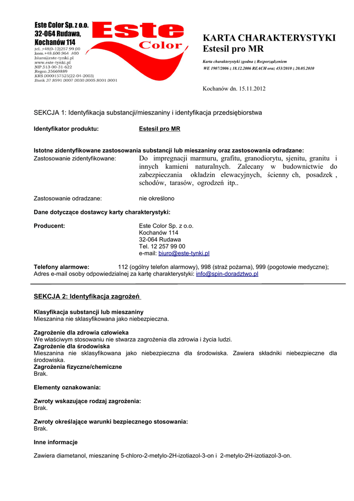 KARTA CHARAKTERYSTYKI Estesil pro MR Karta charakterystyki zgodna z Rozporządzeniem WE 1907/2006 z 18.12.2006 REACH oraz 453/2010 z 20.05.2010 Kochanów dn. 15.11.2012 SEKCJA 1: Identyfikacja substancji/mieszaniny i identyfikacja przedsiębiorstwa Identyfikator produktu: Estesil pro MR Istotne zidentyfikowane zastosowania substancji lub mieszaniny oraz zastosowania odradzane: Zastosowanie zidentyfikowane: Do impregnacji marmuru, grafitu, granodiorytu, sjenitu, granitu i innych kamieni naturalnych. Zalecany w budownictwie do zabezpieczania okładzin elewacyjnych, ścienny ch, posadzek , schodów, tarasów, ogrodzeń itp.. Zastosowanie odradzane: nie określono Dane dotyczące dostawcy karty charakterystyki: Producent: Este Color Sp. z o.o. Kochanów 114 32-064 Rudawa Tel. 12 257 99 00 e-mail: [email protected] Telefony alarmowe: 112 (ogólny telefon alarmowy), 998 (straż pożarna), 999 (pogotowie medyczne); Adres e-mail osoby odpowiedzialnej za kartę charakterystyki: [email protected] SEKCJA 2: Identyfikacja zagrożeń Klasyfikacja substancji lub mieszaniny Mieszanina nie sklasyfikowana jako niebezpieczna. Zagrożenie dla zdrowia człowieka We właściwym stosowaniu nie stwarza zagrożenia dla zdrowia i życia ludzi. Zagrożenie dla środowiska Mieszanina nie sklasyfikowana jako niebezpieczna dla środowiska. Zawiera składniki niebezpieczne dla środowiska. Zagrożenia fizyczne/chemiczne Brak. Elementy oznakowania: Zwroty wskazujące rodzaj zagrożenia: Brak. Zwroty określające warunki bezpiecznego stosowania: Brak. Inne informacje Zawiera diametanol, mieszaninę 5-chloro-2-metylo-2H-izotiazol-3-on i 2-metylo-2H-izotiazol-3-on. Może powodować wystąpienie reakcji alergicznej. Karta charakterystyki dostępna na żądanie użytkownika prowadzącego działalność zawodową. Inne zagrożenia: Brak innych zagrożeń. Brak informacji na temat spełnienia kryteriów PBT lub vPvB zgodnie z załącznikiem XIII rozporządzenia REACH. Odpowiednie badania nie były przeprowadzone. SEKCJA 3: Skład/informacja o składnikach Substancje: Nie dotyczy. Mieszaniny: Niebezpieczne składniki: Klasyfikacja CLP Identyfikator produktu azol-3-on 5-c 5-chloro-2-metylo-2H-izotiazol-3on Nr WE: 247-500-7 2-metylo-2H-izotiazol-3-on Nr WE:220-239-6 Nr CAS: 55965-84-9 Nr REACH: substancja podlega przepisom okresu przejściowego diametanol Nr CAS:3586-55-8 Nr WE: -222-720-6 Nr REACH: substancja podlega przepisom okresu przejściowego Zawartość % Klasyfikacja wg 67/548/EWG T: R23/24/25 C: R34 <0,003 Xn: R22 Klasa zagrożenia i kody kategorii Kody zwrotów wskazujących rodzaj zagrożenia Acute Tox. 3 Skin Corr. 1B Acute Tox. 4 Skin Sens. 1 Aquatic Acute 1 Aquatic Chronic 1 H331 H311 H302 H314 H317 H400 H410 Acute Tox. 3 Skin Corr. 1B Skin Sens. 1 Aquatic Acute 1 Aquatic Chronic 1 H331 H311 H301 H314 H317 H400 H410 N: R50/53, R43 <0,015 Xn:R22 Xi R36/37/38 Pełna treść zwrotów R i H w sekcji 16 SEKCJA 4: Środki pierwszej pomocy W przypadku kontaktu ze skórą: Zdjąć zanieczyszczoną odzież, umyć zabrudzoną skórę wodą z mydłem, spłukać dokładnie wodą, w przypadku pojawienia się ewentualnych podrażnień skontaktować się z lekarzem. Nigdy nie używać rozpuszczalników lub rozcieńczalników. W przypadku kontaktu z oczami: Przepłukać oczy przez kilkanaście minut (ok. 15) dużą ilością wody, trzymając powieki szeroko rozwarte. Unikać silnego strumienia, ze względu na niebezpieczeństwo uszkodzenia rogówki. W razie wystąpienia niepokojących, nieustępujących objawów skontaktować się z lekarzem. Narażenie inhalacyjne: W razie zawrotów głowy lub nudności wyprowadzić poszkodowanego na świeże powietrze, w razie braku szybkiej poprawy zasięgnąć porady lekarza. W przypadku połknięcia: Nie wywoływać wymiotów, wypłukać usta dużą ilością wody, natychmiast skonsultować się z lekarzem. Nigdy nie podawać niczego doustnie osobie nieprzytomnej. Najważniejsze ostre i opóźnione objawy oraz skutki narażenia: Układ oddechowy. Wdychanie stężonych par lub pyłów produktu może powodować podrażnienia błon śluzowych nosa, gardła i dalszych odcinków układu oddechowego. Przewód pokarmowy. Spożycie preparatu może powodować podrażnienia chemiczne błon śluzowych jamy ustnej, gardła oraz dalszych odcinków układu pokarmowego. Może powodować objawy zatrucia pokarmowego, nudności, bóle i zawroty głowy, ból żołądka, wymioty. Kontakt z oczami. Może powodować podrażnienia w przypadku bezpośredniego narażenia. Kontakt ze skórą. U osób wrażliwych może powodować wystąpienie reakcji alergicznej. Wskazania dotyczące wszelkiej natychmiastowej pomocy lekarskiej i szczególnego postępowania z poszkodowanym: Decyzję o sposobie postępowania podejmuje lekarz po ocenie stanu poszkodowanego. SEKCJA 5: Postępowanie w przypadku pożaru Środki gaśnicze: Odpowiednie środki gaśnicze: piana alkoholoodporna lub suche proszki gaśnicze (A,B,C), dwutlenek węgla (gaśnica śniegowa), piasek lub ziemia. Stosować metody gaśnicze odpowiednie do warunków otoczenia. Niewłaściwe środki gaśnicze: Silny strumień wody. Szczególne zagrożenia związane z substancją lub mieszaniną: Brak. Informacje dla straży pożarnej: Pojemniki znajdujące się w strefie pożaru chłodzić rozproszonym strumieniem wody, o ile jest to możliwe usunąć ze strefy zagrożenia. W przypadku pożaru w zamkniętym pomieszczeniu należy stosować odzież ochronną i aparat oddechowy na sprężone powietrze . Nie dopuszczać do przedostania się wody gaśniczej do wód powierzchniowych, gruntowych i kanalizacji. SEKCJA 6: Postępowanie w przypadku niezamierzonego uwolnienia do środowiska Indywidualne środki ostrożności, wyposażenie ochronne i procedury w sytuacjach awaryjnych Dla osób nienależących do personelu udzielającego pomocy: zawiadomić o awarii odpowiednie służby. Usunąć z obszaru zagrożenia osoby niebiorące udziału w likwidacji awarii. Dla osób udzielaj