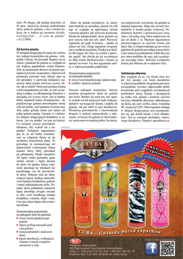alety. Po drugie, jak podają statystyki, aż 85 proc. mężczyzn doznaje podrażnienia skóry podczas golenia, a trzy czwarte kaleczy się w trakcie tej czynności (źródło: www.logo24.pl – „Z czym do golenia” z 6/12/2009). Żel kontra pianka W sklepach drogeryjnych mamy do wyboru trzy rodzaje kosmetyków do golenia – żele, pianki i kremy. Na początek skupmy się na żelach i piankach do golenia ze względu na ich większą popularność wśród klientów. Żele są nieznacznie droższe od pianek (pomijam tu kwestie wyprzedaży i okresowych promocji), powinno więc zależeć nam na ich sprzedaży w pierwszej kolejności, ponieważ sklep uzyska wówczas wyższy obrót. Jak to zrobić? Dość powszechną wiedzą wśród ekspedientek jest fakt, że żele są bardziej wydajne, co rekompensuje klientowi z nawiązką ich wyższy koszt. Jest to bardzo dobry argument natury ekonomicznej – do pojedynczego golenia potrzebujemy mniej żelu niż pianki, czyli pomimo wyższej ceny żelu, jedno golenie żelem jest tańsze niż jedno golenie pianką. Niestety, w większości sklepów drogeryjnych doradztwo w zakresie „żel czy pianka” na tym się kończy. Co możemy jeszcze powiedzieć klientowi, aby wybrał żel a nie piankę? Kolejnym argumentem jest to, że żel trzeba rozsmarować na wilgotnej skórze aż do uzyskania konsystencji piany. To powoduje, że rozmasowując żel jednocześnie wykonujemy formę masażu skóry, który powoduje jej pobudzenie. Dzięki masażowi żel lepiej wnika pomiędzy gęste włoski zarostu i lepiej dociera do skóry niż pianka, której większość pozostaje na włoskach nie przedostając się do powierzchni skóry. Dotarcie żelu do skóry oznacza lepszy poślizg maszynki, czyli bardziej komfortowe golenie i mniej mikroskaleczeń skóry. Ponadto skóra pobudzona masażem lepiej absorbuje związki zawarte w żelu, czyli wszelkiego rodzaju kompleksy witamin, olejki i inne. Cera jest zatem lepiej odżywiona i nawilżona. Może się jednak przydarzyć, że zależy nam bardziej na sprzedaży pianek niż żeli (np. ze względu na upływający termin ważności pianek). Jak wówczas przekonać klienta do zakupu pianki, skoro golenie się przy użyciu żelu ma tyle zalet? Pierwszy argument już padł wcześniej – pianki są tańsze niż żele. Drugi argument związany jest z szybkością golenia. Pianka jest idealna dla kogoś, kto chce się szybko i sprawnie ogolić. Już chwilę po jej wyciśnięciu na dłoń rośnie błyskawicznie i można ją nanieść na twarz. I te dwa argumenty należy w takim przypadku podkreślać. sza miejscowość, tym kremy do golenia są chętniej kupowane. Mają one swoich zwolenników w każdej grupie wiekowej. Popularność kremów z pewnością jest związana z ich niską ceną, która rozpoczyna się już od około 2 zł. Ważnym argumentem przemawiającym za użyciem kremu jest także fakt, iż rozprowadzanie go po twarzy pędzlem do golenia powoduje masaż skóry i tym samym jej pobudzenie. Efekt dla cery jest zatem podobny do tego, jaki uzyskujemy używając żeleu. Również wydajności kremu jest zbliżona do wydajności żelu. Zreasumujmy argumenty za zakupem pianki: niższy koszt pojedynczego opakowania szybkie i sprawne golenie Substancje aktywne Bez względu na to, czy klient chce kupić żel, piankę, czy krem doradztwo w zakresie produktów do golenia powinno uwzględniać również odpowiedni dobór kosmetyku pod względem ewentualnych problemów skóry. Każdy z dostępnych na rynku żeli, pianek i kremów zawiera bowiem składniki aktywnie oddziałujące na skórę, np. jony srebra, aloes, witaminę B5, koenzym Q10. Obowiązkiem obsługi w sklepie drogeryjnym jest zaznajomienie się, jak działa każdy z tych składników. Jest to warunek niezbędny właściwego doradztwa. Dopiero sprzedawca Trzecim rodzajem kosmetyku, którym możemy przygotować skórę do golenia jest krem. Bardzo się myli ten, kto sądzi, że zostało wśród mężczyzn mało tradycjonalistów używających kremu i pędzla do golenia, tak jak robili to nasi dziadkowie. Wystarczy porozmawiać z kierownikami drogerii w małych miasteczkach, a usłyszymy, że kremy do golenia to obowiązkowy asortyment na męskiej półce. Im mniej- Zreasumujmy argumenty za zakupem żelu do golenia: niższy koszt pojedynczego golenia lepszy poślizg maszynki podczas golenia mniej podrażnień i skaleczeń skóry lepsze nawilżenie, wchłonięcie witamin i innych związków zawartych w żelu 55 Wiadomości Kosmetyczne – listopad-grudzień 2012