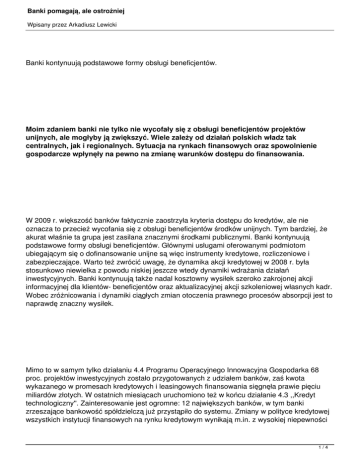 Banki pomagają, ale ostrożniej Wpisany przez Arkadiusz Lewicki Banki kontynuują podstawowe formy obsługi beneficjentów. Moim zdaniem banki nie tylko nie wycofały się z obsługi beneficjentów projektów unijnych, ale mogłyby ją zwiększyć. Wiele zależy od działań polskich władz tak centralnych, jak i regionalnych. Sytuacja na rynkach finansowych oraz spowolnienie gospodarcze wpłynęły na pewno na zmianę warunków dostępu do finansowania. W 2009 r. większość banków faktycznie zaostrzyła kryteria dostępu do kredytów, ale nie oznacza to przecież wycofania się z obsługi beneficjentów środków unijnych. Tym bardziej, że akurat właśnie ta grupa jest zasilana znacznymi środkami publicznymi. Banki kontynuują podstawowe formy obsługi beneficjentów. Głównymi usługami oferowanymi podmiotom ubiegającym się o dofinansowanie unijne są więc instrumenty kredytowe, rozliczeniowe i zabezpieczające. Warto też zwrócić uwagę, że dynamika akcji kredytowej w 2008 r. była stosunkowo niewielka z powodu niskiej jeszcze wtedy dynamiki wdrażania działań inwestycyjnych. Banki kontynuują także nadal kosztowny wysiłek szeroko zakrojonej akcji informacyjnej dla klientów- beneficjentów oraz aktualizacyjnej akcji szkoleniowej własnych kadr. Wobec zróżnicowania i dynamiki ciągłych zmian otoczenia prawnego procesów absorpcji jest to naprawdę znaczny wysiłek. Mimo to w samym tylko działaniu 4.4 Programu Operacyjnego Innowacyjna Gospodarka 68 proc. projektów inwestycyjnych zostało przygotowanych z udziałem banków, zaś kwota wykazanego w promesach kredytowych i leasingowych finansowania sięgnęła prawie pięciu miliardów złotych. W ostatnich miesiącach uruchomiono też w końcu działanie 4.3 ,,Kredyt technologiczny''. Zainteresowanie jest ogromne: 12 największych banków, w tym banki zrzeszające bankowość spółdzielczą już przystąpiło do systemu. Zmiany w polityce kredytowej wszystkich instytucji finansowych na rynku kredytowym wynikają m.in. z wysokiej niepewności 1/4 Banki pomagają, ale ostrożniej Wpisany przez Arkadiusz Lewicki co do przyszłego stanu koniunktury, która utrudnia poprawną wycenę ryzyka kredytowego. Poza tym należy pamiętać także, że banki na podstawie obowiązujących przepisów mogą udzielać kredytów tylko kredytobiorcom posiadającym zdolność kredytową i spełniającym określone wymogi. Potrzebne są zabezpieczenia Banki nie mogą więc udzielać kredytów beneficjentom, którzy nie posiadają zdolności kredytowej oraz tym, których projekt czy branża generuje nadmierne ryzyko, czego potwierdzeniem są wyniki finansowe, w szczególności spadek przychodów, nieregulowanie zobowiązań, czy zagrożenie upadłością. Kredyty finansujące inwestycje wsparte ze środków unijnych prezentują stosunkowo wysoki poziom spłacalności, jednak nie zmienia to faktu, że projekty te, jak każde inne, zawsze muszą być odpowiednio zabezpieczone. Każdorazowo banki są bowiem narażone na ryzyko zwrotu dotacji przez beneficjenta w wyniku nierealizowania projektu zgodnie z umową o dofinansowanie. Beneficjent może uzyskać optymalne zabezpieczenie tylko jeśli zgodzi się na to instytucja wdrażająca - a tu, niestety, szczególnie w trzech regionach (podlaskim, wielkopolskim i łódzkim) beneficjenci odsyłani są z kwitkiem. Ale kryzys na rynkach finansowych wpływa nie tylko na banki. Oczywiste jest, że wielu przedsiębiorców - w tym beneficjentów - zaczyna już odnotowywać, będące efektem wpływu sytuacji makroekonomicznej, pogorszenie płynności i perspektyw rentowności. Zwiększa się liczba przedsiębiorców źle oceniających perspektywy w wyniku niepewności sytuacji gospodarczej i spadku popytu na rynku krajowym. Wpływa to także na wstrzymywanie się z nowymi inwestycjami i zmniejszenie popytu kredytowego. Znamiennym faktem jest, że w 2009 r. - po raz pierwszy w historii cyklicznych badań NBP dotyczących sytuacji na polskim rynku kredytowym - odnotowano spadek zapotrzebowania przedsiębiorców na finansowanie inwestycji jako podstawę spadku zapotrzebowania kredytowego w tej grupie kredytobiorców. 2/4 Banki pomagają, ale ostrożniej Wpisany przez Arkadiusz Lewicki Podobnie więc wiele projektów unijnych (jako projektów inwestycyjnych, opartych na realiach ekonomicznych) wykonalnych jeszcze pół roku temu, dziś - przy tak szybko zmieniających się warunkach rynkowych może mieć problem z realizacją za rok czy dwa. Eksperci bankowi starają się zdiagnozować takie problemy zanim jeszcze zaczną się poważne kłopoty i przedsiębiorca będzie musiał np. zwrócić dotację z odsetkami. Tym bardziej należy zachęcać beneficjentów do jak najwcześniejszego rozpoczęcia rozmów z bankiem w celu optymalnego przygotowania projektu i wspólnego rozważenia wszystkich możliwych scenariuszy, w tym awaryjnych. W ramach dyskusji o dostępie do finansowania bankowego często też zapomina się o barierach administracyjnych i prawnych, na jakie nadal beneficjenci i banki natrafiają w procesie absorpcji. Z jednej strony banki są podejrzewane o niechęć do kredytowania, a z drugiej zapomina się o podnoszonych od dawna nadal istniejących licznych barierach dostępu do kredytu (np. systemowe blokowanie przez niektóre instytucje publiczne zabezpieczeń niezbędnych dla tańszych kredytów - tzw. pomostowych, pomijanie promes w ocenie projektów, brak uwzględnienia kosztów kredytu i zabezpieczeń w grupie wydatków kwalifikowanych). Najlepszym przykładem takiego paradoksu jest sytuacja w niektórych regionach, gdzie instytucje odpowiedzialne za proces absorpcji piętnują brak atrakcyjnej oferty kredytu, a jednocześnie same to niejako powodują, nie wyrażając beneficjentom zgody na zastosowanie cesji wierzytelności - będącej dla banku podstawą tańszego kredytu pomostowego. Zaangażowanie sporo kosztuje 3/4 Banki pomagają, ale ostrożniej Wpisany przez Arkadiusz Lewicki Kolej