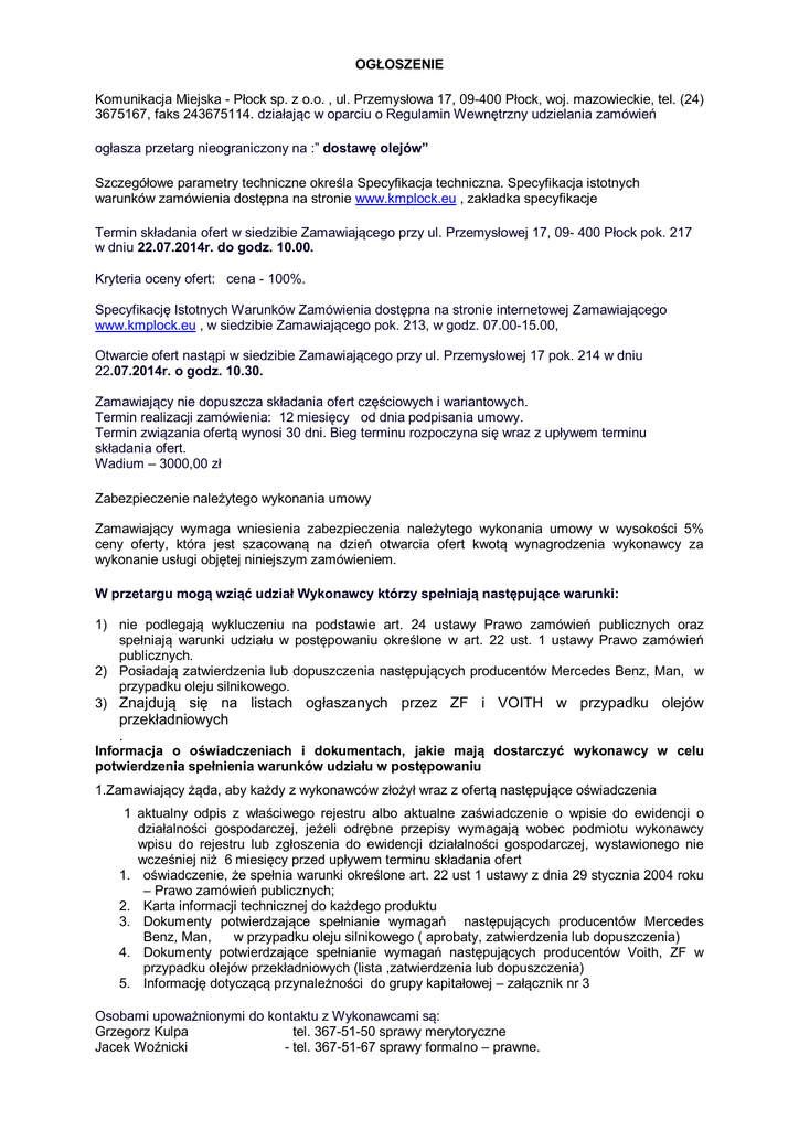 OGŁOSZENIE Komunikacja Miejska - Płock sp. z o.o. , ul. Przemysłowa 17, 09-400 Płock, woj. mazowieckie, tel. (24) 3675167, faks 243675114. działając w oparciu o Regulamin Wewnętrzny udzielania zamówień ogłasza przetarg nieograniczony na :” dostawę olejów” Szczegółowe parametry techniczne określa Specyfikacja techniczna. Specyfikacja istotnych warunków zamówienia dostępna na stronie www.kmplock.eu , zakładka specyfikacje Termin składania ofert w siedzibie Zamawiającego przy ul. Przemysłowej 17, 09- 400 Płock pok. 217 w dniu 22.07.2014r. do godz. 10.00. Kryteria oceny ofert: cena - 100%. Specyfikację Istotnych Warunków Zamówienia dostępna na stronie internetowej Zamawiającego www.kmplock.eu , w siedzibie Zamawiającego pok. 213, w godz. 07.00-15.00, Otwarcie ofert nastąpi w siedzibie Zamawiającego przy ul. Przemysłowej 17 pok. 214 w dniu 22.07.2014r. o godz. 10.30. Zamawiający nie dopuszcza składania ofert częściowych i wariantowych. Termin realizacji zamówienia: 12 miesięcy od dnia podpisania umowy. Termin związania ofertą wynosi 30 dni. Bieg terminu rozpoczyna się wraz z upływem terminu składania ofert. Wadium – 3000,00 zł Zabezpieczenie należytego wykonania umowy Zamawiający wymaga wniesienia zabezpieczenia należytego wykonania umowy w wysokości 5% ceny oferty, która jest szacowaną na dzień otwarcia ofert kwotą wynagrodzenia wykonawcy za wykonanie usługi objętej niniejszym zamówieniem. W przetargu mogą wziąć udział Wykonawcy którzy spełniają następujące warunki: 1) nie podlegają wykluczeniu na podstawie art. 24 ustawy Prawo zamówień publicznych oraz spełniają warunki udziału w postępowaniu określone w art. 22 ust. 1 ustawy Prawo zamówień publicznych. 2) Posiadają zatwierdzenia lub dopuszczenia następujących producentów Mercedes Benz, Man, w przypadku oleju silnikowego. 3) Znajdują się na listach ogłaszanych przez ZF i VOITH w przypadku olejów przekładniowych . Informacja o oświadczeniach i dokumentach, jakie mają dostarczyć wykonawcy w celu potwierdzenia spełnienia warunków udziału w postępowaniu 1.Zamawiający żąda, aby każdy z wykonawców złożył wraz z ofertą następujące oświadczenia 1 aktualny odpis z właściwego rejestru albo aktualne zaświadczenie o wpisie do ewidencji o działalności gospodarczej, jeżeli odrębne przepisy wymagają wobec podmiotu wykonawcy wpisu do rejestru lub zgłoszenia do ewidencji działalności gospodarczej, wystawionego nie wcześniej niż 6 miesięcy przed upływem terminu składania ofert 1. oświadczenie, że spełnia warunki określone art. 22 ust 1 ustawy z dnia 29 stycznia 2004 roku – Prawo zamówień publicznych; 2. Karta informacji technicznej do każdego produktu 3. Dokumenty potwierdzające spełnianie wymagań następujących producentów Mercedes Benz, Man, w przypadku oleju silnikowego ( aprobaty, zatwierdzenia lub dopuszczenia) 4. Dokumenty potwierdzające spełnianie wymagań następujących producentów Voith, ZF w przypadku olejów przekładniowych (lista ,zatwierdzenia lub dopuszczenia) 5. Informację dotyczącą przynależności do grupy kapitałowej – załącznik nr 3 Osobami upoważnionymi do kontaktu z Wykonawcami są: Grzegorz Kulpa tel. 367-51-50 sprawy merytoryczne Jacek Woźnicki - tel. 367-51-67 sprawy formalno – prawne.