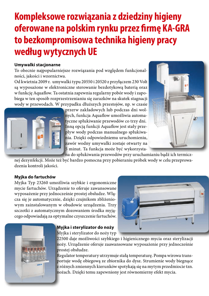 Kompleksowe rozwiązania z dziedziny higieny oferowane na polskim rynku przez firmę KA-GRA to bezkompromisowa technika higieny pracy według wytycznych UE Umywalki stacjonarne To obecnie najpopularniejsze rozwiązania pod względem funkcjonalności, jakości i wzornictwa. Od kwietnia 2009 r. umywalki typu 20550 i 20520 z przyłączem 230 Volt są wyposażone w elektroniczne sterowanie bezdotykową baterią oraz w funkcję Aquaflow. Ta ostatnia zapewnia regularny pobór wody i zapobiega w ten sposób rozprzestrzenianiu się zarazków na skutek stagnacji wody w przewodach. W przypadku dłuższych przestojów, np. w czasie przerw zakładowych lub podczas dni wolnych, funkcja Aquaflow umożliwia automatyczne spłukiwanie przewodów co trzy dni. Inną opcją funkcji Aquaflow jest stały przepływ wody podczas manualnego spłukiwania. Dzięki odpowiedniemu uruchomieniu, zawór wodny umywalki zostaje otwarty na 5 minut. Ta funkcja może być wykorzystana do spłukiwania przewodów przy uruchamianiu bądź ich termicznej dezynfekcji. Może też być bardzo pomocna przy pobieraniu próbek wody w celu przeprowadzenia kontroli jakości. Myjka do fartuchów Myjka Typ 23260 umożliwia szybkie i ergonomiczne mycie fartuchów. Urządzenie to oferuje zawansowane wyposażenie przy jednocześnie prostej obsłudze. Włącza się je automatycznie, dzięki czujnikom zbliżeniowym zainstalowanym w obudowie urządzenia. Trzy szczotki z automatycznym dozowaniem środka myjącego odpowiadają za optymalne czyszczenie fartuchów. Myjka i sterylizator do noży Myjka i sterylizator do noży typ 22500 daje możliwości szybkiego i higienicznego mycia oraz sterylizacji noży. Urządzenie oferuje zaawansowane wyposażenie przy jednocześnie prostej obsłudze. Regulator temperatury utrzymuje stałą temperaturę. Pompa wirowa transportuje wodę obiegową ze zbiornika do dysz. Strumienie wody biegnące z różnych zmiennych kierunków spotykają się na mytym przedmiocie tzn. nożach. Dzięki temu zapewniony jest równomierny efekt mycia. Po myciu następuje przemywanie świeżą wodą. Noże są spłukiwane za pomocą odrębnego systemu dysz wodą o temp. 80 - 83 °C. Dzięki temu są wstepnie podgrzewane do następującego później procesu suszenia. Jednocześnie ta sama woda po regeneracji służy do mycia zasadniczego. Stopień zabrudzenia wody zostaje w ten sposób obniżony, przy znacznej redukcji ścieków w procesie mycia. Śluzy higieniczne Zaawansowane śluzy higieniczne do mycia i dezynfekcji rąk oraz podeszw butów to systemy zapewniające optymalną kontrolę wejścia i wyjścia ze strefy produkcyjnej. Różne warianty śluz higienicznych dostosowane są do indywidualnych wymagań danego procesu produkcyjnego oraz ilości pracowników.Śluzy mają budowę modułową, pozwalającą na modyfikację i rozbudowę systemu o nowe elementy. Integracja automatycznego systemu czyszczenia pianą dla szczotek umożliwia tymczasowe czyszczenie wewnątrz wanny. Istnieje możliwość zaprogramowania czyszczenia w określonych przedziałach czasowych lub na żądanie ręczne. Optymalną higienę szczotek zapewnia elektroniczny dobór funkcji programowych: czysz- czenie wstępne (tylko woda) + piana + oddziaływanie + spłukiwanie. Dzięki specjalnym dyszom urządzenie do dystrybucji środka pieniącego i czyszczącego zapewnia dokładne mycie. Zaletą tego systemu jest czysta śluza higieniczna przez cały okres użytkowania oraz precyzyjnie sterowane czyszczenie bez dodatkowego zaangażowania personelu. W celu uzyskania szczegółowych informacji, przykładowych rozwiązań dostosowanych do indywidualnych potrzeb klientów, prosimy o składanie zapytań na adres mailowy: [email protected], lub kontakt telefoniczny: +48 22 812-40-84. Zapraszamy również do zapoznania się z naszą ofertą internetową: www.ka-gra.com.pl