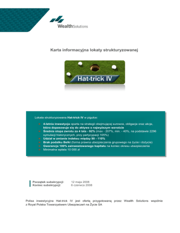 Karta informacyjna lokaty strukturyzowanej Lokata strukturyzowana Hat-trick IV w pigułce: 4-letnia inwestycja oparta na strategii obejmującej surowce, obligacje oraz akcje, która dopasowuje się do aktywa o najwyższym wzroście Średnia stopa zwrotu za 4 lata - 92% (max - 207%, min. - 40%, na podstawie 2296 symulacji historycznych, przy partycypacji 105%) Udział w zmianie indeksu między 90 - 110% Brak podatku Belki (forma prawna ubezpieczenia grupowego na życie i dożycie) Gwarancja 100% zainwestowanego kapitału na koniec okresu ubezpieczenia Minimalna wpłata 10 000 zł Początek subskrypcji: Koniec subskrypcji: 12 maja 2008 6 czerwca 2008 Polisa inwestycyjna Hat-trick IV jest ofertą przygotowaną przez Wealth Solutions wspólnie z Royal Polska Towarzystwem Ubezpieczeń na Życie SA Powody, dla których warto zainwestować w lokatę Hat-trick IV 1. Strategia, która dopasowuje się do bieżącej sytuacji rynkowej Strategia Long-Short Momentum (LSM) opracowana przez Deutsche Bank przynosi wysokie i stabilne wyniki – także w trakcie spadków na giełdzie. Pozycje składowe zmieniane są co miesiąc, tak by dopasować strategię do bieżącej sytuacji na rynku i zapewnić maksymalne dopasowanie do aktywa o najwyższym wzroście. Poniżej prezentujemy porównanie z indeksem WIG20. Wykres obejmuje okres od 30 czerwca 1995 do 25 kwietnia 2008. W tym czasie indeks Long-Short Momentum zyskał 755 proc., a WIG20 241 proc. 900 800 700 600 500 400 300 200 100 0 WIG20 LSM 2. Surowce, obligacje, akcje Inwestycja oparta jest o trzy główne klasy aktywów: surowce (m.in. złoto, towary rolne), obligacje, akcje z zastosowaniem automatycznej zmiany udziałów poszczególnych pozycji w portfelu zależnie od sytuacji rynkowej. Możliwe jest zarabianie także na spadkach cen jednej z trzech klas aktywów. Strategia LSM przynosi wyższe wzrosty niż najlepsze aktywa w koszyku. 900 Surowce Akcje Obligacje LSM 750 600 450 300 150 0 3. Bezpieczeństwo kapitału Produkt gwarantuje zwrot 100% zainwestowanego kapitału na koniec inwestycji w przypadku ujemnego wyniku indeksu, a środki klienci wpłacają na rachunek bankowy Royal Polska Towarzystwa Ubezpieczeń na Życie. Właścicielem Towarzystwa jest Wiener Städtische – wiodąca austriacka grupa ubezpieczeniowa w Europie Środkowo – Wschodniej ze 180-letnią tradycją. Reasekuratorem Towarzystwa jest Swiss Re, jedna z wiodących, najsilniejszych pod względem finansowym i najstarszych na świecie firm reasekuracyjnych. Wealth Solutions Sp. z o.o., z siedzibą w Warszawie przy ul. Emilii Plater 53, zarejestrowana przez Sąd Rejonowy m.st. Warszawy, XII Wydział Gospodarczy KRS, pod numerem KRS 287145, o kapitale zakładowym 50.000,-zł, NIP 525 239 69 74, REGON 140998978 Wprowadzenie Surowce, obligacje, akcje – to trzy główne klasy aktywów, które warto mieć w portfelu. W ramach każdej z tych kategorii występują okresy spadków i wzrostów. Każdy inwestor marzy, aby w danym momencie zarabiać w tym segmencie rynku, który rośnie najszybciej. Tym wymaganiom starają się sprostać niektóre fundusze inwestycyjne tzw. aktywnej alokacji. Niestety z kiepskim skutkiem. Nie tylko z uwagi na słabe wyczucie rynku ze strony zarządzających. „Winni” są także sami inwestorzy. Podczas hossy na giełdzie wpłacają środki do funduszy oczekując od zarządzających, że będą kupować akcje. Te wymagania są oczywiście spełniane – fundusze chcą zwiększać swoje aktywa. Fundusze zasilane nowymi pieniędzmi windują kursy spółek do bardzo wysokich poziomów. Prędzej czy później następuje głęboka korekta – taka jaką mogliśmy obserwować w styczniu tego roku. Nieco lepiej z aktywną alokacją radzą sobie niektóre zamknięte fundusze. Nie muszą one przyjmować wpłat i realizować wypłat na każde żądanie inwestorów dzięki czemu zarządzający funduszem ma większą swobodę. Problemem mogą być jednak wysokie koszty (najczęściej opłata za sukces: ok. 20 proc. od zysku) oraz ryzyko błędnych decyzji zarządzającego funduszem. Czy można zatem stworzyć skuteczną strategię zarabiania na różnego rodzaju aktywach wolną od opisanych wyżej mankamentów? Taką propozycją jest indeks Long-Short Momentum stworzony przez Deutsche Bank. Indeks opiera się na trzech klasach aktywów: akcjach, surowcach oraz obligacjach. Proporcje udziału tych trzech pozycji w indeksie zmieniane są co miesiąc według ściśle określonej, sprawdzonej historycznie metodologii. Strategia działa automatycznie – zbędny jest udział zarządzającego aktywami, dzięki czemu zysku inwestora nie obciążają dodatkowe opłaty. Zasada działania indeksu Long-Short Momentum Indeks Long-Short Momentum opiera się na trzech klasach aktywów: akcjach, surowcach i obligacjach. Akcje reprezentowane są przez duże międzynarodowe koncerny takie jak Nokia, Siemens, Allianz, Renault czy Bayer. Obligacje wykorzystane w indeksie to długoterminowe papiery dłużne, dzięki czemu istnieje większa możliwość zarabiania na zmianach w poziomie stóp procentowych na rynku. Trzecim komponentem są surowce takie jak ropa, olej grzewczy, aluminium, złoto, pszenica czy kukurydza. Konstrukcja indeksu oparta na trzech klasach aktywów zwiększa szansę na osiągnięcie ponadprzeciętnych zysków, co potwierdzają wyniki historyczne. Co miesiąc 1/6 kapitału inwestowana jest według poniższej reguły: Krok 1. Ustalenie wyników poszczególnych klas aktywów w ramach danej części portfela za ostatnie 6 miesięcy Krok2. Inwestycja 75 proc. środków w klasę aktywów o najwyższej stopie zwrotu Inwestycja 50 proc. środków w klasę aktywów o drugiej co do wysokości stopie zwrotu Krótka pozycja w wysokości 25 proc. środków na najsłabszej klasie aktywów* * w tym przypadku w ramach strategii pożyczane są aktywa (np. akcje), a następnie dokonywana jest ich sprzedaż, a uzyskane w ten sposób środki są przeznaczane na inwestycję w aktywo p
