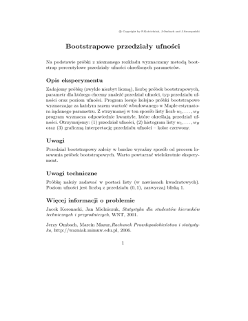 r Copyright by P.Kościelniak, J.Ombach and J.Szczepański Bootstrapowe przedziały ufności Na podstawie próbki z nieznanego rozkładu wyznaczamy metodą bootstrap percentylowe przedziały ufności określonych parametrów. Opis eksperymentu Zadajemy próbkę (zwykle niezbyt liczną), liczbę próbek bootstrapowych, parametr dla którego chcemy znaleźć przedział ufności, typ przedziału ufności oraz poziom ufności. Program losuje kolejno próbki bootstrapowe wyznaczając za każdym razem wartość wbudowanego w Maple estymatora żądanego parametru. Z otrzymanej w ten sposób listy liczb w1 , . . . , wB program wyznacza odpowiednie kwantyle, które określają przedział ufności. Otrzymujemy: (1) przedział ufności, (2) histogram listy w1 , . . . , wB oraz (3) graficzną interpretację przedziału ufności – kolor czerwony. Uwagi Przedział bootstrapowy zależy w bardzo wyraźny sposób od procesu losowania próbek bootstrapowych. Warto powtarzać wielokrotnie eksperyment. Uwagi techniczne Próbkę należy zadawać w postaci listy (w nawiasach kwadratowych). Poziom ufności jest liczbą z przedziału (0, 1), zazwyczaj bliską 1. Więcej informacji o problemie Jacek Koronacki, Jan Mielniczuk, Statystyka dla studentów kierunków technicznych i przyrodniczych, WNT, 2001. Jerzy Ombach, Marcin Mazur,Rachunek Prawdopodobieństwa i statystyka, http://wazniak.mimuw.edu.pl, 2006. 1