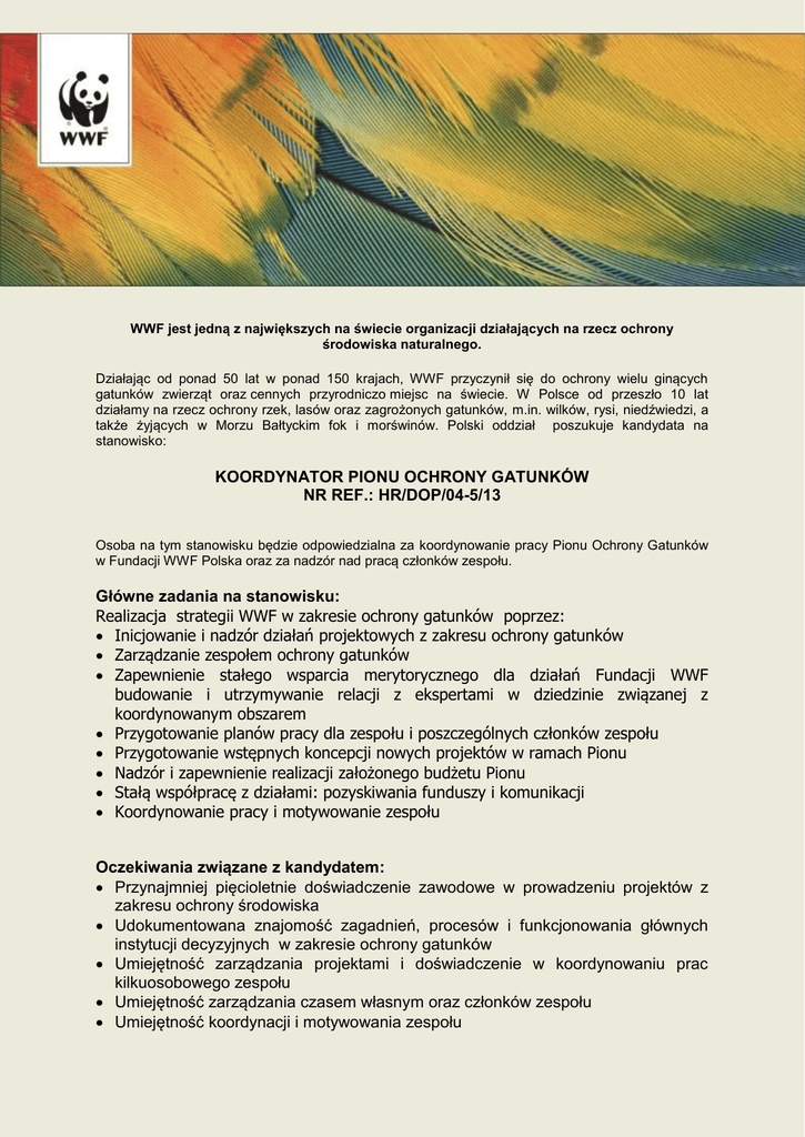 WWF jest jedną z największych na świecie organizacji działających na rzecz ochrony środowiska naturalnego. Działając od ponad 50 lat w ponad 150 krajach, WWF przyczynił się do ochrony wielu ginących gatunków zwierząt oraz cennych przyrodniczo miejsc na świecie. W Polsce od przeszło 10 lat działamy na rzecz ochrony rzek, lasów oraz zagrożonych gatunków, m.in. wilków, rysi, niedźwiedzi, a także żyjących w Morzu Bałtyckim fok i morświnów. Polski oddział poszukuje kandydata na stanowisko: KOORDYNATOR PIONU OCHRONY GATUNKÓW NR REF.: HR/DOP/04-5/13 Osoba na tym stanowisku będzie odpowiedzialna za koordynowanie pracy Pionu Ochrony Gatunków w Fundacji WWF Polska oraz za nadzór nad pracą członków zespołu. Główne zadania na stanowisku: Realizacja strategii WWF w zakresie ochrony gatunków poprzez: Inicjowanie i nadzór działań projektowych z zakresu ochrony gatunków Zarządzanie zespołem ochrony gatunków Zapewnienie stałego wsparcia merytorycznego dla działań Fundacji WWF budowanie i utrzymywanie relacji z ekspertami w dziedzinie związanej z koordynowanym obszarem Przygotowanie planów pracy dla zespołu i poszczególnych członków zespołu Przygotowanie wstępnych koncepcji nowych projektów w ramach Pionu Nadzór i zapewnienie realizacji założonego budżetu Pionu Stałą współpracę z działami: pozyskiwania funduszy i komunikacji Koordynowanie pracy i motywowanie zespołu Oczekiwania związane z kandydatem: Przynajmniej pięcioletnie doświadczenie zawodowe w prowadzeniu projektów z zakresu ochrony środowiska Udokumentowana znajomość zagadnień, procesów i funkcjonowania głównych instytucji decyzyjnych w zakresie ochrony gatunków Umiejętność zarządzania projektami i doświadczenie w koordynowaniu prac kilkuosobowego zespołu Umiejętność zarządzania czasem własnym oraz członków zespołu Umiejętność koordynacji i motywowania zespołu Umiejętność prowadzenia regularnej sprawozdawczości z realizacji projektów Konstruktywne podejście do rozwiązywania problemów Płynna znajomość języka polskiego i angielskiego (w mowie i piśmie), prawo jazdy oraz zaawansowana znajomość pakietu MS Office Dodatkowym atutem będzie doświadczenie we współpracy z organizacjami i instytucjami międzynarodowymi specjalizującymi się w ochronie gatunków zagrożonych Ze swojej strony oferujemy: Pracę w międzynarodowej Fundacji w gronie zaangażowanych i pełnych pasji osób Możliwość wpływania na rozwój działalności WWF w Polsce Dużą samodzielność na stanowisku gwarantującą realizację ustalonych i zaakceptowanych celów Rzeczywistą możliwość wpływu na ratowanie najcenniejszych zasobów przyrodniczych w Polsce i na świecie Osoby zainteresowane dołączeniem do naszego zespołu prosimy o przesyłanie cv i listu motywacyjnego (oba dokumenty wyłącznie w języku angielskim) z podaniem nr referencyjnego wskazanego powyżej na adres: [email protected] w terminie 14 dni od daty publikacji ogłoszenia. Prosimy o dopisanie następującej klauzuli: „Wyrażam zgodę na przetwarzanie moich danych osobowych zawartych w mojej ofercie pracy dla potrzeb niezbędnych do realizacji procesu rekrutacji (zgodnie z ustawą z dn. 29.08.1997 r. o ochronie danych osobowych Dz. U. nr 101 z 2002 r. poz. 926 z późn. zm.)”. Wszystkim zainteresowanym dziękujemy za zgłoszenia. skontaktujemy się jedynie z wybranymi kandydatami. Uprzejmie informujemy, że