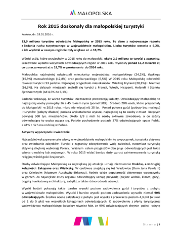 Rok 2015 doskonały dla małopolskiej turystyki Kraków, dn. 19.01.2016 r. 13,9 miliona turystów odwiedziło Małopolskę w 2015 roku. To dane z najnowszego raportu z Badania ruchu turystycznego w województwie małopolskim. Liczba turystów wzrosła o 6,2%, a ich wydatki w naszym regionie były większe aż o 18,7%. Wśród osób, które przyjechały w 2015 roku do małopolski, około 2,9 miliona to turyści z zagranicy. Szacowane wydatki wszystkich odwiedzających region w 2015 roku wyniosły ponad 13,2 miliarda zł, co oznacza wzrost aż o 18,7% w porównaniu do 2014 roku. Małopolskę najchętniej odwiedzali mieszkańcy województw: małopolskiego (24,2%), śląskiego (15,9%) mazowieckiego (12,8%) oraz podkarpackiego (6,5%) W 2015 roku Małopolskę odwiedzili również turyści z 53 państw. Najwięcej przyjechało mieszkańców Wielkiej Brytanii (20,3%) i Niemiec (16,3%). Na dalszych miejscach znaleźli się turyści z Francji, Włoch, Hiszpanii, Holandii i Stanów Zjednoczonych (od 4,5% do 6,1%). Badania wskazują, że wśród turystów nieznacznie przeważają kobiety. Odwiedzający Małopolskę to najczęściej osoby pomiędzy 26 a 45 rokiem życia (ponad 50%). Średnio 20% osób, które przyjechały do Małopolski w 2015 roku, miało nie więcej niż 25 lat. Ponad połowa gości (pobyty bez noclegu) i turystów (pobyty dłuższe) posiada wykształcenie wyższe, najczęściej są to osoby z miast liczących powyżej 500 tys. mieszkańców. Około 2/3 z nich to osoby aktywne zawodowo, a co szósty odwiedzający to osoba ucząca się. Polskie pochodzenie posiada 37% odwiedzających spoza Polski, a 41% z nich ma rodzinę w Polsce. Aktywny wypoczynek i zwiedzanie Najczęściej wskazywane cele wizyty w województwie małopolskim to wypoczynek, turystyka aktywna oraz zwiedzanie zabytków. Turyści z zagranicy zdecydowanie wolą zwiedzać, natomiast turystykę aktywną chętniej wybierają Polacy. Ważnym celem przyjazdów obu grup odwiedzających jest także wizyta u rodziny lub znajomych. W roku 2015 widać bardzo duży wzrost zainteresowania turystyką religijną wśród gości krajowych. Osoby odwiedzające Małopolskę za największą jej atrakcje uznają niezmiennie Kraków, a w drugiej kolejności: Zakopane oraz Wieliczkę. W czołówce znajdują się też Wadowice (Dom Jana Pawła II) oraz Oświęcim (Muzeum Auschwitz-Birkenau). Rośnie także popularność aktywnego wypoczynku w górach. Za największe atuty regionu odwiedzający uznają przyrodę (piękne widoki, klimat, góry), bogatą i unikatową architekturę, zabytki, a także różnorodność atrakcji. Wyniki badań pokazują także bardzo wysoki poziom zadowolenia gości i turystów z pobytu w województwie małopolskim. Wysoki i bardzo wysoki poziom zadowolenia wyraziło niemal 90% odwiedzających. Średnia ocena satysfakcji z pobytu jest wysoka i przekracza poziom 4,3 pkt (w skali od 1 do 5 pkt) we wszystkich kategoriach odwiedzających. O zadowoleniu z oferty turystycznej województwa małopolskiego świadczy również fakt, że 99% odwiedzających chętnie poleci wizytę Strona |1 w Małopolsce swojej rodzinie i znajomym, a 97% chciałoby ponownie odwiedzić Małopolskę w celach turystycznych. Jak powstał raport? Badanie ruchu turystycznego w województwie małopolskim w 2015 roku prowadzone było z wykorzystaniem ankiet bezpośrednich i objęło 6270 osób odwiedzających Małopolskę. Badania realizowano w 28 miejscach – w sezonie zimowym (styczeń/luty) oraz letnim (lipiec/sierpień). Wśród ankietowanych 16,1% stanowili odwiedzający zagraniczni. Dane zostały uzupełnione o informacje z Głównego Urzędu Statystycznego oraz statystyki prowadzone w najbardziej atrakcyjnych miejscach województwa. Badanie przeprowadziło konsorcjum firm: Pracownia Analiz Społecznych Ipsylon oraz Pracownia Badawcza Bosqo. Kontakt dla dziennikarzy: Biuro Prasowe Urząd Marszałkowski Województwa Małopolskiego tel. 12 616 09 55, 501 116 790 [email protected] Strona |2