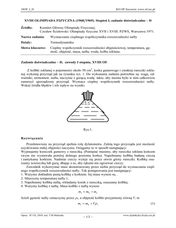 18OF_I_D KO OF Szczecin: www.of.szc.pl XVIII OLIMPIADA FIZYCZNA (1968/1969). Stopień I, zadanie doświadczalne – D Źródło: Komitet Główny Olimpiady Fizycznej; Czesław Ścisłowski: Olimpiady fizyczne XVII i XVIII. PZWS, Warszawa 1971. Nazwa zadania: Wyznaczanie cieplnego współczynnika rozszerzalności nafty Działy: Termodynamika Słowa kluczowe: Cieplny współczynnik rozszerzalności objętościowej, temperatura, gęstość, objętość, masa, nafta, woda, kolba szklana. Zadanie doświadczalne – D, zawody I stopnia, XVIII OF. Z kolbki szklanej o pojemności około 50 cm3, korka gumowego i cienkiej rureczki szklanej wykonaj przyrząd jak na rysunku rys. 1. Do wykonania zadania potrzebne są: waga, odważniki, termometr, nafta, naczynie z gorącą wodą takie, aby można było w nim całkowicie zanurzyć sporządzony przyrząd. Wyznacz cieplny współczynnik rozszerzalności nafty. Wskaż źródła błędów i ich wpływ na wyniki. Rys.1. Rozwiązanie Przedstawiony na przyrząd spełnia rolę dylatometru. Zaletą tego przyrządu jest możność uzyskiwania stałej objętości naczynia. Osiągamy to w sposób następujący: Wyjmujemy koreczek gumowy z rureczką. (Pamiętać musimy, aby rureczka szklana końcem swym nie wystawała poniżej dolnego poziomu korka). Napełniamy kolbkę badaną cieczą i zamykamy korkiem. Nadmiar cieczy wyleje się przez otwór górny rureczki. Kolbkę osuszamy ściereczką lub gazą, dbając o to, aby rękami nie ogrzewać cieczy. Zawodnik wykorzystać musi skonstruowany przez siebie przyrząd do wyznaczania cieplnego współczynnik rozszerzalności nafty. Tok postępowania jest następujący: 1. Ważymy dokładnie pustą kolbkę z korkiem. Jej masa wynosi mk . 2. Mierzymy temperaturę nafty t1. 3. Napełniamy kolbkę naftą, wkładamy korek z rureczką, osuszamy kolbkę. 4. Ważymy kolbkę z naftą. Masa kolbki z naftą wynosi m1 = mk + mn Jeżeli gęstość nafty oznaczymy przez ρ1, a objętość kolbki przyjmiemy równą V, to m1 = mk + Vρ1 Oprac. IF US, 2010, red. T.M.Molenda - 1/2 - (1) www.dydaktyka.fizyka.szc.pl 18OF_I_D KO OF Szczecin: www.of.szc.pl 5. Zanurzamy kolbkę do naczynia z gorącą wodą o temperaturze t2. Nafta się rozszerza i część jej wycieka przez górny otworek rurki szklanej. 6. Gdy już nafta nie będzie wyciekać, wyjmujemy kolbkę z naczynia, osuszamy, i ponownie ważymy m 2 = m k + Vρ 2 , (2) gdzie ρ 2 − gęstość nafty w temperaturze t2. Gęstość ta jest mniejsza od ρ 1. Przy tym ρ2 = ρ1 , 1 + γ Δt (3) gdzie Δt = t2 – t1, zaś γ − termiczny współczynnik rozszerzalności objętościowej nafty. 7. Korzystając z równań (1), (2), (3) obliczamy współczynnik γ. Wstawiamy do równania (2) wyrażenie na ρ 2 z równania (3) 1 m2 = mk + V . (4) 1 + γ Δt Przekształcamy równania (1) oraz (4) w sposób następujący m1 + m k = Vρ1 , 1 m2 + mk = V . 1 + γ Δt Dzielimy te równania stronami i otrzymujemy: m1 + mk = 1 + γ Δt . m2 + mk Z tego równania wyznaczamy γ γ = m1 − m2 . (m2 − mk )Δt Jak widzimy, w doświadczeniu nie musimy wyznaczać objętości kolbki. Źródła niepewności pomiarowych 1. Niedokładne ważenie kolbki pustej, następnie z naftą o temperaturze t1 oraz z naftą o temperaturze t2. 2. Intensywniejsze parowanie nafty w temperaturze t2, a więc ubytek masy nafty. W doświadczeniu naczyńko zwiększyło swą temperaturę od t1 do t2. Nastąpiło zatem zwiększenie jego pojemności. A więc, popełniamy błąd przyjmując objętość nafty, która wypłynęła z naczyńka jako rzeczywisty przyrost objętości. W rzeczywistości przyrost ten ma większą wartość. Ważenie przy użyciu laboratoryjnej wagi szkolnej możemy prowadzić z dokładnością do 0,1 g. Jeżeli kolbka posiada objętość około 50 cm3 to błąd względny na skutek ważenia jest bardzo mały. Jak widzimy, stosując tę metodę możemy dość dokładnie wyznaczyć termiczny współczynnik rozszerzalności cieczy. Oprac. IF US, 2010, red. T.M.Molenda - 2/2 - www.dydaktyka.fizyka.szc.pl