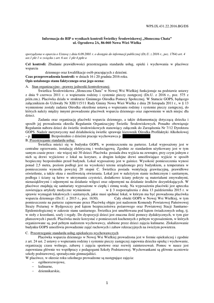 WPS.IX.431.22.2016.BG/DS Informacja do BIP o wynikach kontroli Świetlicy Środowiskowej „Słoneczna Chata” ul. Ogrodowa 2A, 86-060 Nowa Wieś Wielka sporządzona w oparciu o Ustawę z dnia 6.09.2001 r. o dostępie do informacji publicznej (Dz.U. z 2016 r., poz. 1764) art. 4 ust.1 pkt 1 w związku z art. 6 ust. 1 pkt 4 ppkt a Cel kontroli: Zbadanie prawidłowości przestrzegania standardu usług, opieki i wychowania w placówce wsparcia dziennego oraz kwalifikacje osób pracujących z dziećmi. Czas przeprowadzenia kontroli: w dniach 16 i 20 grudnia 2016 roku. Opis ustalonego stanu faktycznego oraz jego ocena: A. Stan organizacyjno - prawny jednostki kontrolowanej: Świetlica Środowiskowa „Słoneczna Chata” w Nowej Wsi Wielkiej funkcjonuje na podstawie ustawy z dnia 9 czerwca 2011 r. o wspieraniu rodziny i systemie pieczy zastępczej (Dz.U. z 2016 r., poz. 575 z późn.zm.). Placówka działa w strukturze Gminnego Ośrodka Pomocy Społecznej. W Statucie GOPS, będącego załącznikiem do Uchwały Nr XIII/115/11 Rady Gminy Nowa Wieś Wielka z dnia 28 listopada 2011 r., w § 13 wymienione zostały zadania Ośrodka określone ustawą o wspieraniu rodziny i systemie pieczy zastępczej, do których należy między innymi prowadzenie placówek wsparcia dziennego oraz zapewnienie w nich miejsc dla dzieci. Zadania oraz organizację placówki wsparcia dziennego, a także dokumentację dotyczącą dziecka i sposób jej prowadzenia określa Regulamin Organizacyjny Świetlic Środowiskowych. Ponadto obowiązuje Regulamin naboru dzieci do świetlic środowiskowych stanowiący załącznik do Zarządzenia Nr 7/12 Dyrektora GOPS. Nadzór merytoryczny nad działalnością świetlic sprawuje kierownik Ośrodka Profilaktyki Alkoholowej – p. xxxxxxxxxx. Bezpośrednio z dziećmi pracuje wychowawca p. xxxxxxxxxxxxxxx. B. Przestrzeganie standardu usług: Świetlica mieści się w budynku GOPS, w pomieszczeniu na parterze. Lokal wyposażony jest w centralne ogrzewanie, instalację elektryczną i wodociągową. Zgodnie ze standardem użytkowany jest w tym samym czasie przez - nie więcej niż 30 dzieci. Placówka posiada dwa wyjścia na zewnątrz, przy czym jednym z nich są drzwi wyjściowe z lokal na korytarz, a drugim kolejne drzwi umożliwiające wyjście w sposób bezpieczny bezpośrednio przed budynek. Lokal wyposażony jest w gaśnice. Wysokość pomieszczenia wynosi ponad 2,5 metra, poziom podłogi jest na wysokości terenu urządzonego przy budynkiem, a temperatura w pomieszczeniu wynosiła powyżej 20 stopni C. Świetlica posiada wentylację grawitacyjną, prawidłowe oświetlenie, a także okna z możliwością otwierania. Lokal jest w należytym stanie technicznym i sanitarnym, podłoga i ściany są łatwe w utrzymaniu czystości, dodatkowo ściany pokryte są materiałami zmywalnymi, nienasiąkliwymi i odpornymi na działanie wilgoci oraz odpornymi na działanie środków dezynfekujących. W placówce znajdują się sanitariaty wyposażone w ciepłą i zimną wodę. Na wyposażeniu placówki jest apteczka zawierająca artykuły medyczne wymienione w § 3 rozporządzenia z dnia 13 października 2015 r. w sprawie wymagań lokalowych i sanitarnych, jakie musi spełniać lokal, w którym ma być prowadzona placówka wsparcia dziennego (Dz.U. z 2015 r., poz. 1630). Cały obiekt GOPS w Nowej Wsi Wielkiej, w tym pomieszczenie na parterze zajmowane przez Placówkę objęte jest nadzorem Komendy Powiatowej Państwowej Straży Pożarnej w Bydgoszczy pod kątem bezpieczeństwa pożarowego oraz Powiatowej Stacji SanitarnoEpidemiologicznej w zakresie stanu sanitarnego. Świetlica jest umeblowana pod kątem świadczonych usług, tj. w stoły z krzesłami, szafy i regały. Do dyspozycji dzieci jest znaczna ilość pomocy dydaktycznych, w tym gier planszowych i puzzli. Placówka może korzystać z pomieszczeń kuchennych z pełnym wyposażeniem, w których organizowane są, pod pełnym nadzorem wychowawcy, ulubione przez dzieci zajęcia kulinarne. Zlokalizowanie budynku GOPS umożliwia prowadzenie zajęć ruchowych i zabaw rekreacyjnych na świeżym powietrzu. C. Przestrzeganie standardu usług opiekuńczo-wychowawczych Placówka wsparcia dziennego w Nowej Wsi Wielkiej prowadzona jest w formie opiekuńczej i zgodnie z art. 24 ust. 2 ustawy o wspieraniu rodziny i systemie pieczy zastępczej zapewnia dziecku opiekę i wychowanie, organizację czasu wolnego, zabawę i zajęcia sportowe oraz rozwój zainteresowań. Pomoc w nauce jest zapewniana głównie we współpracy z pedagogami Szkoły Podstawowej. Wychowankami są głównie uczniowie szkoły podstawowej, sporadycznie gimnazjaliści. W placówce, w okresie roku szkolnego prowadzone są następujące zajęcia: − ogólnorozwojowe, − kulinarne, − dziennikarskie, 1 − plastyczne. Inna organizacja obowiązuje w okresie wakacji. Czas pracy oraz rodzaj organizowanych zajęć jest stosowny do letniego okresu, z dużą liczbą wyjazdów, zwiedzania ciekawych miejsc, poznawania kultury i uczestniczenia w imprezach rekreacyjno-sportowych. Podczas spotkania dzieci najchętniej wspominały wyjazd do Golubia Dobrzynia, podczas którego zwiedziły średniowieczny Zamek oraz miały okazję podziwiać ekspozycję broni oraz rzeźb. Ponadto sprawdzały swych sił w zabawach strzeleckich, tj. strzelanie z łuku, rzut toporem i włócznią. Wychowankowie mają możliwość współuczestniczenia w pracach na rzecz placówki poprzez dbanie o estetykę i wystrój. Pobyt w placówce jest dobrowolny i nieodpłatny. W trakcie pobytu dzieci otrzymują kanapki, ciastka oraz napoje. Dotychczas nie było przypadku skierowania dziecka do placówki przez sąd. Prowadzący współpracują z pedagogiem szkolnym oraz rodzicami, którzy chętnie uczestniczą w imprezach okolicznościowych mile spędzając czas ze swoimi dziećmi. Placówka sporadycznie korzysta z pomocy wolontariuszy, brak osób zainteresowanych tą działalnością. W okresie objętym kontrolą wolontariat realiz