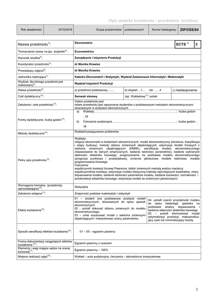 Opis modułu kształcenia / przedmiotu (sylabus) Rok akademicki: 2015/2016 Grupa przedmiotów: podstawowych Nazwa przedmiotu1): Ekonometria Tłumaczenie nazwy na jęz. angielski3): Econometrics 4) Numer katalogowy: ZIP/I/SS/04 ECTS 2) 3 Zarządzanie i Inżynieria Produkcji Kierunek studiów : Koordynator przedmiotu5): 6) Prowadzący zajęcia : 7) dr Monika Krawiec dr Monika Krawiec Jednostka realizująca : Katedra Ekonometrii i Statystyki, Wydział Zastosowań Informatyki i Matematyki Wydział, dla którego przedmiot jest realizowany8): Wydział Inżynierii Produkcji 9) Status przedmiotu : a) przedmiot podstawowy……. 10) Semestr zimowy Cykl dydaktyczny : Założenia i cele przedmiotu12): Formy dydaktyczne, liczba godzin13): b) stopień …I…. rok ……4 c) niestacjonarne 11) Jęz. Wykładowy : polski Celem przedmiotu jest: celem przedmiotu jest zapoznanie studentów z podstawowymi metodami ekonometrycznymi stosowanymi w analizach ekonomicznych a) Wykłady.…………………………………………………………………………; liczba godzin ..16 b) Ćwiczenia audytoryjne…………………………………………………………; liczba godzin .. 16 14) Metody dydaktyczne : Wykład/rozwiązywanie problemów Pełny opis przedmiotu15): Wykłady: miejsce ekonometrii w badaniach ekonomicznych, model ekonometryczny (struktura, klasyfikacja i etapy budowy), metody doboru zmiennych objaśniających, estymacja modeli liniowych z wieloma zmiennymi objaśniającymi (KMNK), weryfikacja modelu ekonometrycznego (dopasowanie do danych empirycznych, badanie istotności parametrów), badanie wybranych własności składnika losowego, prognozowanie na podstawie modelu ekonometrycznego (prognoza punktowa i przedziałowa), zmienne jakościowe, modele nieliniowe, modele programowania liniowego Ćwiczenia: współczynnik korelacji liniowej Pearsona, dobór zmiennych metodą analizy macierzy współczynników korelacji, estymacja modelu klasyczną metodą najmniejszych kwadratów, miary dopasowania modelu, badanie istotności parametrów modelu, badanie losowości, normalności i autokorelacji składnika losowego, estymacja modeli ze zmiennymi jakościowymi Wymagania formalne (przedmioty wprowadzające)16): Statystyka Założenia wstępne17): Znajomość podstaw matematyki i statystyki Efekty kształcenia18): 01 – student zna podstawowe postacie modeli ekonometrycznych, stosowanych do opisu zjawisk ekonomicznych, 02 - potrafi dokonać doboru zmiennych do modelu ekonometrycznego, 03 – umie oszacować model z wieloma zmiennymi objaśniającymi i interpretować oceny parametrów, Sposób weryfikacji efektów kształcenia19): 04- potrafi ocenić przydatność modelu do opisu badanego zjawiska na podstawie analizy dopasowania i badania własności składnika losowego 05 – potrafi sformułować model optymalizacji produkcji, maksymalizujący zysk lub minimalizujący koszty 01 – 05 – egzamin pisemny Forma dokumentacji osiągniętych efektów Egzamin pisemny z ocenami kształcenia 20): Elementy i wagi mające wpływ na ocenę Egzamin pisemny – 100% końcową21): Miejsce realizacji zajęć22): Wykład – aula audytoryjna, ćwiczenia – laboratorium komputerowe 1 Literatura podstawowa23): Borkowski B. Dudek H., Szczesny W.: Ekonometria. PWN, Warszawa 2003, Dziechciarz J. (red.): Ekonometria. Wyd. AE we Wrocławiu 2002, Kukuła K. (red.) Ekonometria. PWN, Warszawa 2000, Literatura uzupełniająca: Maddala G..: Ekonometria, PWN, Warszawa 2006. UWAGI24): Wskaźniki ilościowe charakteryzujące moduł/przedmiot25) : Szacunkowa sumaryczna liczba godzin pracy studenta (kontaktowych i pracy własnej) niezbędna dla osiągnięcia zakładanych efektów kształcenia18) - na tej podstawie należy wypełnić pole ECTS2: Łączna liczba punktów ECTS, którą student uzyskuje na zajęciach wymagających bezpośredniego udziału nauczycieli akademickich: Łączna liczba punktów ECTS, którą student uzyskuje w ramach zajęć o charakterze praktycznym, takich jak zajęcia laboratoryjne, projektowe, itp.: 75 h 1,5 ECTS 0,75 ECTS Tabela zgodności kierunkowych efektów kształcenia efektami przedmiotu 26) Nr /symbol efektu 01 02 03 04 05 Wymienione w wierszu efekty kształcenia: student zna podstawowe postacie modeli ekonometrycznych, stosowanych do opisu zjawisk ekonomicznych potrafi dokonać doboru zmiennych do modelu ekonometrycznego umie oszacować model z wieloma zmiennymi objaśniającymi i interpretować oceny parametrów potrafi ocenić przydatność modelu do opisu badanego zjawiska na podstawie analizy dopasowania i badania własności składnika potrafi sformułować model optymalizacji produkcji, maksymalizujący zysk lub minimalizujący koszty Odniesienie do efektów dla programu kształcenia na kierunku K_W09 K_U10, K_U07, K_U17 K_U08, K_U17 K_K03 2
