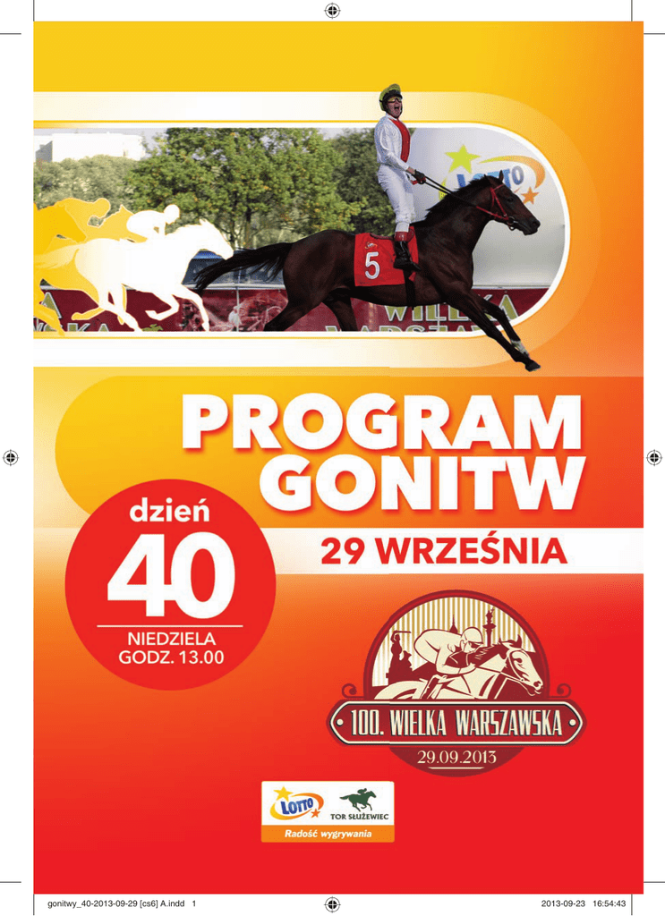 gonitwy_40-2013-09-29 [cs6] A.indd 1 2013-09-23 16:54:43 JAK GRAĆ? ZAPOZNAJ SIĘ Z PROGRAMEM NAJBLIŻSZYCH GONITW WYBIERZ RODZAJ ZAKŁADU NP. ZWYCZAJNY WYTYPUJ KONIA, NA KTÓREGO CHCESZ POSTAWIĆ PODAJ W KASIE: RODZAJ ZAKŁADU NUMER GONITWY NUMER TYPOWANEGO KONIA KROTNOŚĆ STAWKI ZAKŁADU UWAGA! Zakład PORZĄDEK grany jest na gonitwy od 7 i więcej koni Zakład CZWÓRKA grany jest na gonitwy od 8 i więcej koni Zakład PIĄTKA grany jest na gonitwy od 9 i więcej koni Porządek (PDK) - wskaż konie, które zajmą dwa pierwsze miejsca w gonitwie, bez względu na kolejność. Zwyczajny (ZWC) - wskaż konia, który zajmie pierwsze miejsce w gonitwie. Dwójka (DW) - wskaż konie, które zajmą dwa pierwsze miejsca w gonitwie, w określonej kolejności. Trójka (TRJ) - wskaż konie, które zajmą trzy pierwsze miejsca w gonitwie, w określonej kolejności. Czwórka (CZW) - wskaż konie, które zajmą cztery pierwsze miejsca w gonitwie, w określonej kolejności. Piątka (PIA) - wskaż konie, które zajmą pięć pierwszych miejsc w gonitwie, w określonej kolejności. ZAKŁADY WIELOGONITWOWE Tripla (TPL) - wskaż konie, które zajmą pierwsze miejsca w trzech kolejnych gonitwach. Kwinta (KWN) wskaż konie, które zajmą pierwsze miejsca w pięciu kolejnych gonitwach. SYSTEMY GRY BOX - wybrane konie we wszystkich kombinacjach zakładu. ŚCIANA - na wybraną przez grającego pozycję w zakładzie wprowadzane są wszystkie konie uczestniczone w gonitwie. gonitwy_40-2013-09-29 [cs6] A.indd 2 2013-09-23 16:55:25 SPIS GONITW 40 DZIEŃ 29 WRZEŚNIA 2013 Nagroda Hubala (wcześniej Tarana) 1 13:00 2 13:30 3 14:00 4 14:45 5 15:20 6 15:55 7 16:35 8 17:30 9 18:10 Gonitwa płotowa międzynarodowa dla 3-letnich i starszych koni. Za każdą wygraną w bieżącym roku gonitwę płotową lub przeszkodową 1 kg nadwagi. Konie, które nie zajęły płatnego miejsca 2 kg, a konie, które debiutują, 3 kg ulgi wagi. Nie jest stosowana ulga wagi za kategorie jeździeckie. Nagroda dodatkowa PKWK. dystans 2800 m suma nagród 24 500 zł Gonitwa dla 4-letnich i starszych koni II grupy. Nagroda dodatkowa PKWK. Gonitwa o puchar Prezydenta Toyoty Motor Poland. dystans 2000 m suma nagród 15 050 zł Gonitwa międzynarodowa dla 2-letnich koni II grupy, które nie biegały. Premia dla właścicieli pierwszych trzech koni pochodzących po reproduktorach dystans 1400 m zarejestrowanych w European Breeders’ Fund (EBF) w wysokości: I – 1000 €, II – 750 €, III – 250 €. suma nagród 16 625 zł Nagroda dodatkowa PKWK. Nagroda Mosznej – LR (kat. A) dystans 1600 m suma nagród 59 500 zł Gonitwa międzynarodowa dla 3-letnich i starszych koni. Nagroda dodatkowa PKWK. Nagroda Cardei – (kat. B) dystans 1200 m suma nagród 42 000 zł Gonitwa dla 2-letnich klaczy. Nagroda dodatkowa PKWK. Gonitwa dla 3-letnich koni IV grupy. dystans 1800 m suma nagród 9 800 zł Nagroda dodatkowa PKWK. Nagroda Qatar Racing & Equestrian Club Gonitwa dla 4-letnich i starszych koni czystej krwi arabskiej II grupy, które w roku 2013 ukończyły gonitwę na dystansie nie krótszym niż 3600 m. Nie jest stosowana ulga wagi za kategorie jeździeckie. Koni nie mogą dosiadać uczniowie. dystans 8200 m suma nagród 10 150 zł Wielka Warszawska – Nagroda Prezydenta m.st. Warszawy – G1 POL (kat. A) Gonitwa międzynarodowa dla 3-letnich i starszych koni. Nagroda dodatkowa PKWK. dystans 2600 m suma nagród 262 500 zł Gonitwa handikapowa IV grupy dla 4-letnich i starszych koni. Wagi według handikapu generalnego plus 6 kg. Nagroda dodatkowa PKWK. dystans 1400 m suma nagród 9 800 zł JAK CZYTAĆ PROGRAM GONITW numer gonitwy 1 numer gonitwy w sezonie godzina rozpoczęcia gonitwy nagrody za poszczególne miejsca wyniki osiągnięte w danym roku kolejność na celowniku dystans i czas gonitwy gonitwy_40-2013-09-29 [cs6] A.indd 3 Dandolo – Handikap Otwarcia Gonitwa handikapowa I grupy dla 4-letnich i starszych koni. Wagi według handikapu generalnego minus 11 kg. 1800 m 15:00 15 500 zł wypłaty nieobjęte planem gonitw NAGRODA DODATKOWA PKWK. (1) I II 6 200 zł III 3 100 zł IV 1 550 zł V dystans gonitwy 775 zł SUMA NAGRÓD 27 125 ZŁ 1 nazwa nagrody Jansen 2012ȩsȩȩsȩȩZ 14.10 IV gr. ȩZȩsȩ*UTRZENKAȩȩ-ORlNAȩȩJansen 59ȩDYSTȩIȩ MȩYȩMȩIȩnȩ,'RIGOREVAȩ*ASNAȩȩ,UCKYȩ-OMENTȩȩ+ARBONADOȩȩ sȩ1600m – 1’45,2”ȩȩsȩtor elastyczny (3,3)ȩsȩSTYLȩSILNIEȩ WYSYANYȩsȩðDALEKO suma nagród suma nagród zdobytych w danym roku przebieg gonitwy stan toru 2013-09-23 19:39:14 Nagroda Hubala (wcześniej Tarana) 1 Gonitwa płotowa międzynarodowa dla 3-letnich i starszych koni. Za każdą wygraną w bieżącym roku gonitwę płotową lub przeszkodową 1 kg nadwagi. Konie, które nie zajęły płatnego miejsca 2 kg, a konie, które debiutują, 3 kg ulgi wagi. Nie jest stosowana ulga wagi za kategorie jeździeckie. (329) NAGRODA DODATKOWA PKWK. 13:00 I 14 000 zł II 5 600 zł III 2 800 zł IV 1 400 zł V 2800 m 700 zł SUMA NAGRÓD 24 500 ZŁ NR KOŃ POCHODZENIE HODOWCA, WŁAŚCICIEL, STAJNIA, TRENER 1 Scaloni 2 Leading Light 3 Persei 4 Junclow 5 Sopran Best (ITY) 6 Santonina 7 Nick of the Star JEŹDZIEC KG (POWOŻĄCY) dż. Z.Lica 69 5 lat ogier gniady P: Belenus – Sunshine po Dowsing H: SK Golejewko W: A.Molska S: Aleksandra T: G.Kowalski am.dż. P.Peprna 69 4 lata ogier gniady P: Belenus – Leading Source po Enjoy Plan H: M.Konarski W: Mariusz Konarski i K.Kozłowska S: AM T: J.Kozłowski u. A.Chopyk 69 5 lat ogier siwy P: Fly To The Stars – Palafitta po Siberian Express H: J. i K. Dobosz W: J. i K. Dobosz S: Diament T: M.Jodłowski k.dż. A.Lubarski 62 3 lata ogier gniady P: Cloword – Juno po Alywar H: J.Niedzielska W: K.Rogowski i M.Falzmann S: Metis II T: K.Rogowski st.u. D.Pastuszka 67 4 lata wałach gniady P: Daro Sopran – Queen's Best po Bahamian Knight H: Sofim srl W: A.Pastuszka S: Panat T: K.Rogowski u. T.Pastuszka 65 4 lata klacz ciemnogniada P: Jape – Skulica po Saphir H: SK Iwno W: A.Pastuszka S: Panat T: 