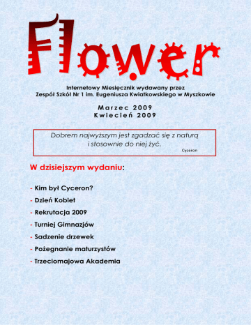 Rt5 Internetowy Miesięcznik wydawany przez Zespół Szkół Nr 1 im. Eugeniusza Kwiatkowskiego w Myszkowie Marzec 2009 Kwiecień 2009 Dobrem najwyższym jest zgadzać się z naturą i stosownie do niej żyć. Cyceron W dzisiejszym wydaniu: - Kim był Cyceron? - Dzień Kobiet - Rekrutacja 2009 - Turniej Gimnazjów - Sadzenie drzewek - Pożegnanie maturzystów - Trzeciomajowa Akademia Kim był Cyceron? Marcus Tullius Cicero – ur. 3. stycznia 106 p.n.e. zm. 7. grudnia 43 p.n.e. Wybitny mówca rzymski, popularyzator filozofii greckiej, polityk. Stronnik optymatów. Zamordowany wraz z bratem Kwintusem na polecenie Marka Antoniusza, który zemścił się w ten sposób za obelżywe słowa Filipiki. Jego ogromny dorobek literacki stanowią dzieła retoryczne: De oratore (O mówcy), Brutus, Orator, a także dzieła filozoficzne: De re publica (O państwie), De officiis (O powinnościach), De finibus bonorum et malorum (O granicach dobra i zła) i inne. Szczególną wartością odznaczają się też Listy Cycerona. Najcenniejsze są jednak mowy, w tym: Mowy przeciwko Katylinie, W obronie Milona i Filipiki przeciwko Antoniuszowi oraz Mowy przeciwko Werresowi. Cyceron, jako homo novus (czyli jako pierwszy w rodzinie sprawujący wysoki urząd), rozpoczął swą karierę jako kwestor w 75 roku p.n.e. na Sycylii. Następnie został edylem kurulnym, później wraz z Gajuszem Antoniuszem Hybrydą - konsulem. To właśnie za konsulatu wykrył spisek Katyliny, co zostało opisane w De coniuratione Catilinae Salustiusza. W kulturze Europy stał symbolem mówcy i obrońcy wolności republiki. Dzień Kobiet w ZS Nr 1 Szóstego marca bieżącego roku w Zespole Szkół Nr 1, z racji zbliżającego się święta kobiet przedstawiono kabaret. Kabaret, w którym często przebrani za kobiety chłopcy zaprezentowali pokaz mody kobiecej, spowiedź gangstera, pełną napięć rozmowę małżeńską, oraz rockowy koncert w wykonaniu duchownych. Wszystko połączone znakomitymi umiejętnościami aktorskimi występujących dało świetny, czyli śmieszny efekt. Na twarzach pań było widać szczery uśmiech i zadowolenie. Za trud i odwagę występujący chłopcy otrzymali gromkie brawa. W przedstawieniu wzięli udział: - Dominik Miśta kl. I TL - Dawid Zimny kl. I TL - Damian Czarnecki kl. II BO - Mateusz Nowak kl. II BO - Michał Szewczyk kl. II TF - Artur Grabowski kl. II LE - Damian Łabuś kl. II LE - Bartosz Majuch kl. II LE - Kamil Opiła kl. II LE Rekrutacja 2009 W roku szkolnym 2009/2010 Zespół Szkół nr 1 im. Eugeniusza Kwiatkowskiego w Myszkowie organizuje nabór na następujące kierunki kształcenia: Technikum Nr 1: - Technik mechatronik - Technik elektryk - Technik elektronik - Technik ekonomista - Technik ochrony środowiska - Technik usług fryzjerskich - Technik logistyk - Technik budownictwa - Technik pojazdów samochodowych Technikum Uzupełniające dla Dorosłych: - Technik pojazdów samochodowych - Technik handlowiec - Technik usług fryzjerskich Zasadnicza Szkoła Zawodowa: - Mechanik pojazdów samochodowych* - Cukiernik - Piekarz - Fryzjer - Kucharz małej gastronomii - Sprzedawca Zasadnicza Szkoła Zawodowa dla Dorosłych: - Obuwnik - Mechanik Pojazdów Samochodowych Zasadnicza Szkoła Zawodowa Specjalna: - Krawiec Podania o przyjęcie do Zespołu Szkół Nr 1 można składać od 2 marca 2009r. w sekretariacie szkoły. Turniej Gimnazjów W poniedziałek 27. kwietnia bieżącego roku na „Orliku” przy Zespole Szkół Nr 1 został rozegrany turniej piłki nożnej gimnazjów z powiatu myszkowskiego. Do turnieju zgłosiło się osiem szkół, które zostały podzielone na dwie grupy. W grupie pierwszej znalazły się: Gimnazjum Koziegłowy, Gimnazjum Nr 2, Gimnazjum Nr 4, Gimnazjum Nr 5. Natomiast w grupie drugiej grały: Gimnazjum Lgota Górna, Gimnazjum Nr 1, Gimnazjum Pińczyce, Gimnazjum Nr 3. Nad sprawnym przebiegiem rozgrywek czuwał nauczyciel wychowania fizycznego ZS Nr 1, prof. Marcin Maternik. Wyniki turnieju: I miejsce – Gimnazjum Koziegłowy II miejsce – Gimnazjum Nr 1 II miejsce – Gimnazjum Nr 5 Organizatorem spotkania był Zespół Szkół Nr 1, na którego czele stanęli nauczyciele wychowania fizycznego: prof. Zbigniew Sobolewski oraz prof. Adrian Zamora. Nagrody wręczył Dyrektor Zespołu Szkół Nr 1 wraz z przedstawicielami starostwa. Mateusz Siurda Sadzenie Drzewek W czwartek, 30. kwietnia chłopcy z klasy II LE pod opieką prof. Marcina Wieczorka, dbając o piękno przyrody oraz w trosce o środowisko naturalne zasadzili drzewka wzdłuż ogrodzenia terenu szkoły przy ulicy Kwiatkowskiego, naprzeciw Przedszkola Nr 7. Na zdjęciu od lewej: Przemysław Jędrzejczyk, Kamil Opiła, Michał Picheta, Artur Grabowski, Jakub Pilarczyk, Damian Łabuś. Sądzę, iż powinniśmy obdarzyć ogromnym szacunkiem tych, którzy działali na rzecz wszystkich nas. Młodzieńcy sadząc drzewka w pełni zasłużyli na uznanie wśród znajomych, wśród społeczności uczniowskiej Kwiatkowskiego. Dziś zapomina się o przyrodzie, o ekologii, a oni właśnie pamiętali, chcieli drobnym gestem przyczynić się do czegoś dobrego, co zaowocuje na długie lata. I zrobili to, poświęcili swój wolny czas naturze, przyrodzie. Mateusz Siurda Pożegnanie maturzystów 30. kwietnia odbyło się uroczyste zakończenie roku szkolnego maturzystów Zespołu Szkół Nr 1. Akademię dla żegnających nas, najstarszych kolegów przygotowali uczniowie klas Technikum Nr 1. Na uroczystość przybył zaproszony Pan Marian Wróbel, Starosta Myszkowski, który wraz z Dyrektorem ZS Nr 1 Panem Eugeniuszem Bugajem i wychowawcami klas wręczył nagrody książkowe uczniom, którzy w roku szkolnym 2008/2009 uzyskali najlepsze wyniki w nauce oraz oceny z zachowania. Tegorocznym maturzystom życzymy powodzenia podczas egzaminu dojrzałości! Części pisemne odbędą się 4. oraz 5. maja. Ustne egzaminy w pozostałych dniach tygodnia. Trzeciomajowa Akademia Czwartkowy dzień, był dniem akademii zdecydowanie tak mo