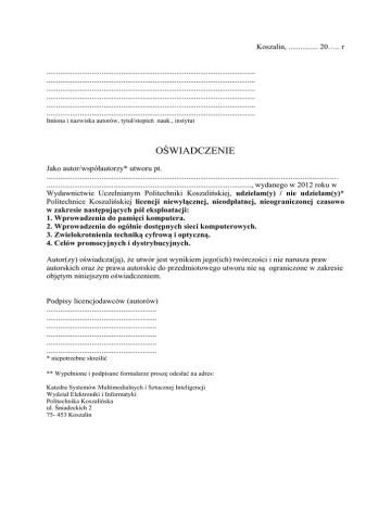 Koszalin, ............... 20….. r .......................................................................................................... .......................................................................................................... .......................................................................................................... .......................................................................................................... .......................................................................................................... .......................................................................................................... Imiona i nazwiska autorów, tytuł/stopień nauk., instytut OŚWIADCZENIE Jako autor/współautorzy* utworu pt. .................................................................................................................................................... ........................................................................................................, wydanego w 2012 roku w Wydawnictwie Uczelnianym Politechniki Koszalińskiej, udzielam(y) / nie udzielam(y)* Politechnice Koszalińskiej licencji niewyłącznej, nieodpłatnej, nieograniczonej czasowo w zakresie następujących pól eksploatacji: 1. Wprowadzenia do pamięci komputera. 2. Wprowadzenia do ogólnie dostępnych sieci komputerowych. 3. Zwielokrotnienia techniką cyfrową i optyczną. 4. Celów promocyjnych i dystrybucyjnych. Autor(zy) oświadcza(ją), że utwór jest wynikiem jego(ich) twórczości i nie narusza praw autorskich oraz że prawa autorskie do przedmiotowego utworu nie są ograniczone w zakresie objętym niniejszym oświadczeniem. Podpisy licencjodawców (autorów) ........................................................ ........................................................ ........................................................ ........................................................ ........................................................ ........................................................ * niepotrzebne skreślić ** Wypełnione i podpisane formularze proszę odesłać na adres: Katedra Systemów Multimedialnych i Sztucznej Inteligencji Wydział Elektroniki i Informatyki Politechnika Koszalińska ul. Śniadeckich 2 75- 453 Koszalin Koszalin, dnia ............................ r. OŚWIADCZENIE Oświadczam, że jestem autorem dzieła pt. ................................................................................................................................................................... ..................................................................................................................................................................., , które złożyłem w Wydawnictwie Uczelnianym Politechniki Koszalińskiej. Dzieło to: nie było dotąd nigdzie publikowane, nie jest częścią pracy wydanej wspólnie z innym autorem*), było publikowane w przedstawionej, zbliżonej postaci, we fragmentach przez .................................................................................................................................................................... .................................................................................................................................................................. , a moje prawa autorskie do niego nie są w żaden sposób ograniczone. Oświadczam również, że materiał graficzny (rysunki, diagramy, zdjęcia itp.) załączony do mojego dzieła jest moją własnością (mój własny), a jeżeli tak nie jest, to mam zezwolenie na opublikowanie w moim dziele: ilustracji nr ............................................................................................................................................................ od ............................................................................................................................................................ (Imię i nazwisko lub nazwa instytucji) ilustracji nr ............................................................................................................................................................ od ............................................................................................................................................................ ilustracji nr ............................................................................................................................................................ od ............................................................................................................................................................ ilustracji nr ............................................................................................................................................................ od ...................................................................................................................................................... **). Zobowiązuję się do przedstawienia w razie potrzeby wspomnianych zezwoleń. Imię i nazwisko Podpis ....................................................................... …………………………………………. ....................................................................... …………………………………………. ....................................................................... …………………………………………. ....................................................................... …………………………………………. ....................................................................... …………………………………………. ________________________ *) niepotrzebne skreślić **) w razie braku miejsca dodać załącznik Uwaga: W przypadku prac zbiorowych podać imiona i nazwiska wszystkich współautorów. Oświadczenie podpisują wszyscy współautorzy.