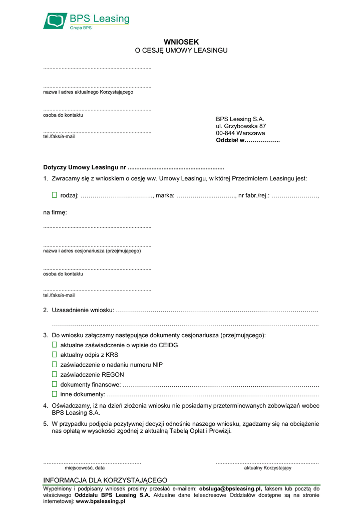 WNIOSEK O CESJĘ UMOWY LEASINGU ....................................................................... ....................................................................... nazwa i adres aktualnego Korzystającego ....................................................................... osoba do kontaktu ....................................................................... tel./faks/e-mail BPS Leasing S.A. ul. Grzybowska 87 00-844 Warszawa Oddział w……………... Dotyczy Umowy Leasingu nr ......................................................... 1. Zwracamy się z wnioskiem o cesję ww. Umowy Leasingu, w której Przedmiotem Leasingu jest: rodzaj: …………………….……….., marka: ………….…...……….., nr fabr./rej.: ………….………., na firmę: ....................................................................... ....................................................................... nazwa i adres cesjonariusza (przejmującego) ....................................................................... osoba do kontaktu ....................................................................... tel./faks/e-mail 2. Uzasadnienie wniosku: ………………………………………………………………………………………. …………………………………………………………………………………………………………………... 3. Do wniosku załączamy następujące dokumenty cesjonariusza (przejmującego): aktualne zaświadczenie o wpisie do CEIDG aktualny odpis z KRS zaświadczenie o nadaniu numeru NIP zaświadczenie REGON dokumenty finansowe: ……………………………………………………………………………………. inne dokumenty: …………………………………………………………………………………………... 4. Oświadczamy, iż na dzień złożenia wniosku nie posiadamy przeterminowanych zobowiązań wobec BPS Leasing S.A. 5. W przypadku podjęcia pozytywnej decyzji odnośnie naszego wniosku, zgadzamy się na obciążenie nas opłatą w wysokości zgodnej z aktualną Tabelą Opłat i Prowizji. .......................................................... miejscowość, data ............................................................. aktualny Korzystający INFORMACJA DLA KORZYSTAJĄCEGO Wypełniony i podpisany wniosek prosimy przesłać e-mailem: [email protected], faksem lub pocztą do właściwego Oddziału BPS Leasing S.A. Aktualne dane teleadresowe Oddziałów dostępne są na stronie internetowej: www.bpsleasing.pl