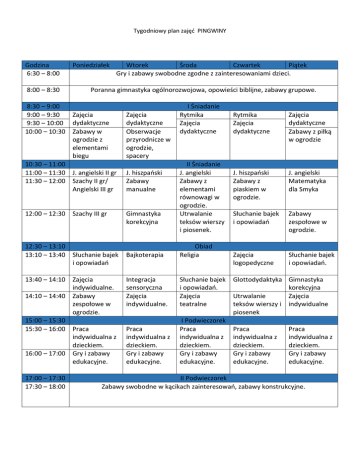 Tygodniowy plan zajęć PINGWINY Godzina 6:30 – 8:00 8:00 – 8:30 Poniedziałek Wtorek Środa Czwartek Piątek Gry i zabawy swobodne zgodne z zainteresowaniami dzieci. Poranna gimnastyka ogólnorozwojowa, opowieści biblijne, zabawy grupowe. 8:30 – 9:00 9:00 – 9:30 Zajęcia 9:30 – 10:00 dydaktyczne 10:00 – 10:30 Zabawy w ogrodzie z elementami biegu 10:30 – 11:00 11:00 – 11:30 J. angielski II gr 11:30 – 12:00 Szachy II gr/ Angielski III gr 12:00 – 12:30 Szachy III gr 12:30 – 13:10 13:10 – 13:40 Słuchanie bajek i opowiadań 13:40 – 14:10 Zajęcia indywidualne. 14:10 – 14:40 Zabawy zespołowe w ogrodzie. 15:00 – 15:30 15:30 – 16:00 Praca indywidualna z dzieckiem. 16:00 – 17:00 Gry i zabawy edukacyjne. 17:00 – 17:30 17:30 – 18:00 Zajęcia dydaktyczne Obserwacje przyrodnicze w ogrodzie, spacery J. hiszpański Zabawy manualne Gimnastyka korekcyjna I Śniadanie Rytmika Zajęcia dydaktyczne II Śniadanie J. angielski Zabawy z elementami równowagi w ogrodzie. Utrwalanie teksów wierszy i piosenek. Bajkoterapia Obiad Religia Integracja sensoryczna Zajęcia indywidualne. Słuchanie bajek i opowiadań. Zajęcia teatralne Praca indywidualna z dzieckiem. Gry i zabawy edukacyjne. I Podwieczorek Praca indywidualna z dzieckiem. Gry i zabawy edukacyjne. Rytmika Zajęcia dydaktyczne Zajęcia dydaktyczne Zabawy z piłką w ogrodzie J. hiszpański Zabawy z piaskiem w ogrodzie. J. angielski Matematyka dla Smyka Słuchanie bajek i opowiadań Zabawy zespołowe w ogrodzie. Zajęcia logopedyczne Słuchanie bajek i opowiadań. Glottodydaktyka Gimnastyka korekcyjna Utrwalanie Zajęcia teksów wierszy i indywidualne piosenek Praca indywidualna z dzieckiem. Gry i zabawy edukacyjne. Praca indywidualna z dzieckiem. Gry i zabawy edukacyjne. II Podwieczorek Zabawy swobodne w kącikach zainteresowań, zabawy konstrukcyjne.