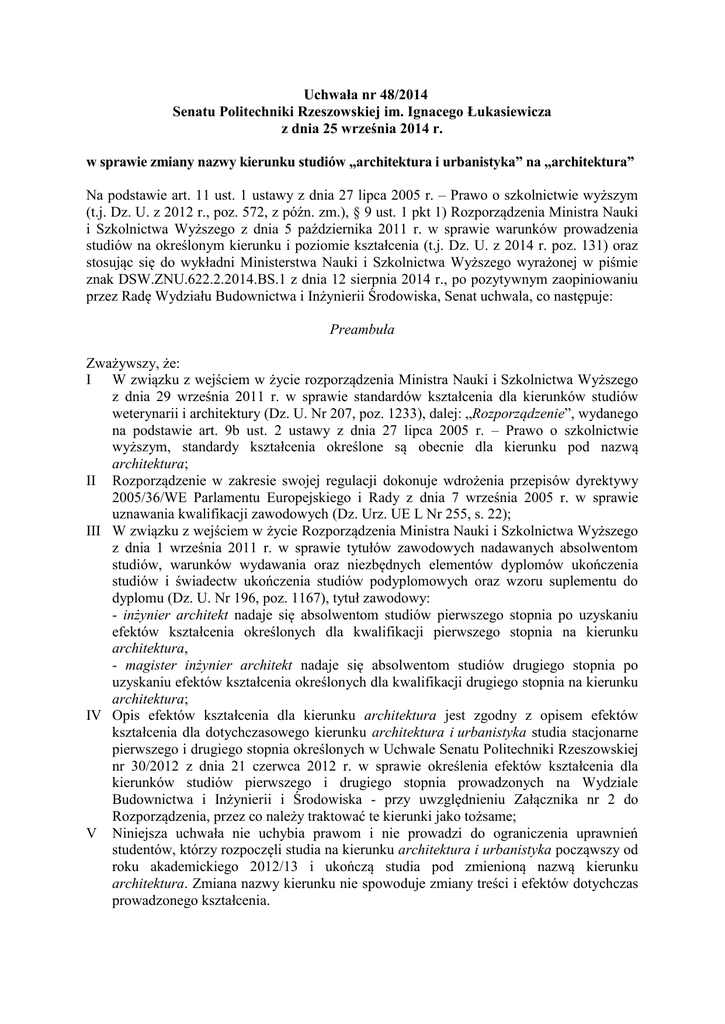 Uchwała nr 48/2014 Senatu Politechniki Rzeszowskiej im. Ignacego Łukasiewicza z dnia 25 września 2014 r. w sprawie zmiany nazwy kierunku studiów „architektura i urbanistyka” na „architektura” Na podstawie art. 11 ust. 1 ustawy z dnia 27 lipca 2005 r. – Prawo o szkolnictwie wyższym (t.j. Dz. U. z 2012 r., poz. 572, z późn. zm.), § 9 ust. 1 pkt 1) Rozporządzenia Ministra Nauki i Szkolnictwa Wyższego z dnia 5 października 2011 r. w sprawie warunków prowadzenia studiów na określonym kierunku i poziomie kształcenia (t.j. Dz. U. z 2014 r. poz. 131) oraz stosując się do wykładni Ministerstwa Nauki i Szkolnictwa Wyższego wyrażonej w piśmie znak DSW.ZNU.622.2.2014.BS.1 z dnia 12 sierpnia 2014 r., po pozytywnym zaopiniowaniu przez Radę Wydziału Budownictwa i Inżynierii Środowiska, Senat uchwala, co następuje: Preambuła Zważywszy, że: I W związku z wejściem w życie rozporządzenia Ministra Nauki i Szkolnictwa Wyższego z dnia 29 września 2011 r. w sprawie standardów kształcenia dla kierunków studiów weterynarii i architektury (Dz. U. Nr 207, poz. 1233), dalej: „Rozporządzenie”, wydanego na podstawie art. 9b ust. 2 ustawy z dnia 27 lipca 2005 r. – Prawo o szkolnictwie wyższym, standardy kształcenia określone są obecnie dla kierunku pod nazwą architektura; II Rozporządzenie w zakresie swojej regulacji dokonuje wdrożenia przepisów dyrektywy 2005/36/WE Parlamentu Europejskiego i Rady z dnia 7 września 2005 r. w sprawie uznawania kwalifikacji zawodowych (Dz. Urz. UE L Nr 255, s. 22); III W związku z wejściem w życie Rozporządzenia Ministra Nauki i Szkolnictwa Wyższego z dnia 1 września 2011 r. w sprawie tytułów zawodowych nadawanych absolwentom studiów, warunków wydawania oraz niezbędnych elementów dyplomów ukończenia studiów i świadectw ukończenia studiów podyplomowych oraz wzoru suplementu do dyplomu (Dz. U. Nr 196, poz. 1167), tytuł zawodowy: - inżynier architekt nadaje się absolwentom studiów pierwszego stopnia po uzyskaniu efektów kształcenia określonych dla kwalifikacji pierwszego stopnia na kierunku architektura, - magister inżynier architekt nadaje się absolwentom studiów drugiego stopnia po uzyskaniu efektów kształcenia określonych dla kwalifikacji drugiego stopnia na kierunku architektura; IV Opis efektów kształcenia dla kierunku architektura jest zgodny z opisem efektów kształcenia dla dotychczasowego kierunku architektura i urbanistyka studia stacjonarne pierwszego i drugiego stopnia określonych w Uchwale Senatu Politechniki Rzeszowskiej nr 30/2012 z dnia 21 czerwca 2012 r. w sprawie określenia efektów kształcenia dla kierunków studiów pierwszego i drugiego stopnia prowadzonych na Wydziale Budownictwa i Inżynierii i Środowiska - przy uwzględnieniu Załącznika nr 2 do Rozporządzenia, przez co należy traktować te kierunki jako tożsame; V Niniejsza uchwała nie uchybia prawom i nie prowadzi do ograniczenia uprawnień studentów, którzy rozpoczęli studia na kierunku architektura i urbanistyka począwszy od roku akademickiego 2012/13 i ukończą studia pod zmienioną nazwą kierunku architektura. Zmiana nazwy kierunku nie spowoduje zmiany treści i efektów dotychczas prowadzonego kształcenia. VI Objęcie niniejszą uchwałą studentów, którzy rozpoczęli studia na kierunku architektura i urbanistyka począwszy od roku akademickiego 2012/13, ma na celu umożliwić tym osobom uzyskanie tytułu zawodowego inżyniera architekta lub magistra inżyniera architekta i w konsekwencji zagwarantować swobodne świadczenie usług na podstawie uzyskanych kwalifikacji zawodowych na obszarze Unii Europejskiej. § 1. W celu dostosowania nazwy kierunku studiów architektura i urbanistyka do realizowanych już treści kształcenia zgodnych z obowiązującym Rozporządzeniem Ministra Nauki i Szkolnictwa Wyższego z dnia 29 września 2011 r. w sprawie standardów kształcenia dla kierunków studiów weterynarii i architektury (Dz. U. Nr 207, poz. 1233) oraz do Rozporządzenia Ministra Nauki i Szkolnictwa Wyższego z dnia 1 września 2011 r. w sprawie tytułów zawodowych nadawanych absolwentom studiów, warunków wydawania oraz niezbędnych elementów dyplomów ukończenia studiów i świadectw ukończenia studiów podyplomowych oraz wzoru suplementu do dyplomu (Dz. U. Nr 196, poz. 1167) począwszy od roku akademickiego 2014/2015, dotychczasową nazwę kierunku studiów architektura i urbanistyka, prowadzonego przez Wydział w formie studiów stacjonarnych pierwszego i drugiego stopnia, zastępuje się nazwą architektura. § 2. Ilekroć w uchwale Rady Wydziału występuje jako nazwa kierunku studiów architektura i urbanistyka, należy przez to rozumieć nazwę kierunku studiów architektura. § 3. Rekrutacja na pierwszy rok studiów na kierunku architektura, studia stacjonarne pierwszego i drugiego stopnia, prowadzona będzie zgodnie z zasadami określonymi w Uchwale nr 32/2014 Senatu PRz z dnia 22 maja 2014 r. w sprawie ustalenia warunków i trybu rekrutacji dla poszczególnych kierunków studiów I i II stopnia w roku akademickim 2015/2016 dla kierunku architektura i urbanistyka, z późniejszymi zmianami. § 4. Studenci, którzy rozpoczęli studia na kierunku architektura i urbanistyka począwszy od roku akademickiego 2012/13, objęci są nowymi przepisami i ukończą studia na kierunku pod zmienioną nazwą, tj. architektura. § 5. Za realizację Uchwały odpowiedzialny jest Dziekan Wydziału Budownictwa i Inżynierii Środowiska. § 6. Uchwała wchodzi w życie z dniem podjęcia przez Senat.