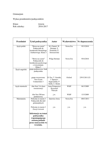 Gimnazjum Wykaz przedmiotów/podręczników Klasa: Rok szkolny: trzecia 2016-2017 Przedmiot Tytuł podręcznika Autor Język polski "Słowa na czasie" Podręcznik do kształcenia literackiego i kulturowego. Klasa 3 M. Chmiel, W. Herman, Z. Pomirska, P. Doroszewski Nowa Era 95/5/2010 "Słowa na czasie" Podręcznik do kształcenia językowego z ćwiczeniami. Klasa 3 grupa podstawowa: brak podręcznika Wilga Herman Nowa Era 95/6/2010 -- -- -- grupa rozszerzona: New Exam Connections 3 D. Pye, T. Garside, J. SpencerKępczyńska, P. Kelly, C. Kranz Anna Potapowicz Krzysztof Tkaczyk Oxford 259/3/2011/Z1 WSiP 86/5/2009 j.w. WSiP 13/5/2009 Janowicz Jerzy Nowa Era 108/3/2011 j.w. j.w. j.w. Język angielski Język niemiecki Matematyka Aha Neu! 3A (kurs rozszerzony) Aha Neu 2B kurs podstawowy Policzmy to razem 3 Podręcznik dla skół gimnazjalnych Policzmy to razem 3 Zeszyt ćwiczeń Informacje na temat podręcznika wspomagającego zostaną podanie przez nauczyciela we wrześniu. Wydawnictwo Nr dopuszczenia Chemia "Chemia Nowej Ery podręcznik dla gimnazjum" cz. 3 Chemia Nowej Ery zeszyt ćwiczeń dla gimnazjum Biologia Geografia Historia Edukacja dla bezpieczeństwa Wiedza o społeczeństwie Zajęcia techniczne Fizyka Religia Jan Kulawik, Teresa Kulawik, Maria Litwin D. BabczonekWróbel, T. Kulawik, M. Litwin, "Puls życia cz. 3" B.Sągin Podręcznika do biologii A.Boczarowski dla gimnazjum M.Sęktas "Planeta Nowa 3" Mariusz Szubert Podręcznik do geografii dla klasy trzeciej gimnazjum + zeszyt ćwiczeń+ atlas geograficzny dla gimnazjum "Śladami przeszłości 3" pod. red. Stanisława Roszaka Nowa Era 49/3/2010 materiał wspomagający Nowa Era Nowa Era 58/3/2010 Nowa Era 7/3/2010 kontynuacja z klasy drugiej Nowa Era 60/3/2009 "Śladami przeszłości 3" j.w. j.w. - zeszyt ćwiczeń Edukacja dla Bogusława WSiP bezpieczeństwa. Breikopf Podręcznik dla Dariusz Czyżów gimnazjum Dziś i jutro. Podręcznik Iwona Janicka Nowa Era z ćwiczeniami, cz. 1, Aleksandra cz.2 Kucior Tomasz Makowski Technika w praktyce. Jerzy Pecyna Nowa Era Bezpieczeństwo ruchu drogowego – zeszyt ćwiczeń do zajęć technicznych klasy 1-3 gimnazjum To jest fizyka – Marcin Braun, Nowa Era podręcznik dla Weronika Śliwa gimnazjum, cz. 3 i 4 W miłości Boga. pod red. ks. T. Wydawnictwo Św. Podręcznik do nauki Panuś, R. Stanisława BM religii dla klasy III Chrzanowska, M. gimnazjum Lewicka j.w. 206/2009 77/1/2009 podręcznik wspomagający 73/4/2011 351/2014 Uwaga! W przypadku podręczników z języków obcych obowiązuje kontynuacja z poprzedniego roku. Prosimy o wstrzymanie się z zakupem w związku z możliwością pojawienia się nowej edycji, zgodnej ze standardami egzaminacyjnymi. Wówczas o doborze podręcznika nauczyciel informuje we wrześniu.