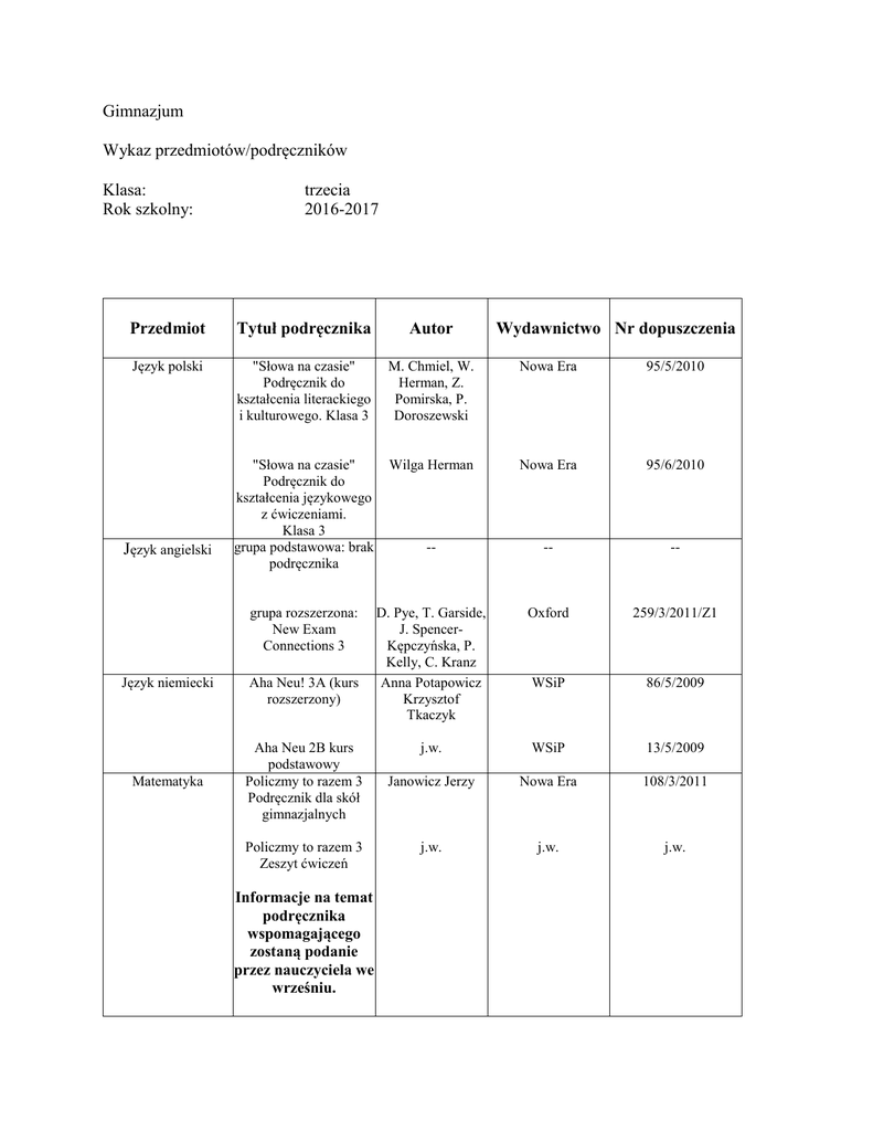 Gimnazjum Wykaz przedmiotów/podręczników Klasa: trzecia Rok