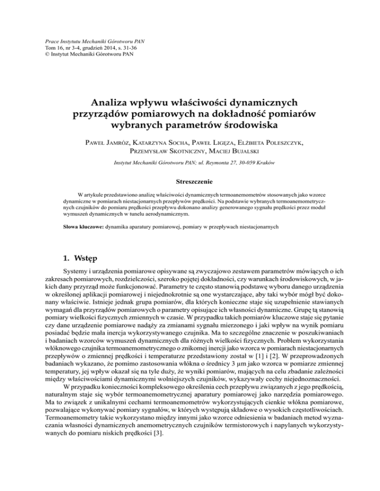 Prace Instytutu Mechaniki Górotworu PAN Tom 16, nr 3-4, grudzień 2014, s. 31-36 © Instytut Mechaniki Górotworu PAN Analiza wpływu właściwości dynamicznych przyrządów pomiarowych na dokładność pomiarów wybranych parametrów środowiska PAWEŁ JAMRÓZ, KATARZYNA SOCHA, PAWEŁ LIGĘZA, ELŻBIETA POLESZCZYK, PRZEMYSŁAW SKOTNICZNY, MACIEJ BUJALSKI Instytut Mechaniki Górotworu PAN; ul. Reymonta 27, 30-059 Kraków Streszczenie W artykule przedstawiono analizę właściwości dynamicznych termoanemometrów stosowanych jako wzorce dynamiczne w pomiarach niestacjonarnych przepływów prędkości. Na podstawie wybranych termoanemometrycznych czujników do pomiaru prędkości przepływu dokonano analizy generowanego sygnału prędkości przez moduł wymuszeń dynamicznych w tunelu aerodynamicznym. Słowa kluczowe: dynamika aparatury pomiarowej, pomiary w przepływach niestacjonarnych 1. Wstęp Systemy i urządzenia pomiarowe opisywane są zwyczajowo zestawem parametrów mówiących o ich zakresach pomiarowych, rozdzielczości, szeroko pojętej dokładności, czy warunkach środowiskowych, w jakich dany przyrząd może funkcjonować. Parametry te często stanowią podstawę wyboru danego urządzenia w określonej aplikacji pomiarowej i niejednokrotnie są one wystarczające, aby taki wybór mógł być dokonany właściwie. Istnieje jednak grupa pomiarów, dla których konieczne staje się uzupełnienie stawianych wymagań dla przyrządów pomiarowych o parametry opisujące ich własności dynamiczne. Grupę tą stanowią pomiary wielkości fizycznych zmiennych w czasie. W przypadku takich pomiarów kluczowe staje się pytanie czy dane urządzenie pomiarowe nadąży za zmianami sygnału mierzonego i jaki wpływ na wynik pomiaru posiadać będzie mała inercja wykorzystywanego czujnika. Ma to szczególne znaczenie w poszukiwaniach i badaniach wzorców wymuszeń dynamicznych dla różnych wielkości fizycznych. Problem wykorzystania włóknowego czujnika termoanemometrycznego o znikomej inercji jako wzorca w pomiarach niestacjonarnych przepływów o zmiennej prędkości i temperaturze przedstawiony został w [1] i [2]. W przeprowadzonych badaniach wykazano, że pomimo zastosowania włókna o średnicy 3 μm jako wzorca w pomiarze zmiennej temperatury, jej wpływ okazał się na tyle duży, że wyniki pomiarów, mających na celu zbadanie zależności między właściwościami dynamicznymi wolniejszych czujników, wykazywały cechy niejednoznaczności. W przypadku konieczności kompleksowego określenia cech przepływu związanych z jego prędkością, naturalnym staje się wybór termoanemometrycznej aparatury pomiarowej jako narzędzia pomiarowego. Ma to związek z unikalnymi cechami termoanemometrów wykorzystujących cienkie włókna pomiarowe, pozwalające wykonywać pomiary sygnałów, w których występują składowe o wysokich częstotliwościach. Termoanemometry takie wykorzystano między innymi jako wzorce odniesienia w badaniach metod wyznaczania własności dynamicznych anemometrycznych czujników termistorowych i napylanych wykorzystywanych do pomiaru niskich prędkości [3]. 32 Paweł Jamróz, Katarzyna Socha, Paweł Ligęza, Elżbieta Poleszczyk, Przemysław Skotniczny... 2. Wpływ właściwości dynamicznych termoanemometru na wynik pomiaru niestacjonarnej prędkości przepływu Parametry, związane z własnościami dynamicznymi przyrządów pomiarowych, wykorzystujących sygnał elektryczny jako informację o wartości mierzonej wielkości fizycznej, opisywane są przy pomocy zestawu charakterystyk związanych z ich pasmem przenoszenia. W klasycznej interpretacji pasmo przenoszenia układów obejmuje zakres częstotliwości sygnałów, w którym tłumienie sygnału nie jest większe niż 3 dB. W przypadku termoanemometrów, przyjmuje się, że w zależności od rodzaju urządzenia, grubości włókna, poziomu nagrzania włókna, czy prędkości przepływu pasmo przenoszenia dla sond o średnicy 3 μm oscyluje w okolicach 80 kHz, natomiast dla sond 5 μm 50 kHz. Z uwagi na brak możliwości generowania okresowych, szybkozmiennych przepływów w rzeczywistych warunkach, dynamika termoanemometrów wyznaczana jest na podstawie testów częstotliwościowych, w których zaburzenie generowane jest przez generator wpięty w jedną z gałęzi mostka termoanemometru, a częstotliwość graniczna określana jest na podstawie odpowiedzi układu pomiarowego na to zaburzenie [4]. Uzyskanie charakterystyk opisujących dynamiczne własności termoanemometrów z wykorzystaniem zmiennego przepływu możliwe jest na drodze symulacyjnej. W tym celu opracowuje się modele wybranych układów termoanemometrycznych i na ich podstawie przeprowadza badania tak jak to przedstawiono w [5] i [6]. Na podstawie takich modeli możliwe było opracowanie charakterystyki amplitudowo częstotliwościowej dla sondy 3 i 5 μm przy prędkości średniej przepływu 5 m/s. Wynik symulacji przedstawiono na rysunku 1. 5 Wzmocnienie [dB] Sonda 3 Pm Sonda 5 Pm 0 -3 -10 -15 1 10 CzĊstotliwoĞü [kHz] 50 80 100 200 Rys. 1. Pasmo przenoszenia termoanemometru Wyznaczone pasma przenoszenia dla poszczególnych sond pomiarowych odpowiadają wartościom opisywanym przez producentów różnych układów termoanemometrycznych. Należy jednak pamiętać, że każdy układ tego typu musi być rozpatrywany indywidualnie, z uwagi na silną zależność własności dynamicznych od indywidualnych nastaw i parametrów elektronicznych całego systemu, a nie jedynie sondy pomiarowej. W przypadku pomiarów mających na celu określenie własności wzorcowych wymuszeń dynamicznych użyteczniejsza do analizy jest postać umożliwiająca określenie chwilowych wartości błędów dynamicznych powstających przy sygnałach zawierających składowe różnych częstotliwości. Na rysunku 2 przedstawiono odpowiedź modelu termoanemometru na dynamiczne wymuszenie sinusoidalne o częstotliwościach od 0,1 do 100 kHz. Prezentacja taka pozwal