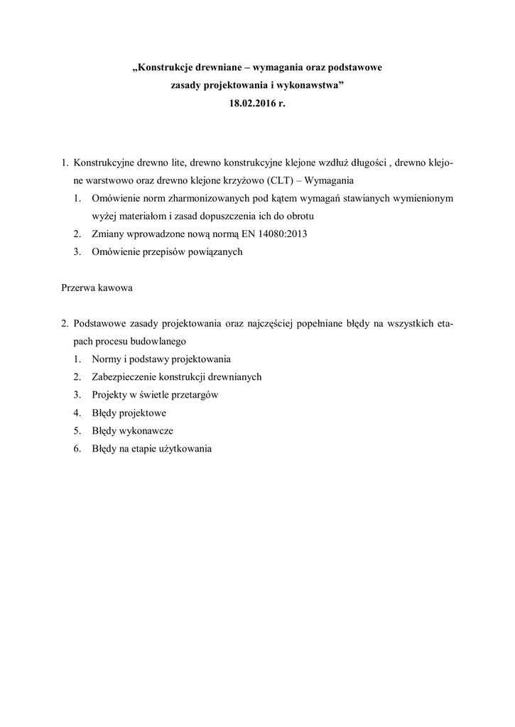 „Konstrukcje drewniane – wymagania oraz podstawowe zasady projektowania i wykonawstwa” 18.02.2016 r. 1. Konstrukcyjne drewno lite, drewno konstrukcyjne klejone wzdłuż długości , drewno klejone warstwowo oraz drewno klejone krzyżowo (CLT) – Wymagania 1. Omówienie norm zharmonizowanych pod kątem wymagań stawianych wymienionym wyżej materiałom i zasad dopuszczenia ich do obrotu 2. Zmiany wprowadzone nową normą EN 14080:2013 3. Omówienie przepisów powiązanych Przerwa kawowa 2. Podstawowe zasady projektowania oraz najczęściej popełniane błędy na wszystkich etapach procesu budowlanego 1. Normy i podstawy projektowania 2. Zabezpieczenie konstrukcji drewnianych 3. Projekty w świetle przetargów 4. Błędy projektowe 5. Błędy wykonawcze 6. Błędy na etapie użytkowania