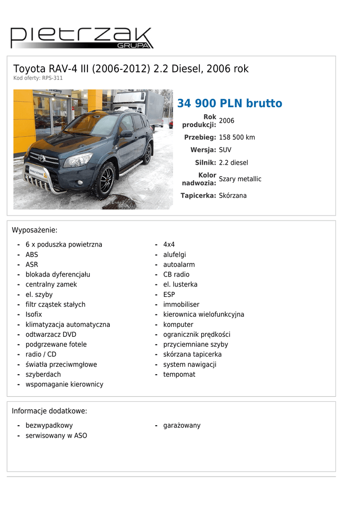 Toyota RAV-4 III (2006-2012) 2.2 Diesel, 2006 rok Kod oferty: RPS-311 34 900 PLN brutto Rok 2006 produkcji: Przebieg: 158 500 km Wersja: SUV Silnik: 2.2 diesel Kolor Szary metallic nadwozia: Tapicerka: Skórzana Wyposażenie: - 6 x poduszka powietrzna ABS ASR blokada dyferencjału centralny zamek el. szyby filtr cząstek stałych Isofix klimatyzacja automatyczna odtwarzacz DVD podgrzewane fotele radio / CD światła przeciwmgłowe szyberdach wspomaganie kierownicy - 4x4 alufelgi autoalarm CB radio el. lusterka ESP immobiliser kierownica wielofunkcyjna komputer ogranicznik prędkości przyciemniane szyby skórzana tapicerka system nawigacji tempomat Informacje dodatkowe: - bezwypadkowy - serwisowany w ASO - garażowany Pietrzak Spółka z o.o. - Renault Świętochłowice ul. Bytomska 39 41-600 Świętochłowice Tel.: 696 016 138 Fax: