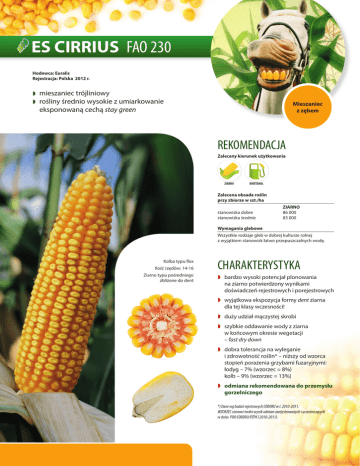 ES CIRRIUS FAO 230 Hodowca: Euralis Rejestracja: Polska 2012 r. ZZ ZZ mieszaniec trójliniowy rośliny średnio wysokie z umiarkowanie eksponowaną cechą stay green Mieszaniec z zębem REKOMENDACJA Zalecany kierunek użytkowania ZIARNO BIOETANOL Zalecana obsada roślin przy zbiorze w szt./ha stanowiska dobre stanowiska średnie ZIARNO 86 000 83 000 Wymagania glebowe Wszystkie rodzaje gleb w dobrej kulturze rolnej z wyjątkiem stanowisk łatwo przepuszczalnych wodę. Kolba typu flex Ilość rzędów: 14-16 Ziarno typu pośredniego zbliżone do dent CHARAKTERYSTYKA ZZ bardzo wysoki potencjał plonowania na ziarno potwierdzony wynikami doświadczeń rejestrowych i porejestrowych ZZ wyjątkowa ekspozycja formy dent ziarna dla tej klasy wczesności! ZZ duży udział mączystej skrobi ZZ szybkie oddawanie wody z ziarna w końcowym okresie wegetacji – fast dry down ZZ dobra tolerancja na wyleganie i zdrowotność roślin* – niższy od wzorca stopień porażenia grzybami fuzaryjnymi: łodyg – 7% (wzorzec = 8%) kolb – 9% (wzorzec = 13%) ZZ odmiana rekomendowana do przemysłu gorzelniczego *) Dane wg badań rejestrowych COBORU w l. 2010‑2011. WZORZEC stanowi średni wynik odmian zarejestrowanych i uczestniczących w dośw. PDO COBORU/PZPK l.2010‑2011). ES CIRRIUS Rekomendacja hodowcy WYNIKI I OPINIE Błażej Springer - Product Manager Kukurydza, Euralis „ES Cirrius to dla Euralis jeden z ważniejszych przedstawicieli grupy genetycznej Tropical Dent®. Odmianę zarejestrowano w Polsce w 2012 roku i od tej chwili cieszy się dynamicznie rosnącym zainteresowaniem producentów kukurydzy na ziarno. Wczesność dojrzewania (FAO 230) umożliwia jego przydatność do uprawy na terenie całego kraju. Niepozorne rośliny o generatywnym pokroju, niosą ze sobą niespotykany potencjał plonowania w tej klasie wczesności. Wyjątkowe (w tej grupy odmian) dla ES Cirrius jest bardzo szybkie dosychanie ziarna w ostatnim okresie wegetacji – cecha odmian typu „dent”.Unikalność polega także na tym, że następuje to znacznie wcześniej niż dla zdecydowanej większości późnych odmian typu „dent’’.Umożliwia to rozszerzenie uprawy ES Cirrius na ziarno w kierunku północnym kraju przy zapewnieniu relatywnie niższej wilgotności omłotu. Łatwość i niskie koszty dosuszaniem ziarna w suszarni są kolejnym atutem odmiany. Wszystkie wymienione cechy, w połączeniu z dobrą tolerancją na słabsze stanowiska glebowe sprawiają, że ES Cirrius jest wyróżniającą się propozycją odmianową w szerokiej palecie odmian ziarnowych kukurydzy. Rekomendacje rolników CGFP Grupa Fundacja Potulicka, Wojnowo, woj. kujawsko-pomorskie, Gł. Agronom Andrzej Słomczewski, 1900 ha kukurydzy Odmiana ES Cirrius jest przez nas uprawiana na ziarno od dwóch lat. Aby w pełni wykorzystać potencjał plonowania tej odmiany kierujemy ją głównie na gleby klasy III A do IV B, a dzięki wczesności i szybkiemu oddawaniu wody (ziarno zbliżone do dent) możemy po niej uprawiać pszenicę ozimą. W naszym rejonie rok 2014 był dla kukurydzy najtrudniejszy od wielu lat z uwagi na ekstremalnie niekorzystne warunki pogodowe w kluczowych dla tej rośliny fazach rozwojowych. W tych warunkach ES Cirrius również potwierdził swój potencjał i niezawodność plonując najwyżej w swojej klasie wczesności. CERPLON Cerekwica, woj. kujawsko-pomorskie, Prezes Roman Rezulak, 600 ha kukurydzy W minionym sezonie, już po raz trzeci z rzędu uprawiałem odmianę ES Cirrius na ziarno. Doskonale sprawdza się w uprawie w monokulturze i systemie bezorkowym który dominuje w gospodarstwie. Nawet na glebach nieco słabszych -jak IV klasa- na jakich zasiałem ES Cirrius, odmiana plonowała na wysokim poziomie a za taki uważam plon rzędu 10,5‑11 ton ziarna przy 28% wilgotności zbioru. Z doświadczenia mogę więc stwierdzić, że elastyczność w dopasowaniu do różnych gleb ale utrzymanych w dobrej kulturze sprzyja wykorzystaniu wyjątkowego potencjału tej odmiany. Ponadto jej atutem jest szybka utrata wody z ziarna przy dojrzewaniu co jest korzystne z punktu widzenia ekonomii uprawy oraz organizacji prac np. związanych z terminowym siewem pszenicy ozimej. Będę zdecydowanie rozszerzał areał uprawy ES Cirrius w roku przyszłym! GR Krzysztof Domański, Radoszkowice, pow. oławski, woj. dolnośląskie, 30 ha kukurydzy W tym roku CIRRIUSA uprawiałem już po raz trzeci. Na stanowisku II klasy po oborniku, zebrałem ponad 14 ton ziarna o wilgotności 24,5%, co potwierdziło moje wcześniejsze obserwacje o ponadprzeciętnym potencjale plonowania tej odmiany. W sezonie 2014 uprawiałem też odmiany z konkurencyjnej amerykańskiej hodowli, które przy CIRRIUS-ie wypadły bardzo blado. W przyszłym roku planuję posiać Cirriusa na 90% swojego areału i już teraz wiem, że się nie zawiodę. GR Mariusz Derlatka, powiat swiebodziński, woj. lubuskie 240 ha kukurydzy Odmianę ES Cirrius siałem już po raz trzeci z rzędu i nie zawiodła mnie jeszcze ani razu. W tym roku stanowiła aż 40% areału uprawy. Przekonuje mnie niesamowity potencjał plonowania tej odmiany, oraz jej dopasowanie do różnych warunków środowiskowych, jakie występują u mnie na polu. ES Cirrius potrafi wytworzyć kolbę o dużych rozmiarach – znalazłem w tym roku kolby które miały po 20 rzędów! Ponadto ES Cirrius to odmiana która bardzo szybko oddaje wodę z ziarna na polu (mogę ją wcześniej kosić) i w suszarni.Odpowiada mi to bardzo bo mam niskie koszty suszenia i bardzo wysoki plon dla tej klasy wczesności. Doświadczenia porejestrowe serii ziarnowej grupy wczesnej COBORU /PZPK w latach 2012 - 2014 Doświadczenia serii ziarnowej grupy wczesnej COBORU /PZPK: rozpoznawcze* porejestrowe** porejestrowe na płn. kraju*** Plon ziarna przy 15% wody (dt/ha)