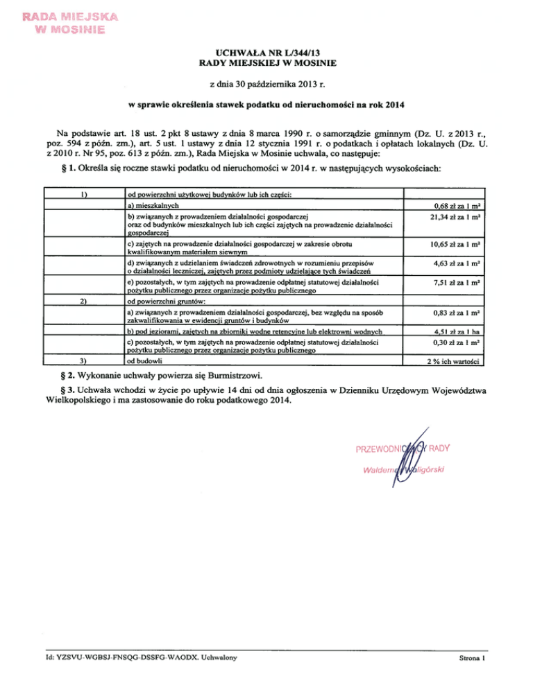 RADA MIEJSKA W MOSE UCHWALA NR L/344/13 RADY MIEJSKIEJ W MOSINIE z dnia 30 października 2013 r. w sprawie określenia stawek podatku od nieruchomości na rok 2014 Na podstawie art. 18 ust. 2 pkt 8 ustawy z dnia 8 marca 1990 r. o samorządzie gminnym (Dz. U. z 2013 r., poz. 594 z późn. zm.), art. 5 ust. 1 ustawy z dnia 12 stycznia 1991 r. o podatkach i opłatach lokalnych (Dz. U. z 2010 r. Nr 95, poz. 613 z późn. zm.), Rada Miejska w Mosinie uchwała, co następuje: 1. Okreśła się roczne stawki podatku od nieruchomości w 2014 r. w następujących wysokościach: 1) od_powierzchni_użytkowej_budynków_lub_ich_części: a) mieszkalnych 2) 0,68 zł za 1 m 2 b) związanych z prowadzeniem działalności gospodarczej oraz od budynków mieszkalnych lub ich części zajętych na prowadzenie działalności gospodarczej 21,34 zł za I m 2 c) zajętych na prowadzenie działalności gospodarczej w zakresie obrotu kwalifikowanym_materiałem_siewnym 10,65 zł za 1 m 2 d) związanych z udzielaniem świadczeń zdrowotnych w rozumieniu przepisów o działalności leczniczej, zajętych przez podmioty udzielające tych świadczeń 4,63 zł za 1 m 2 e) pozostałych, w tym zajętych na prowadzenie odpłatnej statutowej działalności pożytku publicznego przez organizacje pożytku publicznego 7,51 zł za 1 m 2 od powierzchni gruntów: a) związanych z prowadzeniem działalności gospodarczej, bez względu na sposób zakwalifikowania_w_ewidencji_gruntów_i_budynków 3) 0,83 zł za I m 2 b) pod jeziorami, zajętych na zbiorniki wodne retencyjne lub elektrowni wodnych 4,51 zł za I ha c) pozostałych, w tym zajętych na prowadzenie odpłatnej statutowej działalności pożytku publicznego przez organizacje pożytku publicznego 0,30 zł za 1 m 2 od budowli 2 % ich wartości 2. Wykonanie uchwały powierza się Burmistrzowi. 3. Uchwała wchodzi w życie po upływie 14 dni od dnia ogłoszenia w Dzienniku Urzędowym Województwa Wielkopolskiego i ma zastosowanie do roku podatkowego 2014. PRZEWOD Id: YZSyU-WGBSJ-FNSQG-DSSFG-WAODX. Uchwalony Strona 1 Uzasadnienie Górne granice stawek kwotowych w podatkach i opłatach lokalnych ogłoszone zostały w obwieszczeniu Ministra Finansów z dnia 7 sierpnia 2013 r. W myśl art. 20 ust. 1 ustawy z dnia 12 stycznia 1991 r. o podatkach i opłatach lokalnych (Dz. U. z 2010 r. Nr 95, poz. 613 z późn. zm.), górne granice stawek kwotowych, obowiązujące w danym roku podatkowym, ulegają corocznie zmianie na następny rok podatkowy w stopniu odpowiadającym wskaźnikowi cen towarów i usług konsumpcyjnych w okresie pierwszego półrocza roku, w którym stawki ulegają zmianie, w stosunku do analogicznego okresu roku poprzedniego. Zgodnie z komunikatem Prezesa GUS z dnia 15 lipca 2013 r., wskaźnik cen towarów i usług konsumpcyjnych w pierwszym półroczu 2013 r. w stosunku do pierwszego półrocza 2012 r. wyniósł 100,9 (wzrost cen o 0,9 %). Uwzględniając powyższe dane oraz uwarunkowania lokalne w odniesieniu do stawek podatkowych obowiązujących w Gminie Mosina w roku 2013, proponuje się ich pozostawienie na rok 2013, z wyjątkiem stawki podatku od gruntów pozostałych, gdzie proponowany wzrost wynosi 0,05 zł za 1 m . Wzrost do 0,30 zł 2 za 1 m 2 to zaledwie 65 % wielkości górnej stawki kwotowej podatku. Zgodnie z treścią przepisu art. 5 ust. 1 ustawy o podatkach i opłatach lokalnych, rada gminy jest zobowiązana do określenia wysokości stawek podatku od nieruchomości, z tym, że stawki nie mogą przekroczyć rocznie górnych granic stawek kwotowych, wskazanych w wymienionym wyżej obwieszczeniu. Wobec powyższego podjęcie przedmiotowej uchwały jest w pełni uzasadnione. PRZEWODN I Id: YZSyU-WGBSJ-FNSQG-DSSFG-WAODX. Uchwalony Strona 1
