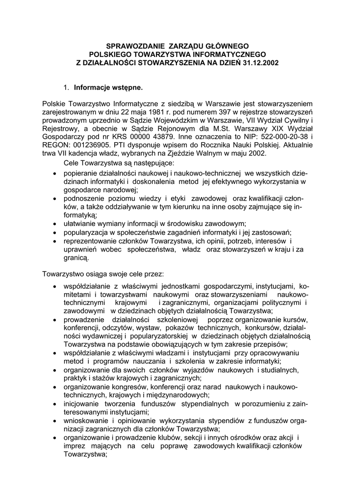 SPRAWOZDANIE ZARZĄDU GŁÓWNEGO POLSKIEGO TOWARZYSTWA INFORMATYCZNEGO Z DZIAŁALNOŚCI STOWARZYSZENIA NA DZIEŃ 31.12.2002 1. Informacje wstępne. Polskie Towarzystwo Informatyczne z siedzibą w Warszawie jest stowarzyszeniem zarejestrowanym w dniu 22 maja 1981 r. pod numerem 397 w rejestrze stowarzyszeń prowadzonym uprzednio w Sądzie Wojewódzkim w Warszawie, VII Wydział Cywilny i Rejestrowy, a obecnie w Sądzie Rejonowym dla M.St. Warszawy XIX Wydział Gospodarczy pod nr KRS 00000 43879. Inne oznaczenia to NIP: 522-000-20-38 i REGON: 001236905. PTI dysponuje wpisem do Rocznika Nauki Polskiej. Aktualnie trwa VII kadencja władz, wybranych na Zjeździe Walnym w maju 2002. Cele Towarzystwa są następujące: • popieranie działalności naukowej i naukowo-technicznej we wszystkich dziedzinach informatyki i doskonalenia metod jej efektywnego wykorzystania w gospodarce narodowej; • podnoszenie poziomu wiedzy i etyki zawodowej oraz kwalifikacji członków, a także oddziaływanie w tym kierunku na inne osoby zajmujące się informatyką; • ułatwianie wymiany informacji w środowisku zawodowym; • popularyzacja w społeczeństwie zagadnień informatyki i jej zastosowań; • reprezentowanie członków Towarzystwa, ich opinii, potrzeb, interesów i uprawnień wobec społeczeństwa, władz oraz stowarzyszeń w kraju i za granicą. Towarzystwo osiąga swoje cele przez: • • • • • • • • współdziałanie z właściwymi jednostkami gospodarczymi, instytucjami, komitetami i towarzystwami naukowymi oraz stowarzyszeniami naukowotechnicznymi krajowymi i zagranicznymi, organizacjami politycznymi i zawodowymi w dziedzinach objętych działalnością Towarzystwa; prowadzenie działalności szkoleniowej poprzez organizowanie kursów, konferencji, odczytów, wystaw, pokazów technicznych, konkursów, działalności wydawniczej i popularyzatorskiej w dziedzinach objętych działalnością Towarzystwa na podstawie obowiązujących w tym zakresie przepisów; współdziałanie z właściwymi władzami i instytucjami przy opracowywaniu metod i programów nauczania i szkolenia w zakresie informatyki; organizowanie dla swoich członków wyjazdów naukowych i studialnych, praktyk i stażów krajowych i zagranicznych; organizowanie kongresów, konferencji oraz narad naukowych i naukowotechnicznych, krajowych i międzynarodowych; inicjowanie tworzenia funduszów stypendialnych w porozumieniu z zainteresowanymi instytucjami; wnioskowanie i opiniowanie wykorzystania stypendiów z funduszów organizacji zagranicznych dla członków Towarzystwa; organizowanie i prowadzenie klubów, sekcji i innych ośrodków oraz akcji i imprez mających na celu poprawę zawodowych kwalifikacji członków Towarzystwa; • udzielanie pomocy członkom Towarzystwa w sprawach związanych z wykonywaniem przez nich zawodu informatyka; • zgłaszanie i opiniowanie wniosków w sprawie odznaczeń i nagród państwowych dla członków Towarzystwa. 2. Władze Towarzystwa W maju 2002 r. odbył się VII Walny Zjazd PTI, który udzielił absolutorium ustępującym władzom i wybrał statutowe organy Towarzystwa na kolejną kadencję. Władze PTI w kadencji 2002 – 2005 Prezes Zdzisław Szyjewski Wiceprezesi Piotr Fuglewicz, Andrzej Marciniak, Marek Miłosz, Alicja Myszor Sekretarz Generalny Jerzy S. Nowak Skarbnik Anna Cetnarowicz-Jutkiewicz Członkowie Zarządu Janusz Górski, Marek Hołyński, Małgorzata KalinowskaIszkowska, Ewa Łukasik, Lech Madeyski, Zygmunt Mazur, Jacek Niwicki, Wojciech Olejniczak, Tadeusz Syryjczyk, Marek Valenta, Adam Wojciechowski Prezydium Zarządu Głównego Zdzisław Szyjewski, Piotr Fuglewicz, Andrzej Marciniak, Marek Miłosz, Alicja Myszor, Anna Cetnarowicz-Jutkiewicz, Jerzy S. Nowak, Zygmunt Mazur Główna Komisja Rewizyjna Andrzej Król - przewodniczący, Sławomir Kwiecień - wiceprzewodniczący, Janusz Dorożyński - sekretarz, Hanna Mazur,Wiesław Szafraniec Główny Sąd Koleżeński Paweł Gizbert-Studnicki - przewodniczący, Juliusz Czarnowski, Klara Dyczkowska, Jan Kniat W listopadzie 2002 r. nastąpiła zmiana w ZG PTI – odwołano z funkcji Sekretarza Generalnego kol. Jacka Staworzyńskiego, powołując na to stanowisko kol. Jerzego Nowaka. W 2002 r. Zarząd Główny PTI zmienił siedzibę z ul. Żelaznej 87 na Al.Solidarności 82a/5 (01-003 Warszawa). 3. Organizacja Towarzystwa Zgodnie ze Statutem działalność Towarzystwa zorganizowana została w ramach Oddziałów, Kół regionalnych i Sekcji specjalistycznych. Obecnie aktywnie działają następujące jednostki organizacyjne: Oddziały: Oddział Dolnośląski (Wrocław) Oddział Górnośląski (Katowice) Oddział Małopolski (Kraków) Oddział Mazowiecki (Warszawa) Oddział Wielkopolski (Poznań) Koła: Sekcje: Koło PTI w Gdańsku Koło Jurajskie -Częstochowa Koło PTI w Lublinie Koło PTI w Łodzi Koło PTI w Sandomierzu Koło PTI w Szczecinie Koło PTI w Rzeszowie Koło PTI w Toruniu. Sekcja Baz Danych w Poznaniu Sekcja Informatyki Stosowanej w Zarządzaniu w Szczecinie Sekcja ECDL Sekcja Progress w Lublinie Sekcja Inżynierii Oprogramowania Sekcja Problemów Społeczeństwa Globalnej Informacji Sekcja Studencka 3. Posiadana baza techniczna (pomieszczenia, wyposażenie informatyczne, adres strony internetowej) Polskie Towarzystwo Informatyczne posiada stałe biura w Warszawie, Katowicach i Wrocławiu. W pozostałych ośrodkach biura PTI mieszczą się w budynkach uczelni wyższych lub firm prywatnych. Biura wyposażone są w pełni w sprzęt komputerowy (komputery osobiste, drukarki itp.). Ponadto PTI korzysta z serwera firmy TDC Internet Polska SA, na którym, pod adresem http://www.pti.org.pl, posadowione są strony WWW PTI. PTI posiada również listę dyskusyjną [email protected], w której uczestniczą nie tylko członkowie PTI. Więcej informacji o liście można znaleźć pod adresem: http://www.pti.org.pl/listapti.htm. W 2002 r. baza techniczna PTI uległa zwiększeniu o jeden komputer przenośny (Compaq Evo N8