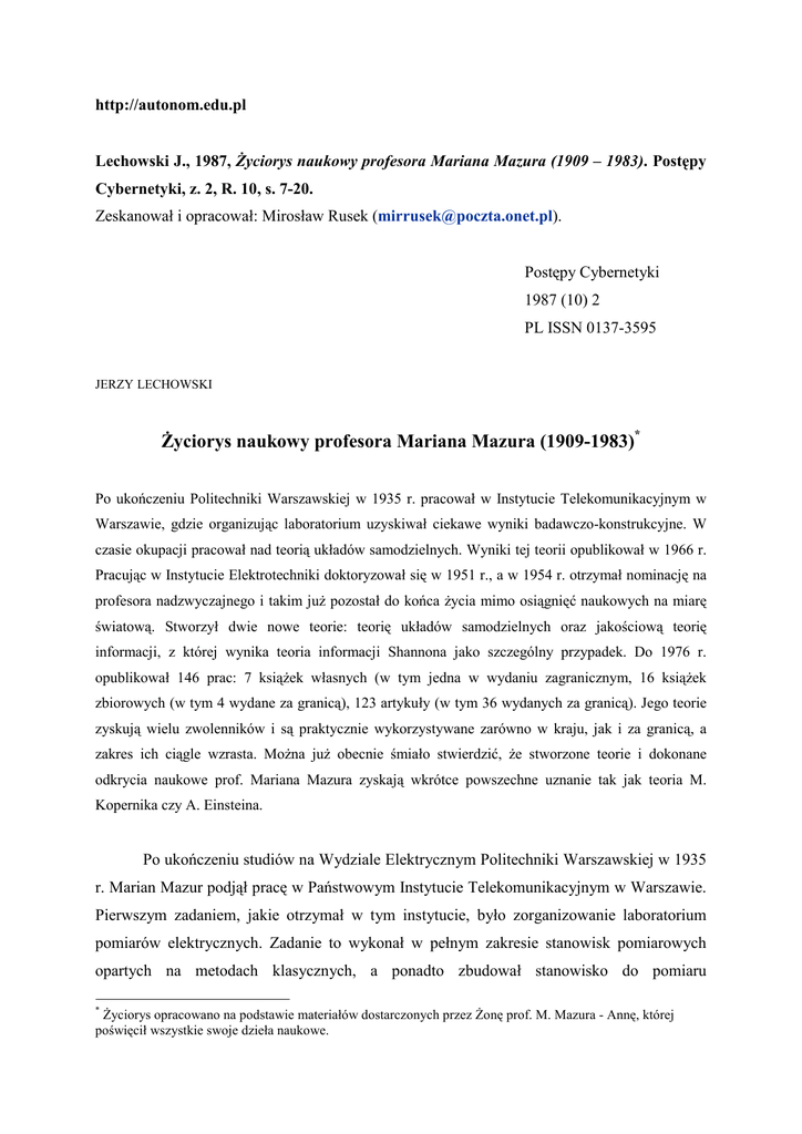 http://autonom.edu.pl Lechowski J., 1987, Życiorys naukowy profesora Mariana Mazura (1909 – 1983). Postępy Cybernetyki, z. 2, R. 10, s. 7-20. Zeskanował i opracował: Mirosław Rusek ([email protected]). Postępy Cybernetyki 1987 (10) 2 PL ISSN 0137-3595 JERZY LECHOWSKI Życiorys naukowy profesora Mariana Mazura (1909-1983)* Po ukończeniu Politechniki Warszawskiej w 1935 r. pracował w Instytucie Telekomunikacyjnym w Warszawie, gdzie organizując laboratorium uzyskiwał ciekawe wyniki badawczo-konstrukcyjne. W czasie okupacji pracował nad teorią układów samodzielnych. Wyniki tej teorii opublikował w 1966 r. Pracując w Instytucie Elektrotechniki doktoryzował się w 1951 r., a w 1954 r. otrzymał nominację na profesora nadzwyczajnego i takim już pozostał do końca życia mimo osiągnięć naukowych na miarę światową. Stworzył dwie nowe teorie: teorię układów samodzielnych oraz jakościową teorię informacji, z której wynika teoria informacji Shannona jako szczególny przypadek. Do 1976 r. opublikował 146 prac: 7 książek własnych (w tym jedna w wydaniu zagranicznym, 16 książek zbiorowych (w tym 4 wydane za granicą), 123 artykuły (w tym 36 wydanych za granicą). Jego teorie zyskują wielu zwolenników i są praktycznie wykorzystywane zarówno w kraju, jak i za granicą, a zakres ich ciągle wzrasta. Można już obecnie śmiało stwierdzić, że stworzone teorie i dokonane odkrycia naukowe prof. Mariana Mazura zyskają wkrótce powszechne uznanie tak jak teoria M. Kopernika czy A. Einsteina. Po ukończeniu studiów na Wydziale Elektrycznym Politechniki Warszawskiej w 1935 r. Marian Mazur podjął pracę w Państwowym Instytucie Telekomunikacyjnym w Warszawie. Pierwszym zadaniem, jakie otrzymał w tym instytucie, było zorganizowanie laboratorium pomiarów elektrycznych. Zadanie to wykonał w pełnym zakresie stanowisk pomiarowych opartych na metodach klasycznych, a ponadto zbudował stanowisko do pomiaru * Życiorys opracowano na podstawie materiałów dostarczonych przez Żonę prof. M. Mazura - Annę, której poświęcił wszystkie swoje dzieła naukowe. indukcyjności dławików magnetycznie nasycanych prądem stałym opierając się na własnej metodzie pomiarowej, którą opublikował w „Kwartalniku Telekomunikacyjnym”. W 1937 r. M. Mazur otrzymał do rozwiązania problem pełnej automatyzacji międzymiastowych połączeń telefonicznych (z perspektywą realizacji eksperymentalnej na linii Warszawa - Katowice), mający wówczas charakter pionierski w skali światowej. Zadanie to wykonał w zakresie koncepcji funkcjonalnej i zbudowania modelu laboratoryjnego. W związku z powyższym problemem, za osiągnięcie zasługujące na osobną wzmiankę można uważać opracowanie przez niego datownika petnoautomatycznego, niezbędnego we wspomnianym urządzeniu. Znane wówczas datowniki półautomatyczne wymagały ręcznego korygowania nieregularności kalendarzowych, a rozwiązania patentowe, znane wówczas w tym zakresie, nie były najlepsze. Rozwiązanie zaproponowane przez M. Mazura na drodze elektrycznej wymagało zaledwie czterech fabrycznie produkowanych elementów, z których zbudowano małym nakładem pracy sprawnie działający pełnoautomatyczny datownik uwzględniający również rok przestępny. W czasie wojny M. Mazur nie zaprzestał działalności naukowej, chociaż nie mógł jej uprawiać w sposób zinstytucjonalizowany. Nie mając zatem żadnych ograniczeń tematycznych M. Mazur zainteresował się możliwością stosowania aparatury pojęciowej automatyki do wszelkich procesów, nie tylko technicznych. Za szczególne osiągnięcie z owego okresu należy uważać koncepcję układu samodzielnego (systemu autonomicznego), czyli takiego, który oprócz zdolności sterowania się (automaty) ma zdolność utrzymywania swojej zdolności sterowania się (autonomy, organizmy, społeczności). Była to już w istocie, według późniejszej terminologii, problematyka cybernetyczna. Rozwijając ją M. Mazur opracował do 1944 r. zręby teorii układów samodzielnych, ujęte w 200-stronicowym rękopisie. Praca ta podczas powstania warszawskiego została zniszczona. Po wojnie problematykę tę podjął na nowo, czemu jednak nie sprzyjały absorbujące go zajęcia w Ministerstwie Przemysłu i Handlu, gdzie pracował w latach 1946-1947, oraz brak możliwości instytucjonalnego uprawiania cybernetyki ze względu na nieprzychylny stosunek do tego kierunku nauki ówczesnych władz. W 1948 r. M. Mazur podjął pracę w Instytucie Elektrotechniki w Warszawie, gdzie rozbudował laboratoria pomiarowe na potrzeby elektrotermii, a następnie rozwinął rozległą działalność badawcza w tej dziedzinie. Za rozprawę na temat promieniowania zwrotnego uzyskał na Wydziale Elektrycznym Politechniki Warszawskiej stopień doktora nauk technicznych w 1951 r. Wprowadzony przez niego wzór wyrażający współczynnik promieniowania zwrotnego skrętek grzejnych wszedł później do literatury podręcznikowej. W 1954 r. M. Mazur otrzymał nominację na profesora nadzwyczajnego. W owym okresie przeprowadził on wiele badań teoretycznych i eksperymentalnych z zakresu nagrzewania promiennikowego (podczerwienią). Wynikiem tych prac było m. in. postawienie i opracowanie koncepcji charakterystyk roboczych wyrażających związek miedzy sprawnością a równomiernością nagrzewania oraz okazanie na ich podstawie, w jakim zakresie nagrzewanie promiennikowe jest racjonalne. Rozwiązał problem określania skrośnego rozkładu temperatur w napromienianych powłokach (zadanie niewykonalne pomiarowo wobec znikomej grubości powłok np. lakierowych) przez opracowanie metody obliczeniowej. Opracował kryteria optymalizacji rozmieszczenia promienników zapewniające największa równomierność powierzchniowego rozkładu temperatur. Wyniki prac z tej tematyki przedstawił w wielu publikacjach i na kongresach międzynarodowych (Stresa 1959; Belgrad 1960; Ilmenau 1960, 1962, 1964, 1966;
